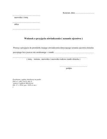 Kościan, dnia ................................... ................................................... nazwisko i imię .................................................. adres .................................................. Wniosek o przyjęcia oświadczenia ( uznanie ojcostwa ) Proszę o przyjęcie do protokółu mojego oświadczenia dotyczącego uznania ojcostwa dziecka poczętego lecz jeszcze nie urodzonego z matki ......................................................................... ......................................................................................................................................... ( imię – imiona , nazwisko i nazwisko rodowe matki dziecka ) ................................................... podpis Zwolnione z opłaty skarbowej na podst. Zał cz.l., pkt2, kol.4, pkt 2) ustawy o opłacie Skarbowej (Dz. U. z 2014, poz. 1628 ze zm.) )