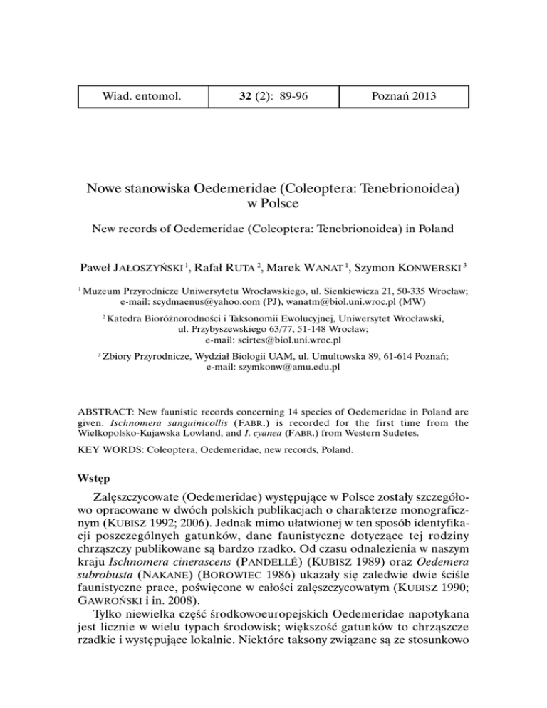 Wiad. entomol. 32 (2): 89-96 Poznań 2013 Nowe stanowiska Oedemeridae (Coleoptera: Tenebrionoidea) w Polsce New records of Oedemeridae (Coleoptera: Tenebrionoidea) in Poland Paweł JAŁOSZYŃSKI 1, Rafał RUTA 2, Marek WANAT 1, Szymon KONWERSKI 3 1 Muzeum Przyrodnicze Uniwersytetu Wrocławskiego, ul. Sienkiewicza 21, 50-335 Wrocław; e-mail: [email protected] (PJ), [email protected] (MW) 2 3 Katedra Bioróżnorodności i Taksonomii Ewolucyjnej, Uniwersytet Wrocławski, ul. Przybyszewskiego 63/77, 51-148 Wrocław; e-mail: [email protected] Zbiory Przyrodnicze, Wydział Biologii UAM, ul. Umultowska 89, 61-614 Poznań; e-mail: [email protected] ABSTRACT: New faunistic records concerning 14 species of Oedemeridae in Poland are given. Ischnomera sanguinicollis (FABR .) is recorded for the first time from the Wielkopolsko-Kujawska Lowland, and I. cyanea (F ABR.) from Western Sudetes. KEY WORDS: Coleoptera, Oedemeridae, new records, Poland. Wstęp Zalęszczycowate (Oedemeridae) występujące w Polsce zostały szczegółowo opracowane w dwóch polskich publikacjach o charakterze monograficznym (KUBISZ 1992; 2006). Jednak mimo ułatwionej w ten sposób identyfikacji poszczególnych gatunków, dane faunistyczne dotyczące tej rodziny chrząszczy publikowane są bardzo rzadko. Od czasu odnalezienia w naszym kraju Ischnomera cinerascens (P ANDELLÉ ) (KUBISZ 1989) oraz Oedemera subrobusta (NAKANE) (BOROWIEC 1986) ukazały się zaledwie dwie ściśle faunistyczne prace, poświęcone w całości zalęszczycowatym (KUBISZ 1990; GAWROŃSKI i in. 2008). Tylko niewielka część środkowoeuropejskich Oedemeridae napotykana jest licznie w wielu typach środowisk; większość gatunków to chrząszcze rzadkie i występujące lokalnie. Niektóre taksony związane są ze stosunkowo 90 P. JAŁOSZYŃSKI, R. RUTA, M. WANAT, SZ. KONWERSKI mało przekształconymi, naturalnymi siedliskami. Wynikająca z tego faktu indykacyjna wartość zalęszczycowatych została ostatnimi laty dostrzeżona i wykorzystana w badaniach terenów o szczególnych walorach przyrodniczych (B YK 2007; BYK i in. 2006; KONWERSKI 1999; KONWERSKI, S IENKIEWICZ 2010; RUTKIEWICZ 2007). Jeden z gatunków znalazł się nawet w polskiej czerwonej księdze zwierząt (KUBISZ 2004). Ze względu na bardzo fragmentaryczny stopień zbadania tej grupy chrząszczy, wszelkie nowe znaleziska powinny zostać odnotowane w literaturze, a pełniejsze poznanie ich wymagań siedliskowych może znacząco pomóc w dalszej waloryzacji interesujących obszarów. Poniżej podajemy nowe stanowiska występowania piętnastu spośród dwudziestu czterech gatunków zalęszczycowatych, wykazanych dotychczas z terytorium Polski. O ile nie zaznaczono inaczej, okazy dowodowe zdeponowane są w kolekcjach autorów (oznaczonych inicjałami): MW – Marek WANAT; PJ – Paweł JAŁOSZYŃSKI; RR – Rafał RUTA; SK – Szymon K ONWERSKI). Skrót ZPK oznacza zespół przyrodniczo-krajobrazowy. Część danych została podana na podstawie materiałów odłowionych przez Bartłomieja P ACUKA, Andrzeja JADWISZCZAKA, Jacka K URZAWĘ, Rafała KONDRATA, Roberta ROSĘ, Urszulę WALCZAK oraz Katarzynę ŻUK, którym dziękujemy za przekazanie informacji lub okazów. Wykaz gatunków Calopus serraticornis (LINNAEUS, 1758) – Pojezierze Pomorskie: Pilchowo (UTM: VV62) ad Szczecin, 1 V 2011 – 1 ex., brzeg lasu sosnowego, na ścianie budynku, leg. et coll. R. K ONDRAT; Dobrzyca vic. (XU29), IV 2005 – 1% ad lucem, leg. R. ROSA (coll. RR). – Nizina Wielkopolsko-Kujawska: Poznań (XU30), 24 IV 1995 – 1 & na murze, leg. PJ. – Wyżyna Małopolska: Wierzeje ad Piotrków Trybunalski (DB19), 10 IV 1985 – 1%, ad lucem, leg. J. KURZAWA (coll. MW). Gatunek rzadko obserwowany ze względu na skryty tryb życia imagines (K UBISZ 2006). Ostatnio łowiony w Górach Świętokrzyskich (BIDAS, BUCH HOLZ 2007; B YK 2007; RUTKIEWICZ 2007) i Pieninach (GAWROŃSKI i in. 2008). Anogcodes ustulatus (SCOPOLI, 1763) [=ferrugineus (SCHRANK , 1776)] – Nizina Wielkopolsko-Kujawska: Toruń - Śródmieście (CD37), 1999 – 1&, leg. PJ; Toruń - Stawki (CD37), dworzec PKP Toruń Główny, 24 V 2011 – 1&, na schodach w przejściu podziemnym, leg. et coll. B. P ACUK; Poznań NOWE STANOWISKA OEDEMERIDAE W POLSCE 91 (XU31), 6 VI 1998 – 1%, 18 VI 2005 – 1 %, leg. PJ; Piła (XU19), Park Miejski, 25 V 1999 – 1 ex., leg. RR. – Wyżyna Małopolska: Rogów (DC24) ad Koluszki, 30 VI 1976 – 1&, leg. MW. Gatunek spotykany niezbyt często, niedawno podany z Pojezierza Mazurskiego i Niziny Wielkopolsko-Kujawskiej (GAWROŃSKI i in. 2008). Regularnie obserwowany na terenach zurbanizowanych i w miastach (KUBISZ 2006), co potwierdzają powyższe stanowiska z Torunia, Piły i Poznania. Anogcodes melanurus (FABRICIUS, 1787) [=ustulatus (FABRICIUS , 1787)] – Pojezierze Pomorskie: Wieleń Pomorski (VW22), lato 1994 – 1&, leg. et coll. R. K ONDRAT. – Nizina Wielkopolsko-Kujawska: Włocławek, ogrody działkowe (CD63), 6 VII 1993 – 1&, 19 VII 1993 – 1& , 7 VII 1994 – 2&&, 1%, leg. PJ; Promno (XU51) ad Poznań, 18 VII 1998 – 1% , leg. PJ; Pobiel (XT20), 6 VII 2000 – 1%, leg. K. ŻUK, (coll. RR); Lusowo (XU11) ad Poznań, 23 VII 1997 – 1 ex., N brzeg Jez. Lusowskiego, na baldachach, leg. SK; Biedrusko vic. (XU32), poligon wojskowy, 23 VII 1999 – 1 ex., na roślinności wokół stawu, leg. SK. – Nizina Mazowiecka: Puszcza Bolimowska, Grabie (DC46), 25–31 VII 1994 – 2&&, 1–11 VIII 1994 – 1% , leg. MW; Głuchów (DC33) ad Skierniewice, 25 VII 1976 – 1% , leg. MW. – Puszcza Białowieska: Białowieża (FD94), żwirownia, 12 VII 1986 – 1% , 16 VI 1991 – 1%; 5 VI 1998 – 1%, przy stacji kolejowej, leg. MW. Gatunek uznawany za dość rzadki (KUBISZ 2006). Anogcodes rufiventris (SCOPOLI, 1763) – Pobrzeże Bałtyku: Bobolin vic. (WA82) ad Koszalin, 2 VII 2008 – 2 exx., na wyrzuconej przez morze kłodzie, leg. SK. – Beskid Wschodni: Góry Słonne, rezerwat „Góra Sobień” vic. (EV98), 24 VI 