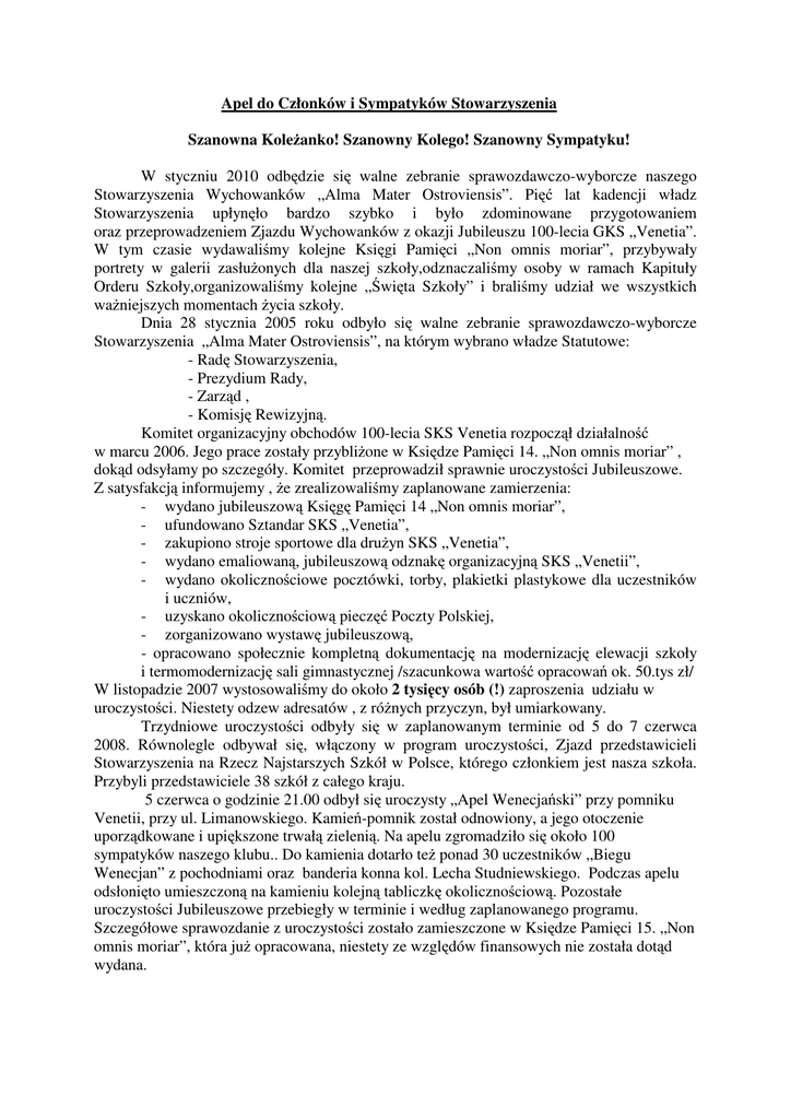 Apel do Członków i Sympatyków Stowarzyszenia Szanowna Koleżanko! Szanowny Kolego! Szanowny Sympatyku! W styczniu 2010 odbędzie się walne zebranie sprawozdawczo-wyborcze naszego Stowarzyszenia Wychowanków „Alma Mater Ostroviensis”. Pięć lat kadencji władz Stowarzyszenia upłynęło bardzo szybko i było zdominowane przygotowaniem oraz przeprowadzeniem Zjazdu Wychowanków z okazji Jubileuszu 100-lecia GKS „Venetia”. W tym czasie wydawaliśmy kolejne Księgi Pamięci „Non omnis moriar”, przybywały portrety w galerii zasłużonych dla naszej szkoły,odznaczaliśmy osoby w ramach Kapituły Orderu Szkoły,organizowaliśmy kolejne „Święta Szkoły” i braliśmy udział we wszystkich ważniejszych momentach życia szkoły. Dnia 28 stycznia 2005 roku odbyło się walne zebranie sprawozdawczo-wyborcze Stowarzyszenia „Alma Mater Ostroviensis”, na którym wybrano władze Statutowe: - Radę Stowarzyszenia, - Prezydium Rady, - Zarząd , - Komisję Rewizyjną. Komitet organizacyjny obchodów 100-lecia SKS Venetia rozpoczął działalność w marcu 2006. Jego prace zostały przybliżone w Księdze Pamięci 14. „Non omnis moriar” , dokąd odsyłamy po szczegóły. Komitet przeprowadził sprawnie uroczystości Jubileuszowe. Z satysfakcją informujemy , że zrealizowaliśmy zaplanowane zamierzenia: - wydano jubileuszową Księgę Pamięci 14 „Non omnis moriar”, - ufundowano Sztandar SKS „Venetia”, - zakupiono stroje sportowe dla drużyn SKS „Venetia”, - wydano emaliowaną, jubileuszową odznakę organizacyjną SKS „Venetii”, - wydano okolicznościowe pocztówki, torby, plakietki plastykowe dla uczestników i uczniów, - uzyskano okolicznościową pieczęć Poczty Polskiej, - zorganizowano wystawę jubileuszową, - opracowano społecznie kompletną dokumentację na modernizację elewacji szkoły i termomodernizację sali gimnastycznej /szacunkowa wartość opracowań ok. 50.tys zł/ W listopadzie 2007 wystosowaliśmy do około 2 tysięcy osób (!) zaproszenia udziału w uroczystości. Niestety odzew adresatów , z różnych przyczyn, był umiarkowany. Trzydniowe uroczystości odbyły się w zaplanowanym terminie od 5 do 7 czerwca 2008. Równolegle odbywał się, włączony w program uroczystości, Zjazd przedstawicieli Stowarzyszenia na Rzecz Najstarszych Szkół w Polsce, którego członkiem jest nasza szkoła. Przybyli przedstawiciele 38 szkół z całego kraju. 5 czerwca o godzinie 21.00 odbył się uroczysty „Apel Wenecjański” przy pomniku Venetii, przy ul. Limanowskiego. Kamień-pomnik został odnowiony, a jego otoczenie uporządkowane i upiększone trwałą zielenią. Na apelu zgromadziło się około 100 sympatyków naszego klubu.. Do kamienia dotarło też ponad 30 uczestników „Biegu Wenecjan” z pochodniami oraz banderia konna kol. Lecha Studniewskiego. Podczas apelu odsłonięto umieszczoną na kamieniu kolejną tabliczkę okolicznościową. Pozostałe uroczystości Jubileuszowe przebiegły w terminie i według zaplanowanego programu. Szczegółowe sprawozdanie z uroczystości zostało zamieszczone w Księdze Pamięci 15. „Non omnis moriar”, która już opracowana, niestety ze względów finansowych nie została dotąd wydana. Pokładamy nadzieję, że zorganizowany Zjazd Jubileuszowy spełnił swoje założenia i przyniesie ożywienie sportowe w szkole oraz wzmocni więzy Absolwentów,Wychowanków i Sympatyków ze szkołą. Czujemy się w obowiązku przestawić „smutki” pozostałe po zorganizowaniu Zjazdu. Głównie jest to zadłużenie finansowe na kwotę ok. 15. 000 zł po jego zakończeniu. Obecnie, dzięki naszym intensywnym staraniom, dług zmalał do 8.000 zł. Jest to należność za wydanie Jubileuszowej Księgi Pamięci 14. dla drukarni Kol.Piotra Kalusińskiego /absolwenta naszej szkoły/ .Dziękujemy Kol. Piotrowi za wyrozumiałość. Powyższa kwota jest długiem honorowym Stowarzyszenia . Czyżby dług wyniknął z nieumiejętności przewidywania wydatków i niefrasobliwego ich wydatkowania? Wszelkie możliwe prace organizacyjne wykonywane były społecznie, przy dużym zaangażowaniu własnych środków finansowych części członków komitetu organizacyjnego. Zawiedliśmy się prawie całkowicie na przewidywanych subwencjach władz, poza skromnymi kwotami uzyskanymi od Prezydenta Miasta (szkoła podlega władzom powiatowym) i 1000 zł dotacji Wojewody Wielkopolskiego. Zakładaliśmy, wysyłając odpowiednie wnioski i prośby oraz zapraszając do współudziału w obchodach, że 100-lecie najstarszego szkolnego klubu sportowego w Polsce, znajdzie należne zainteresowanie i poparcie finansowe. Niestety, nie uzyskaliśmy tego w Ministerstwie Sportu, ani u Marszałka Województwa, ani innych podmiotów. Złożyliśmy odpowiedni wniosek do tzw. „funduszu grantowego”, opiewający na 20 tysięcy złotych na druk Księgi Pamięci 14. Nie uzyskaliśmy ani złotówki.Z przykrością musimy poinformować Koleżeństwo,że przykładowo Jubileusz 100-lecia „Ostrovii” w 2009 roku został dofinansowany przez władze samorządowe Ostrowa kwotą kilkudziesięciu tysięcy zł. Widocznie są w dzisiejszej rzeczywistości równi i równiejsi /jak u Orwella/. Okazjonalnymi, zdawkowymi listami gratulacyjnymi, nie możemy niestety zapłacić zobowiązań.. Mimo poparcia Starosty sprawy modernizacji elewacji szkoły i sali gimnastycznej „utknęły” u Marszałka Województwa i w Ministerstwie Kultury (szkoła jest w rejestrze zabytków). Gwoli prawdy radością napawa wykonane przez Urząd Miasta podświetlenie budynku szkolnego. Wobec zbliżających się wyborów czujemy się w obowiązku zostawić nowym władzom stowarzyszenia tak zwane „czyste konto”. Przy każdej okazji prosiliśmy naszych członków o regularne wpłacanie składki członkowskiej, która wynosi dwa złote na miesiąc. Zmuszeni jesteśmy przedstawić bolesną dla nas sprawę honorowego długu naszych członków wobec stowarzyszenia. Na dzień dzisiejszy 