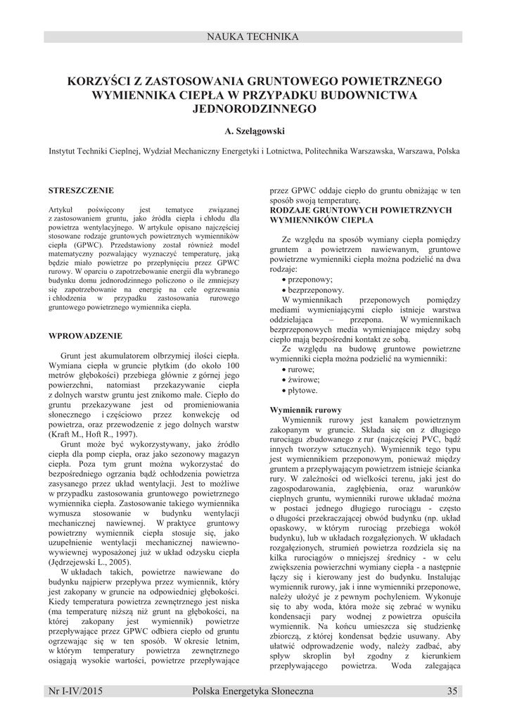NAUKA TECHNIKA KORZYŚCI Z ZASTOSOWANIA GRUNTOWEGO POWIETRZNEGO WYMIENNIKA CIEPŁA W PRZYPADKU BUDOWNICTWA JEDNORODZINNEGO A. Szelągowski Instytut Techniki Cieplnej, Wydział Mechaniczny Energetyki i Lotnictwa, Politechnika Warszawska, Warszawa, Polska STRESZCZENIE Artykuł poświęcony jest tematyce związanej z zastosowaniem gruntu, jako źródła ciepła i chłodu dla powietrza wentylacyjnego. W artykule opisano najczęściej stosowane rodzaje gruntowych powietrznych wymienników ciepła (GPWC). Przedstawiony został również model matematyczny pozwalający wyznaczyć temperaturę, jaką będzie miało powietrze po przepłynięciu przez GPWC rurowy. W oparciu o zapotrzebowanie energii dla wybranego budynku domu jednorodzinnego policzono o ile zmniejszy się zapotrzebowanie na energię na cele ogrzewania i chłodzenia w przypadku zastosowania rurowego gruntowego powietrznego wymiennika ciepła. WPROWADZENIE Grunt jest akumulatorem olbrzymiej ilości ciepła. Wymiana ciepła w gruncie płytkim (do około 100 metrów głębokości) przebiega głównie z górnej jego powierzchni, natomiast przekazywanie ciepła z dolnych warstw gruntu jest znikomo małe. Ciepło do gruntu przekazywane jest od promieniowania słonecznego i częściowo przez konwekcję od powietrza, oraz przewodzenie z jego dolnych warstw (Kraft M., Hoft R., 1997). Grunt może być wykorzystywany, jako źródło ciepła dla pomp ciepła, oraz jako sezonowy magazyn ciepła. Poza tym grunt można wykorzystać do bezpośredniego ogrzania bądź ochłodzenia powietrza zasysanego przez układ wentylacji. Jest to możliwe w przypadku zastosowania gruntowego powietrznego wymiennika ciepła. Zastosowanie takiego wymiennika wymusza stosowanie w budynku wentylacji mechanicznej nawiewnej. W praktyce gruntowy powietrzny wymiennik ciepła stosuje się, jako uzupełnienie wentylacji mechanicznej nawiewnowywiewnej wyposażonej już w układ odzysku ciepła (Jędrzejewski L., 2005). W układach takich, powietrze nawiewane do budynku najpierw przepływa przez wymiennik, który jest zakopany w gruncie na odpowiedniej głębokości. Kiedy temperatura powietrza zewnętrznego jest niska (ma temperaturę niższą niż grunt na głębokości, na której zakopany jest wymiennik) powietrze przepływające przez GPWC odbiera ciepło od gruntu ogrzewając się w ten sposób. W okresie letnim, w którym temperatury powietrza zewnętrznego osiągają wysokie wartości, powietrze przepływające Nr I-IV/2015 przez GPWC oddaje ciepło do gruntu obniżając w ten sposób swoją temperaturę. RODZAJE GRUNTOWYCH POWIETRZNYCH WYMIENNIKÓW CIEPŁA Ze względu na sposób wymiany ciepła pomiędzy gruntem a powietrzem nawiewanym, gruntowe powietrzne wymienniki ciepła można podzielić na dwa rodzaje: · przeponowy; · bezprzeponowy. W wymiennikach przeponowych pomiędzy mediami wymieniającymi ciepło istnieje warstwa oddzielająca – przepona. W wymiennikach bezprzeponowych media wymieniające między sobą ciepło mają bezpośredni kontakt ze sobą. Ze względu na budowę gruntowe powietrzne wymienniki ciepła można podzielić na wymienniki: · rurowe; · żwirowe; · płytowe. Wymiennik rurowy Wymiennik rurowy jest kanałem powietrznym zakopanym w gruncie. Składa się on z długiego rurociągu zbudowanego z rur (najczęściej PVC, bądź innych tworzyw sztucznych). Wymiennik tego typu jest wymiennikiem przeponowym, ponieważ między gruntem a przepływającym powietrzem istnieje ścianka rury. W zależności od wielkości terenu, jaki jest do zagospodarowania, zagłębienia, oraz warunków cieplnych gruntu, wymienniki rurowe układać można w postaci jednego długiego rurociągu - często o długości przekraczającej obwód budynku (np. układ opaskowy, w którym rurociąg przebiega wokół budynku), lub w układach rozgałęzionych. W układach rozgałęzionych, strumień powietrza rozdziela się na kilka rurociągów o mniejszej średnicy - w celu zwiększenia powierzchni wymiany ciepła - a następnie łączy się i kierowany jest do budynku. Instalując wymiennik rurowy, jak i inne wymienniki przeponowe, należy ułożyć je z pewnym pochyleniem. Wykonuje się to aby woda, która może się zebrać w wyniku kondensacji pary wodnej z powietrza opuściła wymiennik. Na końcu umieszcza się studzienkę zbiorczą, z której kondensat będzie usuwany. Aby ułatwić odprowadzenie wody, należy zadbać, aby spływ skroplin był zgodny z kierunkiem przepływającego powietrza. Woda zalegająca Polska Energetyka Słoneczna 35 NAUKA TECHNIKA w rurociągu przez dłuższy czas może powodować spadek jakości powietrza nawiewanego do budynku. Dla zapewnienia czystości powierzchni rurociągu na czerpni stosuje się wysokiej klasy filtry. Wymiennik żwirowy Wymiennik żwirowy jest bezprzeponowym wymiennikiem ciepła, w którym powietrze przepływa przez złoże o dużej granulacji. Materiał, z którego wykonane jest złoże musi być nienasiąkliwy, mieć dobrą przewodność i dużą pojemność cieplną. Po za tym powinien mieć kształt, który nie będzie powodował dużych oporów przepływu powietrza, najlepiej zbliżony do kształtu kuli. Jako materiał, z którego wykonane jest złoże wymiennika, najczęściej stosuje się płukany żwir, o dużej granulacji. Takie złoże ma dużą powierzchnię kontaktu i wymiany ciepła z powietrzem nawiewanym. Złoże wymiennika żwirowego działa również jako filtr powietrza. Wymiennik ten zajmuje małą powierzchnię jednak istotną rolę odgrywa prawidłowy dobór wielkości złoża do strumienia powietrza. Wymiennik żwirowy nie nadaje się do pracy ciągłej, ponieważ po pewnym czasie następuje zrównanie temperatury złoża z temperaturą powietrza nawiewanego. Wtedy musi nastąpić jego regeneracja, poprzez wyłączenie go z użycia. Złoże samoistnie się zregeneruje pobierając ciepło z otaczającego gruntu. Można zapewnić ciągłą pracę wymiennika stosując dwa oddzielne złoża pracujące 