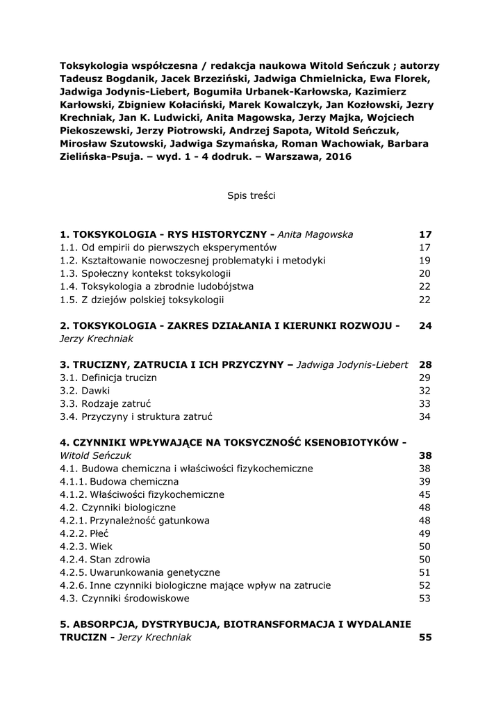 Toksykologia współczesna / redakcja naukowa Witold Seńczuk ; autorzy Tadeusz Bogdanik, Jacek Brzeziński, Jadwiga Chmielnicka, Ewa Florek, Jadwiga Jodynis-Liebert, Bogumiła Urbanek-Karłowska, Kazimierz Karłowski, Zbigniew Kołaciński, Marek Kowalczyk, Jan Kozłowski, Jezry Krechniak, Jan K. Ludwicki, Anita Magowska, Jerzy Majka, Wojciech Piekoszewski, Jerzy Piotrowski, Andrzej Sapota, Witold Seńczuk, Mirosław Szutowski, Jadwiga Szymańska, Roman Wachowiak, Barbara Zielińska-Psuja. – wyd. 1 - 4 dodruk. – Warszawa, 2016 Spis treści 1. TOKSYKOLOGIA - RYS HISTORYCZNY - Anita Magowska 1.1. Od empirii do pierwszych eksperymentów 1.2. Kształtowanie nowoczesnej problematyki i metodyki 1.3. Społeczny kontekst toksykologii 1.4. Toksykologia a zbrodnie ludobójstwa 1.5. Z dziejów polskiej toksykologii 17 17 19 20 22 22 2. TOKSYKOLOGIA - ZAKRES DZIAŁANIA I KIERUNKI ROZWOJU Jerzy Krechniak 24 3. TRUCIZNY, ZATRUCIA I ICH PRZYCZYNY – Jadwiga Jodynis-Liebert 3.1. Definicja trucizn 3.2. Dawki 3.3. Rodzaje zatruć 3.4. Przyczyny i struktura zatruć 28 29 32 33 34 4. CZYNNIKI WPŁYWAJĄCE NA TOKSYCZNOŚĆ KSENOBIOTYKÓW Witold Seńczuk 4.1. Budowa chemiczna i właściwości fizykochemiczne 4.1.1. Budowa chemiczna 4.1.2. Właściwości fizykochemiczne 4.2. Czynniki biologiczne 4.2.1. Przynależność gatunkowa 4.2.2. Płeć 4.2.3. Wiek 4.2.4. Stan zdrowia 4.2.5. Uwarunkowania genetyczne 4.2.6. Inne czynniki biologiczne mające wpływ na zatrucie 4.3. Czynniki środowiskowe 38 38 39 45 48 48 49 50 50 51 52 53 5. ABSORPCJA, DYSTRYBUCJA, BIOTRANSFORMACJA I WYDALANIE TRUCIZN - Jerzy Krechniak 55 5.1. Wprowadzenie 5.2. Mechanizmy transportu przez błony komórkowe 5.3. Wchłanianie 5.3.1. Wchłanianie przez skórę 5.3.2. Wchłanianie przez układ oddechowy 5.3.3. Wchłanianie z przewodu pokarmowego 5.3.4. Inne drogi wchłaniania 5.4. Rozmieszczenie trucizn 5.4.1. Przenikanie przez bariery wewnątrzustrojowe 5.4.2. Wiązanie przez białka osocza 5.4.3. Wiązanie przez białka narządów 5.4.4. Kumulacja w tkance tłuszczowej 5.4.5. Kumulacja w tkance kostnej 5.5. Wydalanie trucizn 5.5.1. Wydalanie z moczem 5.5.2. Wydalanie z żółcią 5.5.3. Wydalanie z powietrzem 5.5.4. Wydalanie innymi drogami 5.6. Biotransformacja trucizn 5.6.1. Mikrosomalne reakcje oksydacyjno-redukcyjne 5.6.2. Pozamikrosomalne reakcje oksydacyjno-redukcyjne 5.6.3. Reakcje hydrolizy 5.6.4. Reakcja sprzęgania 5.6.5. Czynniki wpływające na biotransformację 5.6.6. Indukcja i inhibicja enzymów mikrosomalnych 5.7. Podstawy toksykokinetyki 55 57 63 64 67 72 76 76 79 82 85 86 87 88 88 92 94 94 96 102 115 117 119 136 139 141 6. INTERAKCJE KSENOBIOTYKÓW - Barbara Zielińska-Psuja 6.1. Wprowadzenie 6.2. Rozważania teoretyczne i modele stosowane w ocenie interakcji ksenobiotyków 6.2.1. Jakościowe aspekty interakcji ksenobiotyków 6.2.2. Podstawy teoretyczne i modele ilościowe 6.3. Modele doświadczalne i kierunki badań działania łącznego ksenobiotyków 6.4. Mechanizmy odpowiedzialne za występowanie zjawiska interakcji (wybrane przykłady) 6.4.1. Udział systemu oksydaz funkcji mieszanej w procesie występowania interakcji 6.4.2. Utlenianie ksenobiotyków za pośrednictwem syntetazy prostaglandyny H (PHS) 6.4.3. Interakcje leków 6.4.4. Potencjacja hepato- i nefrotoksyczności indukowanej haloalkanami 6.4.5. Narażenie wieloskładnikowe w środowisku pracy 6.5. Podsumowanie 154 154 155 155 158 167 170 170 172 173 185 186 189 7. MECHANIZMY DZIAŁANIA TOKSYCZNEGO - Mirosław M. Szutowski 7.1. Ksenobiotyk w sprawnie funkcjonującym organizmie 7.2. Znaczenie reaktywności substancji chemicznych w przebiegu zatrucia 7.3. Znaczenie procesów biotransformacji w przebiegu zatrucia 7.3.1. Stres oksydacyjny 7.4. Współzależność różnych procesów w powstawaniu efektu toksycznego 7.5. Interakcje z endogennymi cząsteczkami docelowymi 7.5.1. Interakcje z materiałem genetycznym 7.5.2. Haptenizacja białek 7.6. Zaburzenia w funkcjonowaniu komórek 7.6.1. Wpływ na procesy transkrypcji 7.6.2. Wpływ na procesy przekazywania sygnału 7.6.3. Modulacja stężenia cząsteczek sygnalizujących 7.7. Zaburzenia aktywności komórkowej 7.7.1. Zaburzenia aktywności komórek pobudzanych impulsami elektrycznymi 7.7.2. Zaburzenia aktywności pozostałych komórek 7.8. Toksyczne uszkodzenie czynności życiowych komórki 7.9. Niewydolność procesów naprawczych 191 191 192 193 193 194 196 197 199 200 200 201 202 202 8. TOKSYKOMETRIA - Jadwiga Jodynis-Liebert, Witold Seńczuk 8.1. Cel badań 8.2. Kierunki badań 8.3. Zależność dawka-efekt i dawka-odpowiedź 8.4. Kryteria decydujące o podjęciu badań toksykometrycznych i ich zakresie 8.5. Zakres badań 8.6. Drogi narażenia 8.7. Zwierzęta doświadczalne 8.8. Badanie toksyczności doustnej 8.8.1. Badanie toksyczności ostrej 8.8.2. Zastosowanie metod in vitro do oceny toksyczności ostrej 8.8.3. Badanie toksyczności kumulacyjnej i wyznaczanie współczynnika kumulacji 8.8.4. Badanie toksyczności podostrej (test 28-dniowy) 8.8.5. Badanie toksyczności podprzewlekłej (test 90-dniowy) 8.8.6. Badanie toksyczności przewlekłej (test 2-letni) 8.9. Badanie toksyczności inhalacyjnej 8.9.1. Badanie toksyczności ostrej drogą inhalacyjną 8.9.2. Badanie toksyczności inhalacyjnej wywołanej powtarzanym dawkowaniem 8.10. Badanie toksyczności skórnej 8.10.1. Badanie ostrej toksyczności skórnej 8.10.2. Badanie toksyczności skórnej wywołanej powtarzanym 208 209 209 210 202 204 205 206 216 217 218 219 221 221 224 226 227 227 230 231 233 233 234 235 dawkowaniem 8.10.3. Badanie ostrego, drażniącego/żrącego działania na skórę 8.10.4. Badanie ostrego działania drażniącego lub uszkadzającego oko 8.11. Badanie działania uczulającego 8.12. Ocena genotoksyczności 8.13. Badanie działania rakotwórczego 8.14. Badanie działania teratogennego 8.15. Badanie toksycznego wpływu na płodność, rozrodczość i potomstwo 8.16. Badanie opóźnionego działania neurotoksycznego 8.17. Op