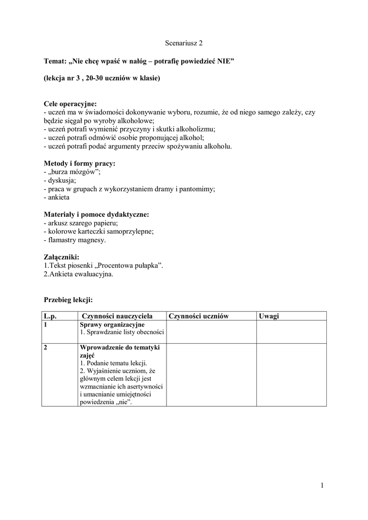 Scenariusz 2 Temat: „Nie chcę wpaść w nałóg – potrafię powiedzieć NIE” (lekcja nr 3 , 20-30 uczniów w klasie) Cele operacyjne: - uczeń ma w świadomości dokonywanie wyboru, rozumie, że od niego samego zależy, czy będzie sięgał po wyroby alkoholowe; - uczeń potrafi wymienić przyczyny i skutki alkoholizmu; - uczeń potrafi odmówić osobie proponującej alkohol; - uczeń potrafi podać argumenty przeciw spożywaniu alkoholu. Metody i formy pracy: - „burza mózgów”; - dyskusja; - praca w grupach z wykorzystaniem dramy i pantomimy; - ankieta Materiały i pomoce dydaktyczne: - arkusz szarego papieru; - kolorowe karteczki samoprzylepne; - flamastry magnesy. Załączniki: 1.Tekst piosenki „Procentowa pułapka”. 2.Ankieta ewaluacyjna. Przebieg lekcji: L.p. Czynności nauczyciela 1 Sprawy organizacyjne 1. Sprawdzanie listy obecności 2 Wprowadzenie do tematyki zajęć 1. Podanie tematu lekcji. 2. Wyjaśnienie uczniom, że głównym celem lekcji jest wzmacnianie ich asertywności i umacnianie umiejętności powiedzenia „nie”. Czynności uczniów Uwagi 1 3 Uczniowie metodą „burzy mózgów” zapisują odpowiedzi na karteczkach. (osobno na każde polecenie).Następnie jedna osoba zbiera karteczki i uzupełnia tabelę. Mogą pojawić się odpowiedzi typu: 1. Przyczyny picia alkoholu: - udział w imprezach na których wszyscy piją; - dla odwagi; - „ucieczka od problemów” - „bo lubię” - nawyk, przyzwyczajenie; - „rozładowanie stresów” itp. 2. Skutki alkoholizmu: 2. Dyskusja na temat przyczyn choroby wątroby, układu i skutków alkoholizmu. pokarmowego, układu krążenia ,nerwice, agresywne zachowanie się, utrata pracy, przerwanie nauki, rozwody, wpadki drogowe, przestępstwa itp. Część główna lekcji 1. Nauczyciel wiesza na tablicy arkusz z nieuzupełnioną tabelą: przyczyny i skutki spożywania alkoholu. Polecenie dla uczniów: - wymień przyczyny spożywania alkoholu; - wymień skutki spożywania alkoholu. 2 3. Pytania nauczyciela na temat różnych sposobów reagowania w danych sytuacjach: - Czy odmowa wypicia alkoholu wiąże się z obawą utraty przyjaciela? Czy tak powinien postąpić ktoś, kogo uważasz za przyjaciela? - Czy każda zabawa powinna być „zakrapiana”? - Czy łatwo nam odmawiać, gdy ktoś częstuje alkoholem? - Dlaczego należy odmawiać? Wypowiedzi uczniów na temat ich zachowania się w różnych sytuacjach. Uczniowie oceniają postępowanie osoby proponującej. Uczniowie powinni dojść do wniosku, że każdy z nich może wyrobić w sobie niezłomne zasady postępowania, nie tracąc przywileju beztroski i dobrej zabawy. Swobodne wypowiedzi uczniów z przytaczaniem konkretnych przykładów. 4. Podział klasy na grupy (grupy 2-3 osobowe) Zadania dla grup: uczniowie maja przygotować krótkie scenki: I Kolega usilnie namawia aby pójść z nim po lekcjach na piwo Jak mu odmówić? (drama) II Jak zachowuje się alkoholik (pantomima) III Pokaż skutki nadużywania alkoholu dla nałogowca i jego bliskich (pantomima) IV jak pomóc osobie, która postanowiła wyjść z nałogu? (drama) 3 V Interpretacja piosenki Procentowa pułapka”. Prezentacja scenek. 4 Ewaluacja Podsumowanie zajęć. Uczniowie wypełniają ankietę dotyczącą przeprowadzonej lekcji. „ Tekst piosenki „ Procentowa pułapka” - załącznik nr 1. Ankieta ewaluacyjna - załącznik nr 2. Załącznik nr 1 „Procentowa pułapka” (na melodię piosenki „Samba turystyczna”) Źródło: festiwal piosenki nieuzależnionej „Nie daj się nałogom, bądź po prostu sobą”, 1. Rzecz zaczyna się niewinnie – małe piwko – tak jak w filmie, lampka wina z barku taty, już masz niezłe tarapaty. W alkoholu wpadasz szpony, jesteś nieźle umoczony! Bo w nim taka drzemie siła - gdy się wciągniesz, to mogiła! 2. Żłopiesz wino marki „wino”, już rozstałeś się z dziewczyną. Potem wóda, denaturat… Nos sinieje, więdnie skóra. Oczy robią się przekrwione, nogi, ręce roztrzęsione. Zwykłym żulem wkrótce będziesz, człowieczeństwa się pozbędziesz! 3. W alkoholu moc jest taka, że wnet zmieni cię w pijaka. Gdy procenty najważniejsze tracisz to, co najcenniejsze: i przyjaciół, i rodzinę, pracę, kasę, dobrą minę. Dla kieliszka tylko żyjesz, Nic nie robisz tylko pijesz! 4. Nie kombinuj, odpuść sobie – szanuj życie swe i zdrowie. Chwilę będzie ci jak w niebie, potem szybko przegrasz siebie! 4 Nie kombinuj, odpuść sobie – szanuj życie swe i zdrowie. Chwilę będzie ci jak w niebie, potem szybko przegrasz siebie! Załącznik nr 2 Ankieta ewaluacyjna do lekcji na temat: ,, Nie chce wpaść w nałóg – potrafię powiedzieć „Nie” Wybrane odpowiedzi zakreśl kółkiem. 1. Czy na dzisiejszej lekcji poszerzyłeś wiedzę na temat uzależnieo od alkoholu? TAK NIE 2. Czy sposób prowadzenia zajęd zmotywował Cię do aktywnej pracy na lekcji? TAK NIE 3. Czy jesteś świadomy, że masz prawo do wyboru w podjęciu decyzji czy sięgniesz po alkohol? TAK NIE 4. Czy na zajęciach panowała przyjazna atmosfera? TAK NIE 5. Czy masz uwagi dotyczące lekcji? ……………………………………………………………………………………………………………………………………………… ……………………………………………………………………………………………………………………………………………… ……………………………………………………………………………………………………………………………………………… Źródło: Scenariusze lekcji wychowawczych poświęconych problematyce zapobiegania i zwalczania przejawów patologii społecznej wśród dzieci i młodzieży (alkoholizmu i nikotynizmu – szkoły ponadgimnazjalne), autor Agnieszka Zamojć, Zeszyt metodyczny RODoN 3/2009 , Radomski Ośrodek Doskonalenia Nauczycieli 5