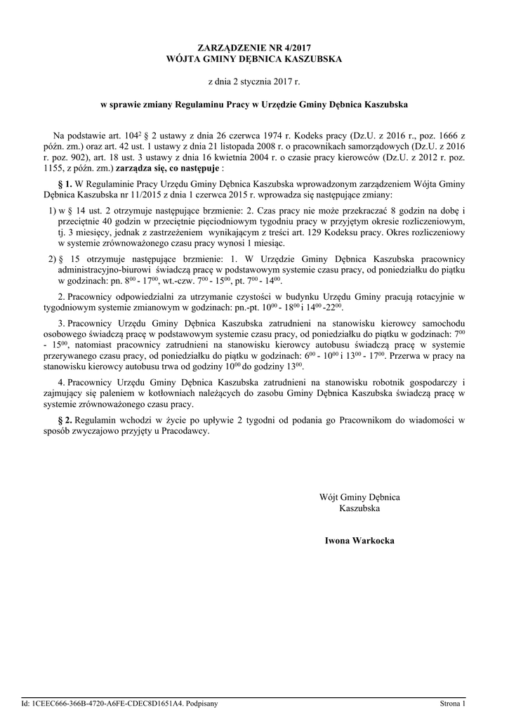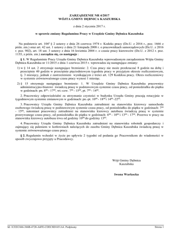 ZARZĄDZENIE NR 4/2017 WÓJTA GMINY DĘBNICA KASZUBSKA z dnia 2 stycznia 2017 r. w sprawie zmiany Regulaminu Pracy w Urzędzie Gminy Dębnica Kaszubska Na podstawie art. 1042 § 2 ustawy z dnia 26 czerwca 1974 r. Kodeks pracy (Dz.U. z 2016 r., poz. 1666 z późn. zm.) oraz art. 42 ust. 1 ustawy z dnia 21 listopada 2008 r. o pracownikach samorządowych (Dz.U. z 2016 r. poz. 902), art. 18 ust. 3 ustawy z dnia 16 kwietnia 2004 r. o czasie pracy kierowców (Dz.U. z 2012 r. poz. 1155, z późn. zm.) zarządza się, co następuje : § 1. W Regulaminie Pracy Urzędu Gminy Dębnica Kaszubska wprowadzonym zarządzeniem Wójta Gminy Dębnica Kaszubska nr 11/2015 z dnia 1 czerwca 2015 r. wprowadza się następujące zmiany: 1) w § 14 ust. 2 otrzymuje następujące brzmienie: 2. Czas pracy nie może przekraczać 8 godzin na dobę i przeciętnie 40 godzin w przeciętnie pięciodniowym tygodniu pracy w przyjętym okresie rozliczeniowym, tj. 3 miesięcy, jednak z zastrzeżeniem wynikającym z treści art. 129 Kodeksu pracy. Okres rozliczeniowy w systemie zrównoważonego czasu pracy wynosi 1 miesiąc. 2) § 15 otrzymuje następujące brzmienie: 1. W Urzędzie Gminy Dębnica Kaszubska pracownicy administracyjno-biurowi świadczą pracę w podstawowym systemie czasu pracy, od poniedziałku do piątku w godzinach: pn. 800 - 1700, wt.-czw. 700 - 1500, pt. 700 - 1400. 2. Pracownicy odpowiedzialni za utrzymanie czystości w budynku Urzędu Gminy pracują rotacyjnie w tygodniowym systemie zmianowym w godzinach: pn.-pt. 1000 - 1800 i 1400 -2200. 3. Pracownicy Urzędu Gminy Dębnica Kaszubska zatrudnieni na stanowisku kierowcy samochodu osobowego świadczą pracę w podstawowym systemie czasu pracy, od poniedziałku do piątku w godzinach: 700 - 1500, natomiast pracownicy zatrudnieni na stanowisku kierowcy autobusu świadczą pracę w systemie przerywanego czasu pracy, od poniedziałku do piątku w godzinach: 600 - 1000 i 1300 - 1700. Przerwa w pracy na stanowisku kierowcy autobusu trwa od godziny 1000 do godziny 1300. 4. Pracownicy Urzędu Gminy Dębnica Kaszubska zatrudnieni na stanowisku robotnik gospodarczy i zajmujący się paleniem w kotłowniach należących do zasobu Gminy Dębnica Kaszubska świadczą pracę w systemie zrównoważonego czasu pracy. § 2. Regulamin wchodzi w życie po upływie 2 tygodni od podania go Pracownikom do wiadomości w sposób zwyczajowo przyjęty u Pracodawcy. Wójt Gminy Dębnica Kaszubska Iwona Warkocka Id: 1CEEC666-366B-4720-A6FE-CDEC8D1651A4. Podpisany Strona 1
