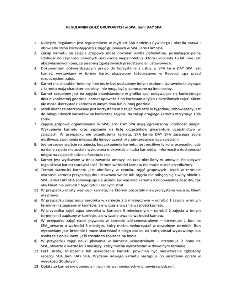 REGULAMIN ZAJĘĆ GRUPOWYCH w SPA_larni DAY SPA 1. Niniejszy Regulamin jest regulaminem w myśl art.384 Kodeksu Cywilnego i określa prawa i obowiązki stron korzystających z zajęć grupowych w SPA_larni DAY SPA. 2. Zakup karnetu na zajęcia grupowe może dokonać osoba pełnoletnia, posiadająca pełną zdolność do czynności prawnych oraz osoba niepełnoletnia, która ukończyła 16 lat i nie jest ubezwłasnowolniona, za pisemną zgodą swoich przedstawicieli ustawowych. 3. Dokumentem potwierdzającym prawo do korzystania z usług w SPA_larni DAY SPA jest karnet, wystawiany w formie karty, okazywany każdorazowo w Recepcji spa przed rozpoczęciem zajęć. 4. Karnet ma charakter imienny i nie może być odstąpiony innym osobom. Uprawnienia płynące z karnetu mają charakter osobisty i nie mogą być przenoszone na inne osoby. 5. Karnet zakupiony jest na zajęcia przedstawione w grafiku spa, odbywające się konkretnego dnia o konkretnej godzinie. Karnet upoważnia do korzystania tylko z określonych zajęć. Klient nie może skorzystać z karnetu w innym dniu lub o innej godzinie. 6. Jeżeli Klient zainteresowany jest korzystaniem z zajęć dwa razy w tygodniu, zobowiązany jest do zakupu dwóch karnetów na konkretne zajęcia. Na zakup drugiego karnetu otrzymuje 10% zniżki. 7. Zajęcia grupowe organizowane w SPA_larni DAY SPA mają ograniczoną liczebność miejsc. Wykupienie karnetu oraz zapisanie na listę uczestników gwarantuje uczestnictwo w zajęciach. W przypadku nie przedłużenia karnetu, SPA_larnia DAY SPA zastrzega sobie możliwość zwolnienia miejsca dla innego uczestnika zainteresowanego zajęciami. 8. Jednorazowe wejście na zajęcia, bez zakupienia karnetu, jest możliwe tylko w przypadku, gdy na dane zajęcia nie została wykupiona maksymalna liczba karnetów. Informacji o dostępności miejsc na zajęciach udziela Recepcja spa. 9. Karnet jest wydawany w dniu zawarcia umowy, na czas określony w umowie. Po upływie tego okresu karnet traci ważność. Termin ważności karnetu nie może zostać przedłużony. 10. Termin ważności karnetu jest określony w cenniku zajęć grupowych. Jeżeli w terminie ważności karnetu przypadają dni ustawowo wolne lub zajęcia nie odbędą się z winy obiektu, SPA_larnia DAY SPA zobowiązuje się przedłużyć ważność karnetu o odpowiednią ilość dni, tak aby klient nie poniósł z tego tytułu żadnych strat. 11. W przypadku utraty ważności karnetu, na którym pozostały niewykorzystane wejścia, klient ma prawo: a) W przypadku zajęć aqua aerobiku w karnecie 2,5 miesięcznym – odrobić 1 zajęcia w innym terminie niż zapisany w karnecie, ale w czasie trwania ważności karnetu. b) W przypadku zajęć aqua aerobiku w karnecie 5 miesięcznym – odrobić 2 zajęcia w innym terminie niż zapisany w karnecie, ale w czasie trwania ważności karnetu. c) W przypadku zajęć nauki pływania w karnecie pół-semestralnym – otrzymuje 1 bon na SPA_otwarte o ważności 3 miesięcy, który można wykorzystać w dowolnym terminie. Bon wystawiany jest imiennie i może skorzystać z niego osoba, na którą został wystawiony, lub osoba ta z opiekunem, jeśli zostało to zapisane na bonie. d) W przypadku zajęć nauki pływania w karnecie semestralnym – otrzymuje 2 bony na SPA_otwarte o ważności 3 miesięcy, który można wykorzystać w dowolnym terminie. 12. Fakt utraty, zniszczenia lub uszkodzenia karnetu powinien być niezwłocznie zgłoszony recepcji SPA_larni DAY SPA. Wydanie nowego karnetu następuje po uiszczeniu opłaty w wysokości 20 złotych. 13. Opłata za karnet nie obejmuje innych niż wymienionych w umowie świadczeń. 14. Opłata za karnet w SPA_larni DAY SPA jest opłatą określoną w umowie i jest uiszczana z góry przed wydaniem karnetu. 15. Wysokość opłaty jest uzależniona od rodzaju karnetu, jaki posiada członek SPA_larni DAY SPA. Wysokość opłaty jest określona przez kierownictwo SPA_larni DAY SPA i podawana do wiadomości w recepcji oraz uwzględniona w umowie. 16. SPA_larnia DAY SPA nie zwraca kosztów poniesionych przy zakupie karnetu z powodu nie uczestniczenia w zajęciach w okresie ważności karnetu. 17. Kierownictwo SPA_larni DAY SPA zastrzega sobie prawo do odwołania zajęć po uprzednim poinformowaniu właściciela karnetu. Ważność karnetu zostanie przedłużona o odpowiedni czas, tak aby Klient nie poniósł z tego tytułu żadnych strat. 18. SPA_larnia DAY SPA zastrzega sobie prawo do zmiany cen zajęć grupowych oraz przeprowadzania akcji promocyjnych. 19. W zakresie nieuregulowanym umową i niniejszym Regulaminem stosuje się przepisy Kodeksu Cywilnego.