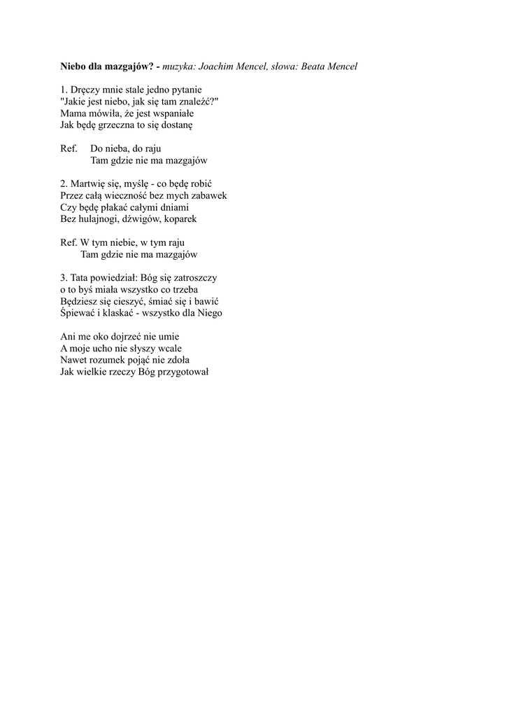 Niebo dla mazgajów? - muzyka: Joachim Mencel, słowa: Beata Mencel 1. Dręczy mnie stale jedno pytanie "Jakie jest niebo, jak się tam znaleźć?" Mama mówiła, że jest wspaniałe Jak będę grzeczna to się dostanę Ref. Do nieba, do raju Tam gdzie nie ma mazgajów 2. Martwię się, myślę - co będę robić Przez całą wieczność bez mych zabawek Czy będę płakać całymi dniami Bez hulajnogi, dźwigów, koparek Ref. W tym niebie, w tym raju Tam gdzie nie ma mazgajów 3. Tata powiedział: Bóg się zatroszczy o to byś miała wszystko co trzeba Będziesz się cieszyć, śmiać się i bawić Śpiewać i klaskać - wszystko dla Niego Ani me oko dojrzeć nie umie A moje ucho nie słyszy wcale Nawet rozumek pojąć nie zdoła Jak wielkie rzeczy Bóg przygotował