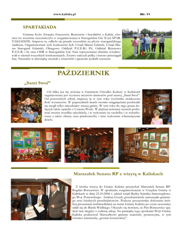 www.kaliska.pl Str. 11 SPARTAKIADA Gminne Koło Związku Emerytów, Rencistów i Inwalidów z Kalisk, równieŜ we wrześniu uczestniczyło w zorganizowanej w Starogardzie Gd. II juŜ SPARTAKIADZIE. Impreza ta, odbyła się przede wszystkim na płycie starogardzkiego stadionu. Organizatorami tych konkursów byli: Urząd Miasta Gdańsk, Urząd Miasta Starogard Gdański, Okręgowy Oddział P.Z.E.R.i IN, Oddział Rejonowy P.Z.E.R. i In oraz OSiR w Starogardzie Gd. Nasi reprezentanci dzielnie rywalizowali w niemal wszystkich konkurencjach. śwawo tańczyli polkę i mocno przeciągali linę. NiemalŜe w dziesiątkę strzelali z wiatrówki i sprawnie jeździli rowerem. PAŹDZIERNIK „Sami Swoi” Od kilku juŜ lat, jesienią w Gminnym Ośrodku Kultury w Kaliskach organizowana jest wystawa artystów-amatorów pod nazwą „Sami-Swoi”. Od pozostałych edycji, imprezę tę w tym roku wyróŜniła zwiększona ilość wystawców. W poprzednich latach swoimi osiągnięciami pochwalić się mogli tylko mieszkańcy naszej gminy. W tym roku do tego grona dołączyli takŜe sąsiedzi z Czarnej Wody. W pięknej jesiennej scenerii podziwiać moŜna wszelkie rękodzieła, i te wykonane na szydełku i te wyhaftowane a takŜe obrazy oraz płaskorzeźby i inne wykonane własnoręcznie dzieła. Marszałek Senatu RP z wizytą w Kaliskach Z krótką wizytą do Gminy Kaliska przyjechał Marszałek Senatu RPBogdan Borusewicz. W spotkaniu zorganizowanym w Urzędzie Gminy w Kaliskach w dniu 23.10.2006 r. udział wzięli Radny Sejmiku Samorządowego Woj. Pomorskiego- Andrzej Grzyb, przedstawiciele samorządu gminnego oraz lokalnych przedsiębiorców. Podczas poczęstunku dokonano krótkiej prezentacji multimedialnej na temat Gminy Kaliska po czym uczestnicy udali się do Bartla Wielkiego. Okazało się bowiem, Ŝe Pan Borusewicz spędzał tam niegdyś z rodziną urlop. Na pamiątkę tego spotkania Wójt Gminy Kaliska podarował Marszałkowi gminne materiały promocyjne, w tym równieŜ miniaturkę „postaci kociewskiej”. Kaliski Goniec — Str. 12 Naprawdę integrujący festyn W sobotę 09.09.2006, główną ulicą Kalisk od Gok– u , aŜ do Urzędu Gminy ruszył pochód osób niepełnosprawnych i ich opiekunów. W ten właśnie sposób rozpoczął się festyn integracyjny pn. „Jednoczymy siły, by świat był miły”. Organizatorem tej imprezy było Stowarzyszenie Rodziców Wychowujących dzieci niepełnosprawne „Dziecko Miłości” w Kaliskach. Wśród zaproszonych gości byli przyjaciele ze Stowar zyszenia „Pogoda” (Kleszczewo) oraz dzieci i młodzieŜ niepełnosprawna ze Smętowa. Dla uczestników organizatorzy przygotowali m.in.: pyszny poczęstunek, przejazd bryczką, konkursy, loterię fantową w której kaŜdy los wygrywał oraz wspaniałą zabawę taneczną. Kolejny raz był to wspaniale i wesoło spędzony czas wśród naszych niepełnosprawnych przyjaciół. LISTOPAD Krajobraz po wyborach... Listopadowe wybory w naszej Gminie przyniosły wiele zmian. Na rozpoczynającą się kadencję 2006-2010 wybieraliśmy 15 nowych radnych, Wójta Gminy, Radnego do Rady Powiatu (został nim Pan Leszek Burczyk oraz Pan Sławomir Witos) oraz przedstawiciela w Sejmiku Województwa Pomorskiego. Dzień wyborów poprzedził okres objęty kalendarzem wyborczym. W tym czasie Gminna Komisja Wyborcza wykonywała swoje ustawowe czynności: przyjmowała zgłoszenia kandydatów na radnych i wójta i wydawała obwieszczenia i uchwały w zakresie wyborów – czuwała nad prawidłowym przebiegiem wyborów. Obwodowe Komisje Wyborcze w dniu 12 .11.2006 r. wykonywały stosowne czynności w swoich lokalach . Urząd Gminy ze swej strony zapewnił organizacyjną , merytoryczną, informatyczną i techniczną obsługę. W dzień wyborów dopisali równieŜ wyborcy. Mimo deszczowej jesiennej pogody frekwencja wyniosła ok. 43%. W dniu 13.11.2006 r. ( w nocy) Gminna Komisja Wyborcza otrzymała protokoły głosowania od trzech Komisji Obwodowych ustalając zbiorcze wyniki wyborów do Rady Gminy Kaliska oraz Wójta Gminy Kaliska . Wyniki te przekazano niezwłocznie Wojewódzkiemu Komisarzowi Wyborczemu w Gdańsku – kończąc tym samym etap pracy przewidziany na dzień wyborów. W wyniku kolejnych bezpośrednich wyborów Wójtem Gminy został Pan Antoni Cywiński a radnymi zostali: 1/ Zofia Czarnowska – Piece 2/ Zdzisław Dera – Bartel Wielki 3/ Jan Giełdon – Piece 4/ Maria Jolanta Ignaciuk- Piece 5/ Sławomir Janicki- Kaliska 6/Alicja Jutrzenka- Trzebiatowska– Kaliska 7/ Kazimierz Liczywek- Kaliska 8/ Zbigniew Malinowski – Kaliska 9/ Grzegorz Pawłowski – Dąbrowa 10/ Małgorzata Pozorska– Kaliska 11/ Franciszek Szandrach – Iwiczno 12/ Zbigniew Szarafin – Kaliska 13/ Andrzej Pozorski- Dunajki 14/Maria Wiśniewska– Cieciorka 15/ Barbara śmuda Trzebiatowska – Frank www.kaliska.pl Str. 13 Turniejowe wspomnienia JuŜ po raz czwarty, 18 listopada 2006 r. w Gminnym Ośrodku Kultury w Kaliskach, odbył się Turniej Sołectw, w którym wzięły udział prawie wszystkie nasze sołectwa. Przygotowały się do niego bardzo rzetelnie i profesjonalnie. Regulamin obejmował kilka zadań, które naleŜało przygotować wcześniej. Dotyczyły one: ubrania lalki w damski strój kociewski, przygotowania potrawy do degustacji pod kociewską nazwą „Fałszywy zając”, wykonania tańca „Rock and roll”, scenki kabaretowej „Zebranie Wiejskie” i Mini Playback Show, który polegał na przygotowaniu jednej piosenki polskojęzycznej. Dodatkowo sołectwa brały udział w róŜnych konkurencjach: wierceniu otworów w desce na czas w wykonaniu pań, konkursie wiedzowym dotyczącym rozpoznania miejscowości z terenu Gminy Kaliska na podstawie wiersza o gminie oraz zdobyciu jak największej liczby damskich butów z lewej nogi podczas jednego utworu muzycznego. PowyŜszą imprezę uświetnił koncert chóru „Leśne Echo” pod batutą Pana Zygmunta Beyera. .Bezkonkurencyjne okazało się tym razem Sołectwo Kaliska, które