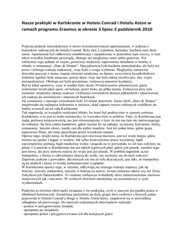 Nasze praktyki w Karlskronie w Hotelu Conrad i Hotelu Aston w ramach programu Erasmus w okresie 3 lipiec-2 październik 2010 Podczas praktyk mieszkałyśmy w nowo wyremontowanym apartamencie, w jednym z budynków należących do hotelu Conrad. Były tam 2 sypialnie, łazienka, kuchnia oraz duży salon. Apartament był całkowicie umeblowany i zaopatrzony w potrzebne nam rzeczy, w tym także wszelkie kuchenne przyrządy, dlatego też mogłyśmy same sobie gotować. Nie robiłyśmy tego jednak za często, ponieważ miałyśmy zapewnione śniadania w hotelu, a obiady w restauracji „Stars & Stripes”. Specjalnością była kuchnia amerykańska, ale były też pizze i różnego rodzaju makarony, więc było z czego wybierać. Mogłyśmy zamawiać dowolne pozycje z menu, napoje również miałyśmy za darmo, oczywiście bezalkoholowe. Jedzenie ogólnie było smaczne, porcje duże, więc nie było takiej możliwości, aby wyjść nienajedzonym. Obsługa też była przyjemna, zwłaszcza panowie kucharze. Był to lokal sportowy, więc w środku było około 30 telewizorów plazmowych, gdzie codziennie leciał jakiś sport, od hokeju, przez boks, po piłkę nożną. Zwłaszcza przy tym ostatnim, miałyśmy okazje siedzieć z kibicami szwedzkich drużyn piłkarskich i obserwować ich reakcje po strzelonych i straconych bramkach. Do restauracji z naszego mieszkania było 10 minut spacerem. Zaraz obok „Stars & Stripes” znajdowała się najlepsza lodziarnia w mieście, skąd zapach świeżo robionych wafelków do lodów roznosił się na całą Karlskronę. Tak naprawdę, to wszędzie miałyśmy blisko, bo hotel był praktycznie w samym centrum Karlskrony, a że jest to małe miasteczko, to wszystko było w pobliżu. Fakt, że Karlskrona jest małą, portową miejscowością, nie jest równoznaczny z tym, że nie ma tam nic interesującego do robienia. Są dwa centra handlowe, gdzie można iść na zakupy, są muzea, kawiarnie, kluby, restauracje. Innymi słowy, każdy coś dla siebie znajdzie. Jest też jedno kino, gdzie grają najnowsze filmy, ale tutaj uprzedzam przed wysokimi cenami. Oprócz tego, dzięki temu, że Karlskrona jest otoczona morzem, jest też wiele miejsc gdzie można się opalać i kąpać w wodzie. Jak tylko kończyłyśmy pracę wcześniej, bądź zaczynałyśmy później, bądź miałyśmy wolne i pogoda na to pozwalała, to od razu szłyśmy na plażę. Co prawda w Karlskronie nie ma takich typowych plaż, gdzie jest piasek, zamiast tego jest trawa, ale przy samym zejściu do wody jest już piasek. W pobliżu kąpielisk są też trampoliny, z której ci odważniejsi skaczą do wody, my możemy się do nich zaliczyć. Zapewne jednym z powodów, dla których nie ma aż tylu skaczących, jest fakt, że trampoliny są na skałach i może to trochę niebezpiecznie wyglądać. W Karlskronie oprócz tego, w sezonie, odbywają się różnego rodzaju imprezy, jak np. festyny, zawody siatkarskie, zawody w hokeju na trawie, święto jedzenia raków czy też Zloty Zabytkowych Samochodów. Te ostatnie zwłaszcza wzbudzały duże zainteresowanie zarówno miejscowych jak i turystów. W wolnych chwilach starałyśmy się uczestniczyć w tych wydarzeniach. Praktyka to również obowiązki związane z ów praktyką, czyli w naszym przypadku praca w obiektach hotelowych. Zostaliśmy podzieleni na dwie grupy dwu osobowe z których jedna pracowała w Hotelu Conrad a druga w Hotelu Aston który, znajdował się w niewielkiej odległości od pierwszego. Do naszych codziennych obowiązków należało: - pomoc w przygotowaniu śniadań, - sprzątanie po śniadaniu - sprzątanie pokoi i przygotowywanie ich dla kolejnych gości - pomoc w pralni Jedna z możliwości która była nam również dana to zapoznanie się z systemem rezerwacji, przyjmowanie gości oraz służenie pomocą gościom z Polski. Prace zaczynałyśmy o godzinie 8.00. Naszym obowiązkiem było przygotować bufet śniadaniowy następnie o godzinie 10.00 było mogłyśmy zjeść śniadanie i zaraz po nim trzeba było zabrać się do sprzątania i przygotowania wszystkich produktów na następny dzień. Następnie przechodziłyśmy do sprzątania pokoi i przygotowywania ich dla następnych gości hotelowych. O godzinie 12.00 była przerwa na lunch i po niej wracało się do poszatkowania pokoi lub pomocy w pralni. Prace kończyłyśmy o godzinie 16.00 a więc godzinę lub półtorej przed zakończeniem pracy miałyśmy szkolenie w recepcji. Można by było powiedzieć ze to nie za wiele by poznać całą prace jaką wykonuje się w recepcji ale, możliwość taka jednak była nam dana w dni w których pracowałyśmy na wieczorną zmianę czyli od godziny 15.00 do 21.00. We wrześniu nasza szefowa zorganizowała nam 2 wycieczki: do Malmo i Kopenhagi oraz do Goteborga. Pierwsza z nich była dwudniowa, wczesnym popołudniem dojechałyśmy do Malmo i miałyśmy czas wolny do wieczora, kiedy to wszystkie szłyśmy na kolację. Podczas tej kolacji poznałyśmy córkę naszej szefowej oraz jej wnuczkę. Zarówno jedzenie jak i sam lokal były wyborne i spędziłyśmy bardzo miły wieczór. Nasz hotel znajdował się w samym centrum Malmo, więc po kolacji, poszłyśmy jeszcze się przejść starówką. Następnego dnia rano miałyśmy pociąg do Kopenhagi. Podróż trwała raptem 20 minut i tak naprawdę nim się zdążyłyśmy zorientować, już byłyśmy na dworcu centralnym w Kopenhadze. Przyjechałyśmy wcześnie do stolicy duńskiej, dlatego miałyśmy więcej czasu niż w Malmo, bo pociąg powrotny miałyśmy o godzinie 17. Tutaj również miałyśmy pełną swobodę, dlatego wcześniej zaplanowałyśmy sobie co będziemy robić. Jako pierwszy punkt naszej wycieczki ustaliłyśmy Syrenkę Kopenhaską. Niestety mapka jaką sobie wydrukowałyśmy utrudniła nam znacznie jej odnalezienie, w wyniku czego musiałyśmy się pytać miejscowych i kierować się mapami na przystankach autobusowych. Na szczęście, po paru godzinach udało na
