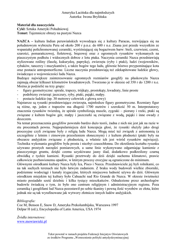 Ameryka Łacińska dla najmłodszych Autorka: Iwona Brylińska Materiał dla nauczyciela Cykl: Sztuka Ameryki Południowej Temat: Tajemnicze obrazy na pustyni Nazca NAZCA – kultura Indian peruwiańskich wywodząca się z kultury Paracas, rozwijająca się na południowym wybrzeŜu Peru od około 200 r p.n.e. do 600 r n.e. Znana jest przede wszystkim ze wspaniałej polichromowanej ceramiki, wyróŜniającej się bogactwem barw: bieli, czerwieni, czerni, szarości, pomarańczowej, fioletowej, brązowej oraz z ogromnych rysunków wykonanych na piaszczystym podłoŜu i widocznych dobrze z lotu ptaka. Naczynia ceramiki Nazca przedstawiają stylizowane rośliny (fasolę, kukurydzę, paprykę), zwierzęta (ryby i ptaki), ludzi (wojowników, rybaków, tancerzy i muzykantów), a takŜe bogów tego ludu, głównie bóstwo przypominające kota oraz postacie antropomorficzne. Liczne naczynia przedstawiają teŜ zdekapitowane ludzkie głowy, świadczące o wojowniczości ludu Nazca. Budzące największe zainteresowanie ogromnych rozmiarów geoglify na płaskowyŜu Nazca zajmują obszar kilkuset kilometrów kwadratowych. Tworzono je w okresie od 350 r do 1200 r n.e. MoŜna je podzielić na trzy grupy: - figury geometryczne: spirale, trapezy, trójkąty, prostokąty, kwadraty, linie proste - podobizny zwierząt: jaszczury, ryby, ptaki, pająki, małpy. - postacie ludzkie (np. 30 metrowy człowiek z głową sowy) Najstarsze są rysunki przedstawiające zwierzęta, najmłodsze figury geometryczne. Rozmiary figur są róŜne, np. jeden z trapezów ma długość 1700 metrów i szerokość 50 m. Interpretatorzy znaczenia rysunków twierdzą, Ŝe spirale symbolizują muszle, zygzaki – pioruny i rzeki, ptaki są związane z kultem bogów gór, małpy i jaszczurki są związane z wodą, pająki i inne owady z deszczem. Na temat przeznaczenia geoglifów powstało bardzo duŜo teorii, Ŝadna z nich nie jest jak na razie w stu procentach pewna. Najpopularniejsza dziś koncepcja głosi, Ŝe rysunki słuŜyły jako drogi procesyjne czyli związane były z religią ludu Nazca. Mogą mieć teŜ związek z astronomią (a szczególnie z letnim i zimowym przesileniem słonecznym) i z kultem płodności (ptaki były na obszarze andyjskim związane z płodnością, a właśnie ich jest wśród rysunków najwięcej). Technika wykonania geoglifów była prosta i niezbyt czasochłonna. Do określenia kształtu rysunku uŜywano prostych narzędzi pomiarowych, a same linie wykonywano odgarniając kamienie z piaszczystego gruntu, dzięki czemu uzyskiwano jasny ślad, dodatkowo podkreślony czarną obwódką z tychŜe kamieni. Rysunki przetrwały do dziś dzięki suchemu klimatowi, prawie całkowicie pozbawionemu opadów, w którym procesy erozyjne są ograniczone do minimum. Głównymi ośrodkami kultury Nazca były Ica, Pisco i Nazca. Przedstawiciele jej byli rolnikami, co na tak suchych terenach nie było łatwym zadaniem. Z braku wody budowali wielkie zbiorniki, podziemne wodociągi i kanały irygacyjne, których miejscowa ludność uŜywa do dziś. Głównym ośrodkiem miejskim tej kultury było Cahuachi nad Rio Grande de Nazca. W okresie świetności miasto posiadało sześć dzielnic i kilka tysięcy mieszkańców. Odnalezione przez archeologów budowle świadczą o tym, Ŝe było ono centrum religijnym i administracyjnym regionu. Poza ceramiką i geoglifami lud Nazca pozostawił po sobie tkaniny i pewną ilość wyrobów ze złota, które jednak nie są tak wyrafinowane jak wytwory złotnicze innych ludów andyjskich. Bibliografia: Coe M, Benson E, Snow D, Ameryka Prekolumbijska, Warszawa 1997 Delpar H (ed.), Encyclopedia of Latin America, USA 1974 Źródła internetowe: www.mowiawieki.pl Tekst powstał w ramach projektu Federacji Inicjatyw Oświatowych ze środków Programu „Wzmocnienie polityki antydyskryminacyjnej