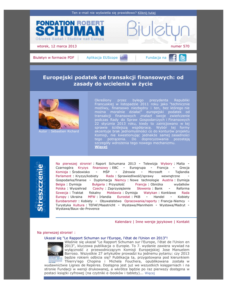 Ten e-mail nie wyświetla się prawidłowo? Kliknij tutaj wtorek, 12 marca 2013 Biuletyn w formacie PDF numer 570 Aplikacja EUScope Fundacja na Europejski podatek od transakcji finansowych: od zasady do wcielenia w życie Autor : Sébastien Richard Określony przez byłego prezydenta Republiki Francuskiej w listopadzie 2011 roku jako "technicznie możliwy, finansowo niezbędny i ten, bez którego nie można moralnie działać" europejski podatek od transakcji finansowych znalazł swoje zwieńczenie podczas Rady do Spraw Gospodarczych i Finansowych 22 stycznia 2013 roku, kiedy to zainicjowano w tej sprawie ściślejszą współpracę. Wybór tej formy akcentuje brak jednomyślności co do konturów projektu Komisji, nie kwestionując jednakże samej zasadności tego potrącenia. Do doprecyzowania pozostają szczegóły wdrożenia tego nowego mechanizmu. Więcej Na pierwszej stronie! : Raport Schumana 2013 - Telewizja Wybory : Malta Czarnogóra Kryzys finansowy : EBC - Eurogrupa - Francja - Grecja MŚP Zdrowie Microsoft Tajlandia Komisja : Środowisko Rada : Sprawiedliwość/sprawy wewnętrzne Parlament : Kryzys/kobiety Gospodarka/finanse - Dyplomacja Niemcy : Nowe technologie Austria : Dymisja Bułgaria : Przyszłość Francja : Obniżka wydatków Belgia : Dymisja Czechy : Zaprzysiężenie Słowenia : Bank Reforma Polska : Wyszehrad fiskalny Mołdawia : Dymisja Watykan : Konklawe Rada Szwecja : Traktat MFW : Irlandia Eurostat : PKB Handel Kobiety Europy : Ukraina Eurobarometr : Kobiety - Obywatelstwo Opracowania/raporty : Francja-Niemcy Turystyka Kultura : TEFAF/Maastricht - Wystawa/Mannheim - Wystawa/Madryt Wystawa/Baux-de-Provence Kalendarz | Inne wersje językowe | Kontakt Na pierwszej stronie! : Ukazał się "Le Rapport Schuman sur l'Europe, l'état de l'Union en 2013"! Właśnie się ukazał "Le Rapport Schuman sur l'Europe, l'état de l'Union en 2013", kluczowa publikacja o Europie. To 7. wydanie zawiera wywiad na wyłączność z przewodniczącym Komisji Europejskiej Jose Manuelem Barroso. Wszystkie 27 artykułów prowadzi ku jednemu pytaniu: czy 2013 będzie rokiem odbicia się? Publikacja ta, przygotowana pod kierunkiem Thierry'ego Chopina i Michela Fouchera, opublikowana została w wydawnictwie Lignes de Repères. Dostępna jest już we wszystkich księgarniach i na stronie Fundacji w wersji drukowanej, a wkrótce będzie po raz pierwszy dostępna w postaci książki cyfrowej (na czytniki e-booków i tablety)... Więcej "Talking Europe" gości Olafura Ragnara Grimssona, islandzkiego prezydenta W ramach partnerstwa między Fundacją Roberta Schumana i Audiovisuel extérieur de la France (AEF) Fundacja emituje na swojej stronie najświeższy program "Talking Europe", którego gościem był Olafur Ragnar Grimsson, islandzki prezydent. Grimsson powraca do załamania islandzkich banków w 2008 roku i jego konsekwencji dla Islandii. Wyjaśnia również, jak temu małemu krajowi udało się przezwyciężyć kryzys 5 lat później... Więcej Wybory : Partia Pracy zwycięża wybory parlamentarne na Malcie Partia Pracy (LP), prowadzona przez Josepha Muscata, odniosła historyczne zwycięstwo w wyborach parlamentarnych, które odbyły się 9 marca w archipelagu Wysp Maltańskich. Zdobyła 54,83% głosów i 38 mandatów w Izbie Reprezentantów (Il-Kamra Tad-Deputati), jedynej izbie parlamentu (czyli +4 w stosunku do poprzednich wyborów 8 marca 2008). Wyprzedziła Partię Nacjonalistyczną (PN) dotychczasowego premiera Lawrence'a Gonziego, która otrzymała 43,34% głosów i 29 foteli (-6). Demokratyczna Alternatywa (AD), partia ekologiczna kierowana przez Michaela Briguglio, zdobyła 1,8% głosów i nie weszła do parlamentu. Frekwencja wyniosła 93,10%... Więcej Czy dotychczasowy prezydent republiki Filip Vujanović może przegrać? 7 kwietnia, z okazji 1. tury wyborów prezydenckich, do urn ma się udać 515 000 Czarnogórców. Dotychczasowy szef państwa Filip Vujanović (Demokratyczna Partia Socjalistów, DPS) stara się o reelekcję. Zmierzy się z Miodragiem Lekiciem, liderem Nowego Frontu Demokratycznego (koalicji gromadzącej Nową Serbską Demokrację (NSD) Andrija Mandicia, Ruch na rzecz Zmian (GZP) Nebojsy Medojevicia i Partię Emerytów, Inwalidów i Sprawiedliwości Społecznej), oraz Rade Bojoviciem, członkiem klubu politycznego Sprawiedliwa Czarnogóra, który startuje jako kandydat niezależny. Kandydaci mają czas do 18 marca, żeby się zarejestrować w Komisji Wyborczej. Jeśli żadna ze startujących osób nie uzyska 7 kwietnia większości absolutnej, 21 kwietnia odbędzie się 2. tura... Więcej Kryzys finansowy : EBC dokonuje korekty swoich prognoz gospodarczych 7 marca 2013 roku Rada Prezesów Europejskiego Banku Centralnego (EBC) podjęła decyzję o pozostawieniu stóp procentowych na niezmienionym poziomie. EBC dokonało korekty w dół swoich prognoz wzrostu w strefie euro w 2013 i 2014 oraz obniżyło swoje prognozy inflacyjne na 2014. Teraz EBC spodziewa się skurczenia PKB o 0,5%, wobec przewidywanego do tej pory spadku o 0,3%. W 2014 liczy na ograniczony wzrost (od 1 do 1,2%). Bank utrzymał swoją prognozę inflacyjną dla strefy euro na 2013 rok (1,6%), ale obniżył swoje prognozy na 2014 do 1,3%. Polityka pieniężna "nadal będzie się przystosowywać, jak to będzie konieczne", a EBC nadal będzie oferować tyle płynności, ile będą domagać się banki, dodał Mario Draghi oceniając, że sytuacja w strefie euro pozostaje krucha, pomimo stałej poprawy w ostatnich miesiącach odnośnie kryzysu zadłużenia... Więcej Więcej Deklaracje Eurogrupy w sprawie Cypru i Grecji 4 marca 2013 roku 17 ministrów finansów strefy euro zebrało się na posiedzeniu Eurogrupy i wezwało cypryjskie, europejskie i międzynarodowe władze do przyspieszenia negocjacji z zamiarem zawarcia protokołu porozumienia o pomocy finansowej dla Cypru. Jednocześnie ministrowie ponowili zapewnienia o zaufania do nowego cypryjskiego prezydenta i rządu. Poza tym, wyrazili zadow