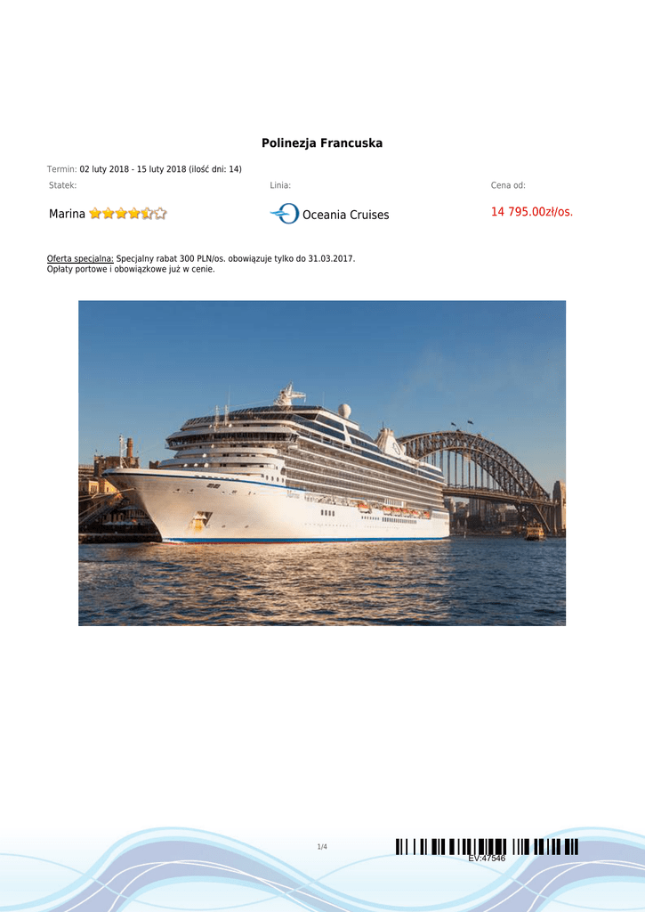 Polinezja Francuska Termin: 02 luty 2018 - 15 luty 2018 (ilość dni: 14) Statek: Marina Linia: Cena od: Oceania Cruises 14 795.00zł/os. Oferta specjalna: Specjalny rabat 300 PLN/os. obowiązuje tylko do 31.03.2017. Opłaty portowe i obowiązkowe już w cenie. 1/4 EV:47546 TRASA REJSU dzień 1 Data Port Wpłynięcie Wypłynięcie piątek 02.02.2018 Warszawa --:-- --:-- Legenda Polska Spotkanie z pilotem na lotnisku w Warszawie, wylot w kierunku Tahiti. dzień 2 sobota 03.02.2018 Papeete , Tahiti --:-- --:-- Polinezja Francuska Przylot do Papeete, transfer do portu, zaokrętowanie na statek Oceania Marina. dzień 3 niedziela 04.02.2018 Papeete , Tahiti --:-- 05:00 Polinezja Francuska Około godziny 5:00 rano wypłynięcie statku w kierunku Moorea. Dzień na morzu. dzień 4 poniedziałek 05.02.2018 Moorea 08:00 18:00 Polinezja Francuska Czas wolny na indywidualne zwiedzanie lub udział w wycieczce fakultatywnej ukazującej specyfikę wyspy: plantacje ananasów, miejsca kultu, lokalne społeczności i piękno natury. dzień 5 wtorek 06.02.2018 Dzień na morzu --:-- --:-- dzień 6 środa 07.02.2018 Fakarava, Tuamotu 08:00 18:00 Polinezja Francuska Czas wolny na indywidualne zwiedzanie lub udział w wycieczce fakultatywnej pozwalającej zobaczyć urokliwe wioski, miejsca kultu religijnego i koralowe kościoły oraz bogactwo flory i fauny, dzięki której atol uznano za Rezerwat Biosfery UNESCO. dzień 7 czwartek 08.02.2018 Rangiroa, Tuamotu 08:00 17:00 Polinezja Francuska Czas wolny na plażowanie, nurkowanie lub udział w wycieczce na farmę pereł. dzień 8 piątek 09.02.2018 Bora-Bora 10:00 --:-- Polinezja Francuska Czas wolny na indywidualne zwiedzanie lub udział w wycieczce fakultatywnej pokazującej historyczne miejsca związane z II WŚ, lokalną kulturę i bogactwo natury. dzień 9 sobota 10.02.2018 Bora-Bora --:-- 23:00 Polinezja Francuska Czas wolny na indywidualne zwiedzanie, plażowanie, uprawianie sportów wodnych, nurkowanie lub udział w wycieczce fakultatywnej. dzień 10 niedziela 11.02.2018 Raiatea 08:00 --:-- Polinezja Francuska Czas wolny na indywidualne zwiedzanie lub udział w wycieczce fakultatywnej pokazującej najciekawsze miejsca na wyspie m.in.: plantacje wanilii, tropikalny interior wyspy z lasami bambusowymi, bajkowe laguny i zatoki oraz miejsca kultu religijnego jak np. Marae Taputapuatea. dzień 11 poniedziałek 12.02.2018 --:-- Raiatea 19:00 Polinezja Francuska Czas wolny na indywidualne zwiedzanie, plażowanie, uprawianie sportów wodnych, nurkowanie lub udział w wycieczce fakultatywnej. dzień 12 wtorek 13.02.2018 Huahine 08:00 17:00 Polinezja Francuska 2/4 EV:47546 Data Port Wpłynięcie Wypłynięcie Legenda Czas wolny na plażowanie lub udział w wycieczce fakultatywnej pozwalającej poznać najciekawsze miejsca na wyspie przepiękne krajobrazy, plaże i fascynujące stanowiska archeologiczne. dzień 13 środa 14.02.2018 08:00 Papeete , Tahiti --:-- Polinezja Francuska Wyokrętowanie ze statku po śniadaniu. Czas wolny i transfer na lotnisko lub udział w wycieczce fakultatywnej zakończonej transferem na lotnisko. Wylot do Polski. dzień 14 czwartek 15.02.2018 Warszawa --:-- --:-- Polska Przylot do Warszawy i zakończenie wycieczki. CENNIK Cena katalogowa Cena promocyjna Kabina zewnętrzna z oknem 15 095.00zł 14 795.00zł Kabina zewnętrzna z balkonem 16 795.00zł 16 495.00zł 3 i 4 osoba dorosła w kabinie na zapytanie dziecko do 18 lat jako 3 i 4 osoba w kabinie na zapytanie Opłaty portowe i obowiązkowe Bilet lotniczy (w PLN) w cenie ok. 7800zł Uwaga! Ceny za osobę w kabinie dwuosobowej. Cena zawiera: 11 - dniowy rejs statkiem Marina (10 noclegów) - zakwaterowanie w kabinie wybranej kategorii; wyżywienie - 3 główne posiłki, przekąski między posiłkami, bufet lub wieczorne przekąski; napoje serwowane do śniadania i w bufetach samoobsługowych; serwis bagażowy podczas wejścia i zejścia ze statku oraz serwis kabinowy; korzystanie z urządzeń sportowo - rekreacyjnych znajdujących się na pokładzie statku (basen, jacuzzi, sala fitness, itp.); udział w imprezach organizowanych na statku (przedstawienia w teatrze, koncerty, programy animacyjne itp.); transfery lotnisko-port-lotnisko; wstęp do Lone Pine Koala Sanctuary (2 dzień); opłaty portowe i podatki, ubezpieczenie KL, NNW, bagaż; opieka polskiego pilota w trakcie całej imprezy. Cena nie zawiera: kosztu biletu lotniczego; wycieczek fakultatywnych w trakcie rejsu; korzystania z barów, mini baru w kabinie oraz napojów zamawianych w restauracji; korzystania z punktów usługowych (fryzjer, pralnia, fotograf, salon piękności i odnowy biologicznej, internet) i wydatków osobistych; napiwków dla obsługi na statku (ok. 13,5 USD/os./dzień) i zwyczajowych dla obsługi hotelu, kierowców; ubezpieczenia od kosztów rezygnacji i chorób przewlekłych; kosztów wiz (tam gdzie wymagane). Uwagi: dopłata do podstawowego pakietu napojów All Inclusive: ok. 40 EUR/os. dorosła/dzień (pakiet musi być wykupiony przez każdą osobę zakwaterowaną w kabinie - można zakupić w biurze przed rejsem); kabiny 1, 3 i 4 osobowe są na zapytanie i sprzedawane tylko po potwierdzeniu; grupa z polskim pilotem realizowana przy min. 12 osobach; pilot spotyka się z uczestnikami na lotnisku w Warszawie; planowany przelot z przesiadką w Los Angeles - konieczna wiza tranzytowa. Bilet lotniczy 3/4 EV:47546 Powyższa cena dotyczy przelotu w klasie ekonomicznej i została podana w oparciu o cenę z dnia przygotowania oferty. Dokładna cena przelotu podawana jest w momencie rezerwacji. Proponowany przelot liniami lotniczymi Air France z przesiadką w Paryżu i Los Angeles. Przelot WARSZAWA - PAPEETE Przelot PAPEETE - WARSZAWA 02.02.2018 | Warszawa - Paryż: 12:55 - 15:20 13.02.2018 | Papeete - Los Angeles: 23:59 - 10:10+1 02.02.2018 | Paryż - Papeete: 18:45 - 05:50+1 14.02.2018 | Los Angeles - Paryż: 15:30 - 11:15+1 15.02.2018 | Paryż - Warszawa: 16:00 - 18:10 4/4 EV:47546