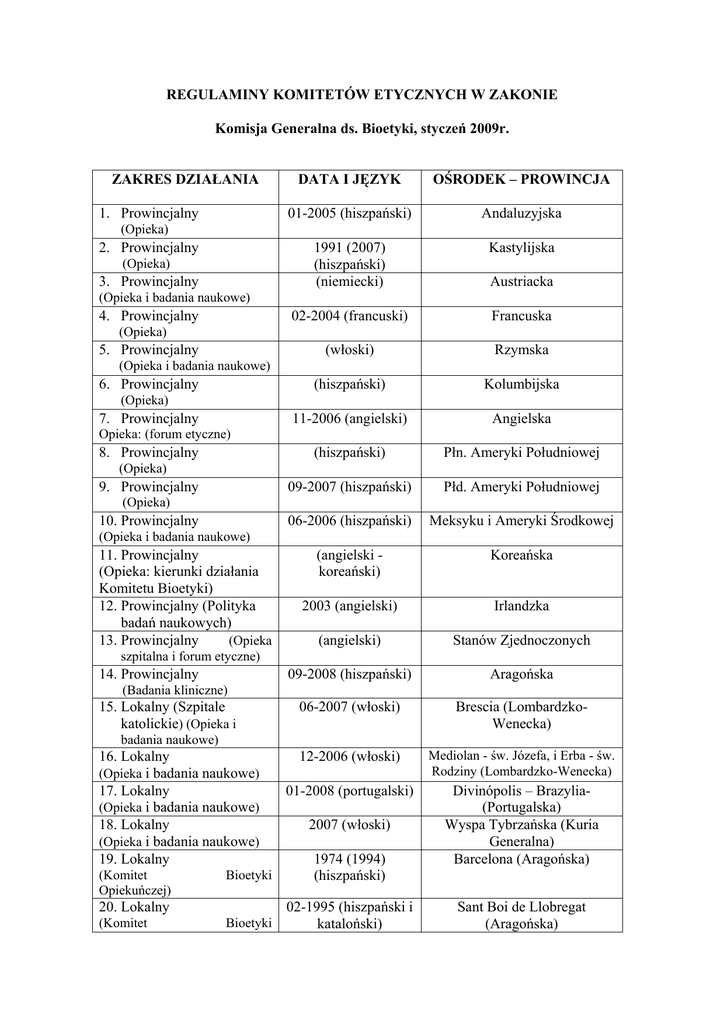 REGULAMINY KOMITETÓW ETYCZNYCH W ZAKONIE Komisja Generalna ds. Bioetyki, styczeń 2009r. ZAKRES DZIAŁANIA 1. Prowincjalny DATA I JĘZYK OŚRODEK – PROWINCJA 01-2005 (hiszpański) Andaluzyjska 1991 (2007) (hiszpański) (niemiecki) Kastylijska 02-2004 (francuski) Francuska (włoski) Rzymska (hiszpański) Kolumbijska 11-2006 (angielski) Angielska (hiszpański) Płn. Ameryki Południowej 09-2007 (hiszpański) Płd. Ameryki Południowej 06-2006 (hiszpański) Meksyku i Ameryki Środkowej (angielski koreański) Koreańska 2003 (angielski) Irlandzka (angielski) Stanów Zjednoczonych 09-2008 (hiszpański) Aragońska 06-2007 (włoski) Brescia (LombardzkoWenecka) 12-2006 (włoski) Mediolan - św. Józefa, i Erba - św. Rodziny (Lombardzko-Wenecka) 01-2008 (portugalski) Divinópolis – Brazylia(Portugalska) Wyspa Tybrzańska (Kuria Generalna) Barcelona (Aragońska) (Opieka) 2. Prowincjalny (Opieka) 3. Prowincjalny Austriacka (Opieka i badania naukowe) 4. Prowincjalny (Opieka) 5. Prowincjalny (Opieka i badania naukowe) 6. Prowincjalny (Opieka) 7. Prowincjalny Opieka: (forum etyczne) 8. Prowincjalny (Opieka) 9. Prowincjalny (Opieka) 10. Prowincjalny (Opieka i badania naukowe) 11. Prowincjalny (Opieka: kierunki działania Komitetu Bioetyki) 12. Prowincjalny (Polityka badań naukowych) 13. Prowincjalny (Opieka szpitalna i forum etyczne) 14. Prowincjalny (Badania kliniczne) 15. Lokalny (Szpitale katolickie) (Opieka i badania naukowe) 16. Lokalny (Opieka i badania naukowe) 17. Lokalny (Opieka i badania naukowe) 18. Lokalny (Opieka i badania naukowe) 19. Lokalny (Komitet Opiekuńczej) Bioetyki 1974 (1994) (hiszpański) Bioetyki 02-1995 (hiszpański i kataloński) 20. Lokalny (Komitet 2007 (włoski) Sant Boi de Llobregat (Aragońska) Opiekuńczej) 21. Lokalny (Komitet Bioetyki 05-2005 (hiszpański) Opiekuńczej) 22. Lokalny (Komitet Bioetyki (kataloński) Pampeluna - Saragossa (Aragońska) Manresa (Aragońska) Opiekuńczej) Uwaga: Aby otrzymać kopię któregokolwiek z tych dokumentów, należy zwrócić się do Sekretariatu Komisji Generalnej ds. Bioetyki, adres email [email protected], lub bezpośrednio do odpowiednich prowincji/ośrodków.