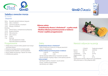 Sałatka z owoców morza (ok 10 porcji) Składniki 500 g Krewetki, paluszki krabowe, langusta 150 g Seler, w kostkach 150 g Czerwona papryka. w kostkach 150 g Mango, w kostkach Dressing: 125 g QimiQ Classic, o temperaturze pokojowej 125 g Kwaśna śmietana 50 ml Olej warzywny 30 ml Sok z cytryny 10 g Cukier 15 g Ketchup Sól, ostra papryka do smaku Pietruszka drobono posiekana Główne zalety: - Zredukowany tłuszcz i cholesterol* - a pełny smak - Możliwe dłuższe przechowywanie w lodówce - Proste i szybkie przygotowanie Przygotowanie Zalety Wartości odżywcze na porcję 1.Dodaj owoce morza do selera, papryki oraz mango i wymieszaj dobrze 2.Dressing: wymiejasz QimiQ aż będzie gładki. 3.Dodaj pozostałe składniki i wymieszaj dobrze 4.Wrzuć sałatke do dressingu i dopraw do smaku 5.Schłódź przez godzine Zredukowany tłuszcz i cholesterol* - Pełny śmietanowy smak przy mniejszej zawartości tłuszczu i cholesterolu Możliwe dłuższe przechowywanie w lodówce z QimiQ bez QimiQ 5 dni 2 dni - QimiQ redukuje odbarwienia i tworzenie się skórki - QimiQ redukuje migrację wilgoci, brak separacji płynów Łatwy przepis - QimiQ jest stabilny z kwasami i się nie zetnie - Proste i szybkie przygotowanie - QimiQ łaczy sie z olejem Z QimiQ Tradycyjny przepis* Kalorie 86 KCal 250 KCal Tłuszcz 8 g 27 g Cholesterol 9 mg 78 mg Węglowodany 2 g 2g Białko 1 g 0,5 g *porównanie wartości odżywczych na podstawie: 330 g Qiminaise vs 330 g Majonez 80%