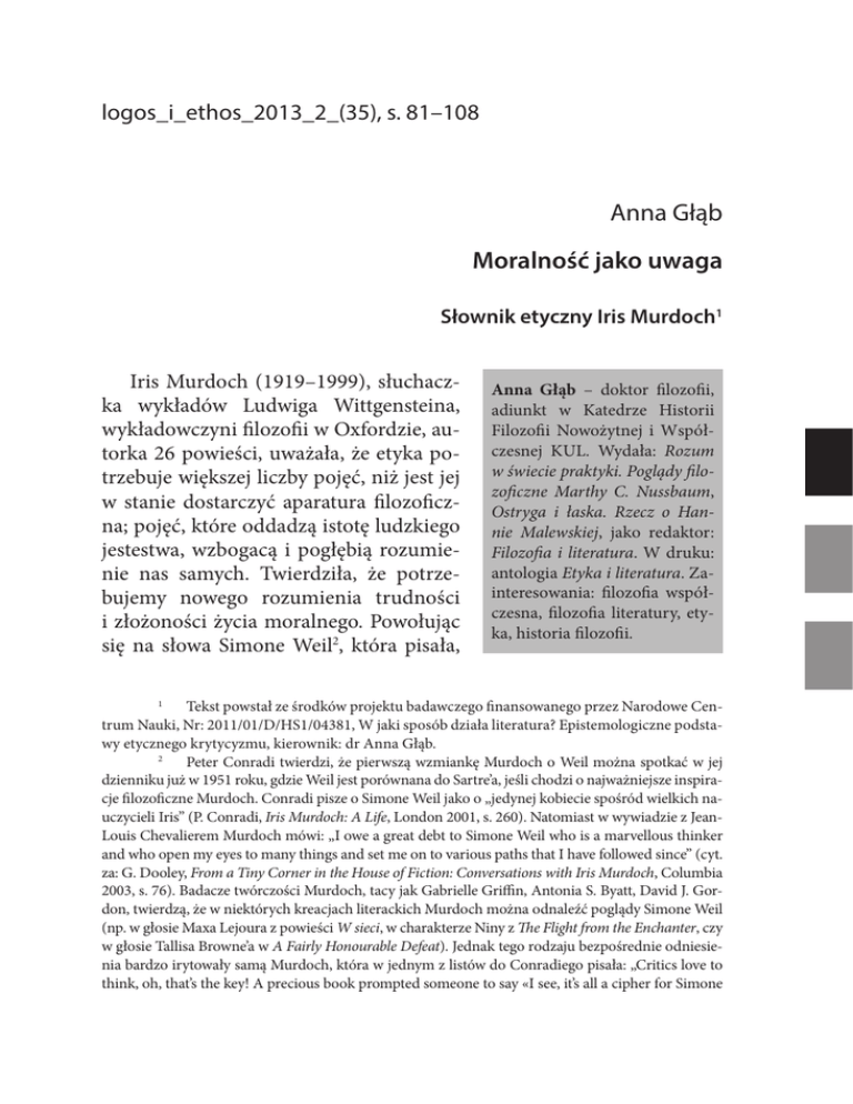 logos_i_ethos_2013_2_(35), s. 81–108 Anna Głąb Moralność jako uwaga Słownik etyczny Iris Murdoch1 Iris Murdoch (1919–1999), słuchaczka wykładów Ludwiga Wittgensteina, wykładowczyni filozofii w Oxfordzie, autorka 26 powieści, uważała, że etyka potrzebuje większej liczby pojęć, niż jest jej w stanie dostarczyć aparatura filozoficzna; pojęć, które oddadzą istotę ludzkiego jestestwa, wzbogacą i pogłębią rozumienie nas samych. Twierdziła, że potrzebujemy nowego rozumienia trudności i złożoności życia moralnego. Powołując się na słowa Simone Weil2, która pisała, Anna Głąb – doktor filozofii, adiunkt w Katedrze Historii Filozofii Nowożytnej i Współczesnej KUL. Wydała: Rozum w świecie praktyki. Poglądy filozoficzne Marthy C. Nussbaum, Ostryga i łaska. Rzecz o Hannie Malewskiej, jako redaktor: Filozofia i literatura. W druku: antologia Etyka i literatura. Zainteresowania: filozofia współczesna, filozofia literatury, etyka, historia filozofii. 1 Tekst powstał ze środków projektu badawczego finansowanego przez Narodowe Centrum Nauki, Nr: 2011/01/D/HS1/04381, W jaki sposób działa literatura? Epistemologiczne podstawy etycznego krytycyzmu, kierownik: dr Anna Głąb. 2 Peter Conradi twierdzi, że pierwszą wzmiankę Murdoch o Weil można spotkać w jej dzienniku już w 1951 roku, gdzie Weil jest porównana do Sartre’a, jeśli chodzi o najważniejsze inspiracje filozoficzne Murdoch. Conradi pisze o Simone Weil jako o „jedynej kobiecie spośród wielkich nauczycieli Iris” (P. Conradi, Iris Murdoch: A Life, London 2001, s. 260). Natomiast w wywiadzie z JeanLouis Chevalierem Murdoch mówi: „I owe a great debt to Simone Weil who is a marvellous thinker and who open my eyes to many things and set me on to various paths that I have followed since” (cyt. za: G. Dooley, From a Tiny Corner in the House of Fiction: Conversations with Iris Murdoch, Columbia 2003, s. 76). Badacze twórczości Murdoch, tacy jak Gabrielle Griffin, Antonia S. Byatt, David J. Gordon, twierdzą, że w niektórych kreacjach literackich Murdoch można odnaleźć poglądy Simone Weil (np. w głosie Maxa Lejoura z powieści W sieci, w charakterze Niny z The Flight from the Enchanter, czy w głosie Tallisa Browne’a w A Fairly Honourable Defeat). Jednak tego rodzaju bezpośrednie odniesienia bardzo irytowały samą Murdoch, która w jednym z listów do Conradiego pisała: „Critics love to think, oh, that’s the key! A precious book prompted someone to say «I see, it’s all a cipher for Simone 82 Anna Głąb że moralność to raczej kwestia uwagi niż woli3, Murdoch uważała, iż potrzebujemy nowego słownika doświadczenia moralnego, w którym prymat będzie należał do pojęcia uwagi4. Na marginesie tekstu Weil Intuitions Pre-Chretiennes, Murdoch zapisała: „Cnota jest wiedzą/jest uwagą”5, i to zdanie stało się kamieniem węgielnym jej filozofii moralnej6. Tym, co połączyło obie myślicielki, było przekonanie, że moralność jest sprawą wizji, a nie wyboru; jest sposobem widzenia świata7. Głównym zadaniem podmiotu moralnego jest odpowiedzialna percepcja rzeczywistości, a celem – dobroć, a nie słuszność działania czy wolność8. Dlatego filozofia moralna Murdoch składa się z zespołu pojęć, takich jak: percepcja, patrzenie, wizja, wyobraźnia i uwaga9. Murdoch podkreśla, że moralność nie może być oddzielona od aktywności myślenia, która jest istotą świadomości. Taki pogląd na naturę refleksji moralnej stoi w opozycji do woluntarystycznych form etyki począwszy od Kanta, który rozumiał wolę jako centrum życia moralnego człowieka. Murdoch w swej koncepcji etyki łączy dwa elementy: wiedzę i moralność, poznawczość i wartość10. Weil»” (cyt. za: A. Rowe, P. Osborn, The Saint and the Hero: Iris Murdoch and Simone Weil, [w:] Iris Murdoch. Philosopher Meets Novelist, ed. S. de Melo Araújo, F. Vieira, Cambridge 2011, s. 105). 3 Por. „Lekarstwa na błędy szukać w działaniu uwagi, a nie woli” (S. Weil, Myśli, wybór A. Olędzka-Frybesowa, Warszawa 1985, s. 150). 4 I. Murdoch, Against Dryness, [w:] tejże, Existentialists and mystics. Writings on philosophy and literature, ed. P. Conradi, New York–London 1999, s. 293. Pojęcie uwagi jako fundament dla moralności stosuje współcześnie Alain Finkielkraut. 5 Cyt. za: A. Rowe, P. Osborn, The Saint and the Hero: Iris Murdoch and Simone Weil, dz. cyt., s. 104. 6 Filozofia moralna Iris Murdoch jest obecna w myśli takich etyków, jak: Charles Taylor, Susan Wolf, Martha Nussbaum, Maria Antonaccio, William Schweiker czy Stanley Hauerwas. Zob. M. Antonaccio, The Virtues of Metaphysics: A Review of Iris Murdoch’s Philosophical Writings, [w:] Iris Murdoch, Philosopher. A Collection of Essays, ed. J. Broackes, New York 2012, s. 155. 7 A. Rowe, P. Osborn, The Saint and the Hero: Iris Murdoch and Simone Weil, dz. cyt., s. 105. 8 I. Murdoch, Prymat dobra, tłum. A. Pawelec, Kraków 1996, s. 92. 9 L. Blum, Visual Metaphors in Murdoch’s Moral Philosophy, [w:] Iris Murdoch, Philosopher…, dz. cyt., s. 307. 10 Zob. M. Antonaccio, Picturing the Human. The Moral Thought of Iris Murdoch, Oxford – New York 2000, s. 85. Moralność jako uwaga 83 Celem niniejszego tekstu jest odpowiedź na pytanie, dlaczego i w jaki sposób Murdoch zastępuje pojęciem uwagi pojęcie woli w etyce. Z pozoru próba ta wydaje się być z góry skazana na niepowodzenie, jak można bowiem na terenie etyki obyć się bez pojęcia woli? W toku analiz okaże się jednak, że Murdoch odróżnia wolę, którą klasyfikuje jako pojęcie psychologiczne, od wolności, która ma dla niej sens poznawczy. Etyce Murdoch bliżej do stanowiska kognitywizmu etycznego, jednak adaptuje ona pojęcia, takie jak wyobraźnia, percepcja czy uwaga, które choć mają wyprowadzić etykę ze skostniałych kategorii często nieprzystających do rzeczywistości moralnej, są obarczone dużym ładunkiem metaforyki, imp