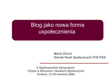 Blog jako nowa forma uspołecznienia Marta Olcoń Szkoła Nauk Społecznych IFiS PAN 2 Ogólnopolskie Sympozjum Fizyka w Ekonomii i Naukach Społecznych Kraków, 21-22 kwietnia 2006 Od indywiduum do wspólnoty Indywidualizacja • Indywidualizacja strukturalna i doktrynalna (Beck, Giddens) • Refleksyjność • „Zindywidualizowane społeczeństwo” (Bauman) „społeczeństwo jednostek” (Elias), „jednostka poza społeczeństwem” (Gauchet), „kultura narcyzmu jednostkowego” (Sennet, Lasch) Dezyndywidualizacja • Od indywidualizmu do nowych form uspołecznienia • Nowe rodzaje więzi (Habermas) • Wspólnoty emocjonalne (Maffesoli) 2 Indywidualizacja Indywidualizacja strukturalna • zinstytucjonalizowany indywidualizm • konieczność życia na „własną rękę” • odpowiedzialność za pomyślne realizowanie projektów życiowych Refleksyjność • dokonywanie wyborów jako zadanie/problem • brak zewnętrznych kryteriów – konieczność sięgnięcia do własnych zasobów • poddawanie pod refleksję najmniejszych aspektów życia codziennego • stała analiza sytuacji życiowej – stanów dawniej oczywistych, takenfor-granted Indywidualizacja normatywna (doktrynalna) • kulturowy imperatyw bycia indywidualistą • ideologia autentyczności i samorealizacji 3 Nowe wspólnoty emocjonalne • • • • • • • • Współczesny trybalizm – nowe plemiona Sieć komunikacyjna i poczucie przynależności Intersubiektywnie odczuwane i podzielane uczucia Własne mity, etyka, rytuały Zbiorowe doświadczanie wrażeń Dobrowolny charakter uczestnictwa Przejście od indywidualizmu na rzecz grupowej solidarności Koncentracja na teraźniejszości Maffesoli M., (2000), Le temps des tribus. Le déclin de l’individualisme dans les sociétés postmodernes, Paris: La Table Ronde. 4 Charakterystyka uspołecznienia sieciowego • Otwarta, nieograniczona, dynamiczna struktura • Oferujące nie przynależność, lecz „włączanie” lub wejście/wyjście • Zdystansowanie, lecz natychmiastowość • Intensywność relacji • Tymczasowość i elastyczność więzi • Zorientowane na projekt • Narracja versus informacja Wittel A. (2001) Toward a Network Sociality, Theory, Culture and Society, vol. 18, (6), 51-76 5 Jednostki we wspólnocie • • • • Samorealizacja jednostkowa wewnątrz wspólnoty Bycie-dzielone-z-innymi (being in common) Powrót do interakcjonizmu Relacjonalne i narracyjne self 6 Blog – podstawowe funkcje • • • • • Komunikacja (wymiana informacji i przeżyć) Potrzeba ekspresji Potrzeba więzi Potrzeba samorealizacji Życie społecznie i towarzyskie 7 Wspólnota blogowiczów - indywidualistów • Kulturowy indywidualizm a konieczność społecznego potwierdzania swojej wyjątkowości • Poszukiwanie ludzi o podobnych zainteresowaniach, poglądach, znajdujących się w tej samej sytuacji • Ekspresja indywidualności wewnątrz wspólnoty • „Narcyzm zbiorowy” • Wspólnota blogowiczów jako narzędzie i arena do konstruowania indywidualności 8 Dziękuję za uwagę 9