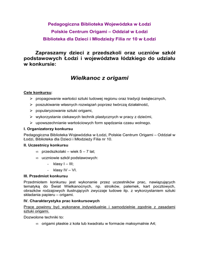Pedagogiczna Biblioteka Wojewódzka w Łodzi Polskie Centrum Origami – Oddział w Łodzi Biblioteka dla Dzieci i MłodzieŜy Filia nr 10 w Łodzi Zapraszamy dzieci z przedszkoli oraz uczniów szkół podstawowych Łodzi i województwa łódzkiego do udziału w konkursie: Wielkanoc z origami Cele konkursu: propagowanie wartości sztuki ludowej regionu oraz tradycji świątecznych, poszukiwanie własnych rozwiązań poprzez twórczą działalność, popularyzowanie sztuki origami, wykorzystanie ciekawych technik plastycznych w pracy z dziećmi, upowszechnianie wartościowych form spędzania czasu wolnego. I. Organizatorzy konkursu Pedagogiczna Biblioteka Wojewódzka w Łodzi, Polskie Centrum Origami – Oddział w Łodzi, Biblioteka dla Dzieci i MłodzieŜy Filia nr 10. II. Uczestnicy konkursu • przedszkolaki – wiek 5 – 7 lat; • uczniowie szkół podstawowych: - klasy I – III; - klasy IV – VI. III. Przedmiot konkursu Przedmiotem konkursu jest wykonanie przez uczestników prac, nawiązujących tematyką do Świat Wielkanocnych, np. stroików, palemek, kart pocztowych, obrazków rodzajowych ilustrujących zwyczaje ludowe itp. z wykorzystaniem sztuki składania papieru – origami. IV. Charakterystyka prac konkursowych Prace powinny być wykonane indywidualnie i samodzielnie zgodnie z zasadami sztuki origami. Dozwolone techniki to: • origami płaskie z koła lub kwadratu w formacie maksymalnie A4; • origami przestrzenne z koła lub kwadratu w wymiarze maksymalnie 20 X 20 X 20 cm (szerokość X długość X wysokość kompozycji). Do kaŜdej z prac powinna być dołączona metryczka, zawierająca: • imię i nazwisko autora pracy oraz jego wiek; • nazwę oraz adres przedszkola, szkoły, klasę; • imię i nazwisko nauczyciela; • telefon oraz obowiązkowo – w celu sprawnego kontaktu - adres e-mail do przedszkola/szkoły lub nauczyciela. Nauczyciel powinien uzyskać zgodę rodziców/opiekunów dziecka udostępnienie jego danych osobowych, wizerunku oraz ekspozycję prac. na Z jednego przedszkola/ szkoły moŜe wpłynąć maksymalnie 5 prac. Wszystkie prace traktowane będą z naleŜytą starannością, jednak organizatorzy nie biorą na siebie odpowiedzialności za ich ewentualne uszkodzenie lub zaginięcie w transporcie pocztowym. Prace naleŜy dostarczyć do Pedagogicznej Biblioteki Wojewódzkiej w Łodzi, ul. Wólczańska 202, parter, pokój 24: - w godzinach pracy Biblioteki lub za pośrednictwem poczty. IV. Ocena prac. 1. Kryteria oceny prac: • zgodność z tematem; • przestrzeganie zasad sztuki origami; • pomysłowość i oryginalność formy; • estetyka wykonania. 2. Konkurs ma charakter jednoetapowy. Prace zostaną ocenione przez komisję, którą powołają organizatorzy konkursu. 3. Prace oceniane będą w kategoriach podanych w pkt. II; organizator zastrzega sobie prawo wprowadzenia dodatkowo kategorii związanych z formą dostarczonych prac (origami płaskie – origami przestrzenne). 4. Decyzja komisji ma charakter ostateczny. V. Nagrody i ekspozycja prac. 1. Uczestnicy konkursu otrzymają okolicznościowe dyplomy, autorzy nagrodzonych prac upominki rzeczowe. 2. Nagrodzeni uczestnicy zostaną powiadomieni o wynikach konkursu oraz zaproszeni do udziału w otwarciu wystawy pokonkursowej. 3. Nagrodzone prace będą zaprezentowane w siedzibie Pedagogicznej Biblioteki Wojewódzkiej w Łodzi. VI. Harmonogram konkursu 1. Termin składania i nadsyłania prac upływa z dniem 12 marca 2010 r. O przyjęciu nie decyduje data stempla pocztowego. 2. Ogłoszenie wyników konkursu – miedzy 13 a 17 marca 2010 r.; dokładna informacja ukaŜe się na stronach internetowych organizatorów. 3. 29 marca 2010 r. – otwarcie wystawy pokonkursowej. 4. Organizatorzy nie odsyłają prac – istnieje moŜliwość ich odebrania po zakończeniu wystawy – w terminie podanym e-mailem przez organizatorów przedszkolom/szkołom/opiekunom uczestników. Prace nieodebrane w tym terminie przechodzą na własność organizatorów konkursu. VII. Postanowienia końcowe 1. Nadesłanie prac oznacza akceptacje warunków konkursu. 2. Organizatorzy konkursu zastrzegają sobie prawo do ostatecznej interpretacji regulaminu oraz wprowadzenia w nim zmian wynikających z powodów organizacyjnych od nich niezaleŜnych. Informacje dodatkowe: Strony internetowe organizatorów: • Pedagogiczna Biblioteki Wojewódzka w Łodzi – www.pbw.lodz.pl; telefon: (0-42) 636 12 50; • Polskie Centrum Origami – www.origami.org.pl • Biblioteka dla Dzieci i MłodzieŜy. Filia nr 10 http://filia10srodmiescie.blogspot.com/ Przydatna literatura: - zasady komponowania obrazków w technikach płaskich origami: Dziamska Dorota: Osiem wskazówek ośmiornicy Matyldy [w:] Papierowe cuda w bajkach. Poznań: MAG, 1999 - charakterystyka technik origami: strona internetowa Polskiego Centrum Origami, dział Origami – Techniki składania - propozycje prac: Dziamska Dorota: seria ksiąŜeczek prezentujących propozycje prac w róŜnych technikach origami Abc orgiami. Warszawa: Wydawnictwo BIS Temko Florence: Origami. Pudełka z papieru. Warszawa: Wydawnictwo RM, 2005 Yoshida Masaktsu: Origami; cz. I i II oraz wiele innych dostępnych obecnie na polskim rynku publikacji strona internetowa www.origami-club.com - zawiera schematy oraz animowane instrukcje.