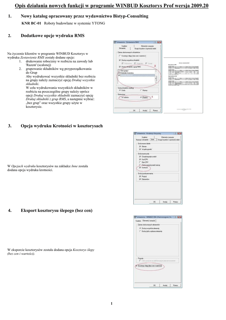 Opis działania nowych funkcji w programie WINBUD Kosztorys Prof wersja 2009.20 1. Nowy katalog opracowany przez wydawnictwo Bistyp-Consulting KNR BC-01 Roboty budowlane w systemie YTONG 2. Dodatkowe opcje wydruku RMS Na życzenie klientów w programie WINBUD Kosztorys w wydruku Zestawienie RMS zostały dodane opcje: 1. drukowanie robocizny w rozbiciu na zawody lub 'Razem' (scalonej) 2. grupowanie składników wg przyporządkowania do Grup Aby wydrukować wszystkie składniki bez rozbicia na grupy należy zaznaczyć opcję Drukuj wszystkie składniki. W celu wydrukowania wszystkich składników w rozbiciu na poszczególne grupy należy oprócz opcji Drukuj wszystkie składniki zaznaczyć opcję Drukuj składniki z grup RMS, a następnie wybrać: „bez grup” oraz wszystkie grupy użyte w kosztorysie. 3. Opcja wydruku Krotności w kosztorysach W Opcjach wydruku kosztorysów na zakładce Inne została dodana opcja wydruku krotności. 4. Eksport kosztorysu ślepego (bez cen) W eksporcie kosztorysów została dodana opcja Kosztorys ślepy (bez cen i wartości). 1 5. Automatyzacja obsługi współczynników korygujących z założeń ogólnych i szczegółowych Został opracowany mechanizm podpowiadania współczynników korygujących, które zgodnie z założeniami do KNR-ów, mogą zostać w odpowiednich warunkach zastosowane do danej pozycji. W wersji 2009.20 współczynniki zostały wprowadzone do katalogów opracowanych przez wydawnictwa ORGBUD oraz Bistyp Consulting. W następnych wersjach będziemy uzupełniać kolejne KNR-y. Aby wstawić współczynnik do pozycji w kosztorysie należy • stanąć na danej pozycji • przejść na zakładkę Współczynniki • • • następnie kliknąć na ikonę Lista współczynników wybrać z listy odpowiedni współczynnik i kliknąć OK. w przypadku kiedy do wyliczenia współczynnika wymagana jest dodatkowa informacja wyświetli się okno z polem do wpisania potrzebnych danych. Z poziomu katalogu jest możliwość podejrzenia listy proponowanych współczynników. 6. Zapamiętywanie i wyświetlanie PIN-u W najnowszej wersji Programu WINBUD została zmodyfikowana autoryzacja programu. Podczas autoryzacji programu wpisujemy PIN, który zostaje zapamiętany w programie i można go podejrzeć w menu Pomoc/ O programie WINBUD 2 7. Zapamiętywanie, wyświetlanie i drukowanie Właściciela licencji Na prośbę klientów w programie WINBUD Kosztorys została dodana możliwość umieszczenia na wydruku kosztorysu informacji na kogo jest wykupiona licencja programu. W tym celu należy na zakładce Ogólne w menu Opcje/ Opcje programu wpisać Właściciela licencji. Licencję można podejrzeć w menu Pomoc/ O programie WINBUD. Nazwa Licencjobiorcy może być drukowana w stopce kosztorysu. W tym celu należy zaznaczyć w ustawieniach wydruku strony tytułowej opcję Licencja . 8. Zmiany w procedurze dezautoryzacji programu Od wersji 2009.20 procedura dezautoryzacji jest dostępna w programie z menu Pomoc/Dezautoryzacja. W związku z koniecznością dezautoryzacji programu przy przenoszeniu licencji na inne stanowisko, przy uruchomieniu deinstalacji programu WINBUD Kosztorys automatycznie uruchamia się Dezautoryzacja. 3