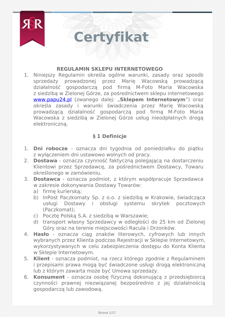 Certyfikat REGULAMIN SKLEPU INTERNETOWEGO 1. Niniejszy Regulamin określa ogólne warunki, zasady oraz sposób sprzedaży prowadzonej przez Marię Wacowską prowadzącą działalność gospodarczą pod firmą M-Foto Maria Wacowska z siedzibą w Zielonej Górze, za pośrednictwem sklepu internetowego www.papu24.pl (zwanego dalej: „Sklepem Internetowym”) oraz określa zasady i warunki świadczenia przez Marię Wacowską prowadzącą działalność gospodarczą pod firmą M-Foto Maria Wacowska z siedzibą w Zielonej Górze usług nieodpłatnych drogą elektroniczną. § 1 Definicje 1. Dni robocze - oznacza dni tygodnia od poniedziałku do piątku z wyłączeniem dni ustawowo wolnych od pracy. 2. Dostawa - oznacza czynność faktyczną polegającą na dostarczeniu Klientowi przez Sprzedawcę, za pośrednictwem Dostawcy, Towaru określonego w zamówieniu. 3. Dostawca - oznacza podmiot, z którym współpracuje Sprzedawca w zakresie dokonywania Dostawy Towarów: a) firmę kurierską; b) InPost Paczkomaty Sp. z o.o. z siedzibą w Krakowie, świadcząca usługi Dostawy i obsługi systemu skrytek pocztowych (Paczkomat); c) Pocztę Polską S.A. z siedzibą w Warszawie; d) transport własny Sprzedawcy w odległości do 25 km od Zielonej Góry oraz na terenie miejscowości Racula i Drzonków. 4. Hasło - oznacza ciąg znaków literowych, cyfrowych lub innych wybranych przez Klienta podczas Rejestracji w Sklepie Internetowym, wykorzystywanych w celu zabezpieczenia dostępu do Konta Klienta w Sklepie Internetowym. 5. Klient - oznacza podmiot, na rzecz którego zgodnie z Regulaminem i przepisami prawa mogą być świadczone usługi drogą elektroniczną lub z którym zawarta może być Umowa sprzedaży. 6. Konsument - oznacza osobę fizyczną dokonującą z przedsiębiorcą czynności prawnej niezwiązanej bezpośrednio z jej działalnością gospodarczą lub zawodową. Strona 1/17 7. Konto Klienta - oznacza indywidualny dla każdego Klienta panel, uruchomiony na jego rzecz przez Sprzedawcę, po dokonaniu przez Klienta Rejestracji i zawarciu umowy świadczenia usługi prowadzenia Konta Klienta. 8. Login - oznacza indywidualne oznaczenie Klienta, przez niego ustalone, składające się z ciągu znaków literowych, cyfrowych lub innych, wymagane wraz z Hasłem do założenia Konta Klienta w Sklepie Internetowym. 9. Przedsiębiorca - oznacza osobę fizyczną, osobę prawną lub jednostkę organizacyjną niebędącą osobą prawną, której ustawa przyznaje zdolność prawną, prowadzącą we własnym imieniu działalność gospodarczą lub zawodową i dokonującą czynności prawnej związaną bezpośrednio z jej działalnością gospodarczą lub zawodową. 10. Regulamin - oznacza niniejszy regulamin. 11. Rejestracja - oznacza czynność faktyczną dokonaną w sposób określony w Regulaminie, wymaganą dla korzystania przez Klienta ze wszystkich funkcjonalności Sklepu Internetowego. 12. Sprzedawca - oznacza Marię Wacowską prowadzącą działalność gospodarczą pod firmą M-Foto Maria Wacowska z siedzibą w Zielonej Górze (66-004), ul. Wincentego Witosa 52B, NIP: 692-125-82-68, REGON: 978067981, wpisaną do Centralnej Ewidencji i Informacji o Działalności Gospodarczej prowadzonej przez Ministra Gospodarki; e-mail: [email protected], będącą jednocześnie właścicielem Sklepu Internetowego. 13. Strona Internetowa Sklepu - oznacza strony internetowe, pod którymi Sprzedawca prowadzi Sklep Internetowy, działające w domenie www.papu24.pl 14. Towar - oznacza produkt przedstawiony przez Sprzedawcę za pośrednictwem Strony Internetowej Sklepu, mogący być przedmiotem Umowy sprzedaży. 15. Trwały nośnik - oznacza materiał lub narzędzie umożliwiające Klientowi lub Sprzedawcy przechowywanie informacji kierowanych osobiście do niego, w sposób umożliwiający dostęp do informacji w przyszłości przez czas odpowiedni do celów, jakim te informacje służą, i które pozwalają na odtworzenie przechowywanych informacji w niezmienionej postaci. 16. Umowa sprzedaży - oznacza umowę sprzedaży zawartą na odległość, na zasadach określonych w Regulaminie, między Klientem a Sprzedawcą. § 2 Postanowienia ogólne i korzystanie ze Sklepu Internetowego Strona 2/17 1. Wszelkie prawa do Sklepu Internetowego, w tym majątkowe prawa autorskie, prawa własności intelektualnej do jego nazwy, jego domeny internetowej, Strony Internetowej Sklepu, a także do wzorców, formularzy, logotypów zamieszczanych na Stronie Internetowej Sklepu (za wyjątkiem logotypów i zdjęć prezentowanych na Stronie Internetowej Sklepu w celach prezentacji towarów, do których to prawa autorskie należą do podmiotów trzecich) należą do Sprzedawcy, a korzystanie z nich może następować wyłącznie w sposób określony i zgodny z Regulaminem oraz za zgodą Sprzedawcy wyrażoną na piśmie. 2. Sprzedawca dołoży starań, aby korzystanie ze Sklepu Internetowego było możliwe dla użytkowników Internetu z użyciem wszystkich popularnych przeglądarek internetowych, systemów operacyjnych, typów urządzeń oraz typów połączeń internetowych. Minimalne wymagania techniczne umożliwiające korzystanie ze Strony Internetowej Sklepu to przeglądarka internetowa w wersji co najmniej Internet Explorer 11 lub Chrome 39 lub FireFox 34 lub Opera 26 lub Safari 5 lub nowszych, z włączoną obsługą języka Javascript, akceptująca pliki typu „cookies” oraz łącze internetowe o przepustowości co najmniej 256 kbit/s. Strona Internetowa Sklepu jest zoptymalizowana dla minimalnej rozdzielczości ekranu 1024x768 pikseli. 3. Sprzedawca stosuje mechanizm plików "cookies", które podczas korzystania przez Klientów ze Strony Internetowej Sklepu, zapisywane są przez serwer Sprzedawcy na dysku twardym urządzenia końcowego Klienta. Stosowanie plików "cookies" ma na celu poprawne działanie Strony Internetowej Sklepu na urządzeniach końcowych Klientów. Mechanizm ten nie niszczy urządzenia końcowego Klienta oraz nie