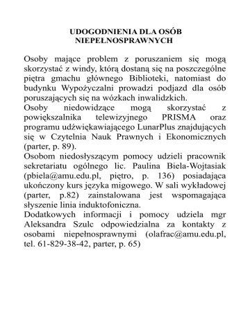 UDOGODNIENIA DLA OSÓB NIEPEŁNOSPRAWNYCH Osoby mające problem z poruszaniem się mogą skorzystać z windy, którą dostaną się na poszczególne piętra gmachu głównego Biblioteki, natomiast do budynku Wypożyczalni prowadzi podjazd dla osób poruszających się na wózkach inwalidzkich. Osoby niedowidzące mogą skorzystać z powiększalnika telewizyjnego PRISMA oraz programu udźwiękawiającego LunarPlus znajdujących się w Czytelnia Nauk Prawnych i Ekonomicznych (parter, p. 89). Osobom niedosłyszącym pomocy udzieli pracownik sekretariatu ogólnego lic. Paulina Biela-Wojtasiak ([email protected], piętro, p. 136) posiadająca ukończony kurs języka migowego. W sali wykładowej (parter, p.82) zainstalowana jest wspomagająca słyszenie linia induktofoniczna. Dodatkowych informacji i pomocy udziela mgr Aleksandra Szulc odpowiedzialna za kontakty z osobami niepełnosprawnymi ([email protected], tel. 61-829-38-42, parter, p. 65)