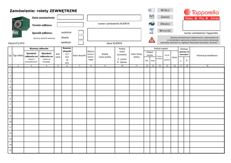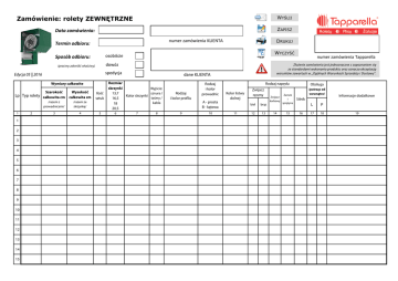 Zamówienie: rolety ZEWNĘTRZNE WYŚLIJ Data zamówienia: ZAPISZ numer zamówienia KLIENTA Termin odbioru: dowóz (prosimy zakreślić właściwy) spedycja Edycja 05 || 2016 Wymiary całkowite Szerokość 1 1 2 3 4 5 6 7 8 9 10 11 12 13 14 15 2 WYCZYŚĆ osobiście Sposób odbioru: Wysokość Lp Typ rolety całkowita cm całkowita cm /razem z prowadnicami/ /razem ze skrzynką/ 3 4 DRUKUJ Ilość sztuk 5 dane KLIENTA Rozmiar skrzynki Wyjście: sznura / 13,7 Kolor skrzynki taśmy / 16,5 kabla 18 20,5 6 7 8 Rodzaj i kolor profilu 9 Rodzaj i kolor prowadnic A - prosta B - kątowa 10 numer zamówienia Tapparella Złożenie zamówienia jest jednoznaczne z zapoznaniem się ze standardami wykonania produktu oraz oznacza akceptację warunków zawartych w „Ogólnych Warunkach Sprzedaży i Dostawy". Rodzaj napędu Kolor listwy dolnej 11 Zwijacz ręczny biel brąz 12 13 Obsługa /patrząc od wewnątrz/ Zwijacz korbowy Zamek i sprężyna Silnik 14 15 16 L P 17 18 Informacje dodatkowe 19 Zamówienie: rolety ZEWNĘTRZNE Wymiary całkowite Szerokość Wysokość Ilość sztuk Lp Typ rolety całkowita cm całkowita cm /razem z prowadnicami/ /razem ze skrzynką/ 1 2 3 4 5 1 SK 45 130 160 2 przykład wypełnionego zamówienia Rozmiar skrzynki Wyjście: sznura / 13,7 Kolor skrzynki taśmy / 16,5 kabla 18 20,5 Rodzaj i kolor profilu Rodzaj i kolor prowadnic A - prosta B - kątowa Rodzaj napędu Kolor listwy dolnej 7 8 9 10 11 ciemny brąz 2 c.brąz A - c.brąz c.brąz 6 przykład wypełnionego zamówienia UWAGI: Kolumna 2 - prosimy wpisać odpowiedni model rolety jako symbol. Zwijacz ręczny biel brąz 12 13 Zwijacz korbowy Zamek i sprężyna Silnik 14 15 16 X przykład wypełnionego zamówienia Kolumna 3 i 4 - prosimy wpisać wymiary w cm jako wymiary całkowite rolet. Szerokość cakowita rozumiana jest jako szerokość rolety razem z prowadnicami (standardowe prowadnice mają 5,5cm szerokości - przy montażu na murze/elewacji należy doliczyć min. 11cm do szerokości wnęki). SK 45 Skrzynka standardowa 45 stopni Wysokość całkowita rozumiana jest jako wysokość rolety razem ze skrzynką. Kolumna 6 - prosimy wpisać rozmiar skrzynki. Standardowe rozmiary skrzynek w cm: 13,7; 16,5; 18; 20,5 L P 17 18 X X Informacje dodatkowe 19 przykład wypełnionego zamówienia Kolumna 2: Model rolety zewnętrznej SK45 lub SK45 M (z moskitierą), SKP lub SKP M, SKO lub SKO M Kolumna 5 - prosimy wpisać ilość sztuk. Obsługa /patrząc od wewnątrz/ Kolumna 8: Wyjście sznura / taśmy / kabla Zalecany i standardowo stosowany jest typ 2. SKP Skrzynka podtynkowa SKO Skrzynka owalna 1 3 2 4 Kolumna 7 - prosimy wpisać kolor skrzynki. W przypadku rolety SKP (podtynkowej) kolorem skrzynki jest kolor klapy rewizyjnej. Kolumna 8 - prosimy wpisać symbol wyjścia sznura / taśmy / kabla. Zalecany i standardowo stosowany jest typ nr 2. Kolumna 10: Rodzaj prowadnic UWAGA: Wybór wyjścia sznura/taśmy jako typ 1 powoduje dużo szybsze zużycie sznurka/taśmy. Kolumna 9 - prosimy wpisać rodzaj i kolor profilu według wzornika. Kolumna 10 - prosimy wpisać rodzaj (A - prosta, B - kątowa) i kolor prowadnic. Standardowo stosowana jest prowadnica A - prosta. A Prowadnica prosta - standard B Prowadnica kątowa Kolumna 11 - prosimy wpisać kolor listwy dolnej. Kolumna 12 do 16 - prosimy zaznaczyć "X" odpowiedni rodzaj napędu (w tym kolor zwijacza - jeśli dotyczy). Kolumna 17 i 18 - prosimy zaznaczyć "X" stronę obsługi (patrząc od wewnątrz). Kolumna 19 - prosimy wpisać dodatkowe uwagi dot. zamówienia: np. zwijacz wewnętrzny do 9m, rygiel automatyczny, zamek baskwilowy, przełącznik klawiszowy lub kluczykowy, silnik radiowy, silnik NHK + wyjście korby, silnik z przeciążeniem, rodzaj pilota, wieszaki blokujące, stopki do prowadnic, odbojniki Uwaga: Przy zestawach dwóch lub trzech rolet w jednej skrzynce należy wykonać szkic rolety patrząc od wewnątrz. Należy również zaznaczyć strony sterowania. Wymiary poszczególnych rolet w zestawach prosimy podawać do osi styku prowadnic. Zestawy rolet - typy Zestawy rolet - dwie rolety w jednej skrzynce - Typ 2 Zestawy rolet - trzy rolety w jednej skrzynce - Typ 3