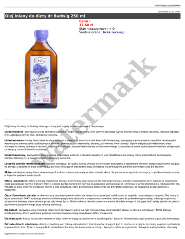 Informacje o produkcie Utworzono 02-03-2017 Olej lniany do diety dr Budwig 250 ml Cena : 17,60 zł er m ar k Stan magazynowy : < 0 Średnia ocena : brak recenzji Olej lniany do diety dr Budwig nieoczyszczony jest bogaty w kwasy omega-3, wspomaga: at Układ krążenia- przyczynia się do obniżenia poziomu "złego" cholesterolu, tym samym obniżająć ryzyko chorób serca i układu krążenia, redukcję lepkości krwi, agregację płytek krwi, obniżenie ciśnienia. Układ nerwowy- kwasy tłuszczowe w oleju lnianym, a zwłaszcza zawarty w nim kwas alfa-linolenowy, pomagają w przenoszeniu impulsów nerwowych i wpływają na zmniejszenie uszkodzonych nerwów, powodujących drętwienie, drżenie, jak również inne choroby. Wpływ odżywczych właściwości oleju lnianego na nerwy pomaga w leczeniu choroby Parkinsona, zwyrodniałej choroby układu nerwowego i zabezpiecza przed uszkodzeniem nerwów związanych z cukrzycą i stwardnieniem rozsianym. w Układ trawienny- spożywanie oleju lnianego wspomaga leczenie w stanach zapalnych jelit. Dodatkowo olej lniany może uniemożliwić powstawanie kamieni żółciowych, a nawet rozpuścic istniejące kamienie. Leczenie chorób reumatycznych- badania wykazują, że ludzie, którzy chorują na artretyzm powiązany z zapaleniem stawów, bardzo pozytywnie reagują na omega-3 zawarte w oleju lnianym. Już po kilku miesiącach stosowania oleju stwierdza się zmniejszoną poranną sztywność oraz ból stawów. Skóra- niezbędne kwasy tłuszczowe omega-3 w dużej mierze wpływają na stan zdrowia skóry. Są pomocne w egzemie, łuszczycy, trądziku różowatym oraz w leczeniu oparzeń słonecznych. Włosy i paznokcie- obfity w kwasy tłuszczowe omega-3 olej lniany przyczynia się do zdrowego wzrostu włosów (niski poziom tych kwasów w organizmie może powodować suche i matowe włosy), a także bardzo korzystnie wpływa na paznokcie wzmacniając je i chroniąc je przed złamaniem i rozdwajaniem się. Ponadto w oleju lnianym występuje enzym 5-alfa reduktaza, który przekształca testosteron do dihydrotestosteronu, co spowalnia proces łysienia u mężczyzn. Ciąża i karmienie piersią- w okresie ciąży zapotrzebowanie kobiet na kwasy tluszczowe jest zwiększone ze względu na rozwijający się płód. Olej lniany o dużej zawartości NNKT wykazuje wielokierunkowe pozytywne działanie w organizmie człowieka, konieczne do prawidłowego rozwoju młodego organizmu i utrzymania dobrego stanu zdrowia przez cały okres życia. Mleko kobiece również zawiera w swoim składzie omega-3, ale jego ilość zależy jednak od jakości pożywienia przyjmowanego prze kobietę karmiącą. Dla kobiet- zażywanie oleju lnianego może mieć pozytywny wpływ na cykl miesiączkowy oraz łagodzić objawy w okresie menopauzy. NNKT blokują prostaglandyny, które uwalniane podczas miesiączkowania mogą powodować obfite krwawienie. Dla mężczyzn- kwasy tłuszczowe zawarte w oleju lnianym mogą być pomocne w zapobieganiu i leczeniu farmakologicznym przerostu gruczołu krokowego. Zdrowie dzieci i młodzieży- dzieci szczególnie potrzebują odpowiednich ilości kwasów omega-3. Jest to istotne ze względu, że młody organizm potrzebuje odpowiednich ilości DHA ( z omega-3) do prawidłowej budowy sieci neuronów w mózgu. Kwasy te pełnią w organizmie niezwykle ważną funkcję, stanowią Wygenerowano w programie www.oscGold.com istotny składnik mózgu, komórek nerwowych, komórek mięśnia sercowego i siatkówki oka. (Karol Minkowski 2008). Przy niedoborze kwasów omega-3, organizm zaczyna wykorzystywać do budowy neuronów trans izomery. Efektem tego jest źle pracująca sieć neuronów, która rozwija się wolno. U dzieci mogą wówczas pojawić się problemy z pamięcią, koncentracją i zachowaniem (nadpobudliwość). Zdrowie oczu- badania wykazały, że NNKT omega-3 mogą zmniejszyć ryzyko wystąpienia zwyrodnienia plamki żółtej choroby oczu, która niszczy wizję poprzez uszkodzenie komórek nerwowych w oku. Wyniki pokazują również, że osoby które miały wysoki poziom omega-6 były bardziej narażone na wystąpienie tej choroby. w at er m ar k Zdrowie psychiczne- mózg ludzki zbudowany jest z ponad 60% tłuszczów, w tym 25% to kwasy omega-3. Dopamina i serotonina- nazywane hormonami szczęścia, składają się z odmiany omega-3 (DHA). Brak odpowiednich ilości omega-3 w organizmie może powodować zaburzenia nastroju, stany depresyjne lub problemy z koncentracją.