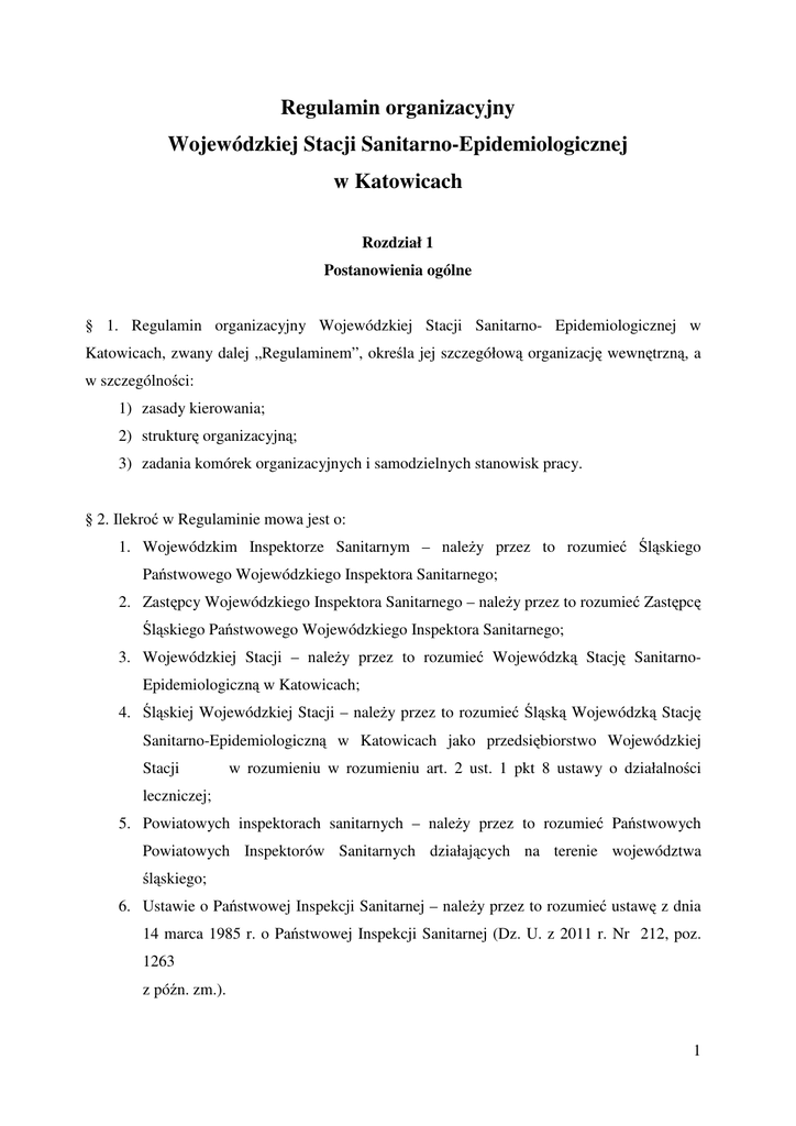 Regulamin organizacyjny Wojewódzkiej Stacji Sanitarno-Epidemiologicznej w Katowicach Rozdział 1 Postanowienia ogólne § 1. Regulamin organizacyjny Wojewódzkiej Stacji Sanitarno- Epidemiologicznej w Katowicach, zwany dalej „Regulaminem”, określa jej szczegółową organizację wewnętrzną, a w szczególności: 1) zasady kierowania; 2) strukturę organizacyjną; 3) zadania komórek organizacyjnych i samodzielnych stanowisk pracy. § 2. Ilekroć w Regulaminie mowa jest o: 1. Wojewódzkim Inspektorze Sanitarnym – należy przez to rozumieć Śląskiego Państwowego Wojewódzkiego Inspektora Sanitarnego; 2. Zastępcy Wojewódzkiego Inspektora Sanitarnego – należy przez to rozumieć Zastępcę Śląskiego Państwowego Wojewódzkiego Inspektora Sanitarnego; 3. Wojewódzkiej Stacji – należy przez to rozumieć Wojewódzką Stację SanitarnoEpidemiologiczną w Katowicach; 4. Śląskiej Wojewódzkiej Stacji – należy przez to rozumieć Śląską Wojewódzką Stację Sanitarno-Epidemiologiczną w Katowicach jako przedsiębiorstwo Wojewódzkiej Stacji w rozumieniu w rozumieniu art. 2 ust. 1 pkt 8 ustawy o działalności leczniczej; 5. Powiatowych inspektorach sanitarnych – należy przez to rozumieć Państwowych Powiatowych Inspektorów Sanitarnych działających na terenie województwa śląskiego; 6. Ustawie o Państwowej Inspekcji Sanitarnej – należy przez to rozumieć ustawę z dnia 14 marca 1985 r. o Państwowej Inspekcji Sanitarnej (Dz. U. z 2011 r. Nr 212, poz. 1263 z późn. zm.). 1 Rozdział 2 Zasady kierowania § 3. 1. Wojewódzka Stacja jest aparatem pomocniczym Wojewódzkiego Inspektora Sanitarnego, który jest jednocześnie Dyrektorem Wojewódzkiej Stacji. 2. Wojewódzki Inspektor Sanitarny wykonuje swoje zadania przy pomocy: − Zastępcy Wojewódzkiego Inspektora Sanitarnego - który jest także Zastępcą Dyrektora Wojewódzkiej Stacji; − Głównego Księgowego; − kierowników komórek organizacyjnych i osób zatrudnionych na samodzielnych stanowiskach pracy. 3. Wojewódzki Inspektor Sanitarny kieruje działalnością Wojewódzkiej Stacji w sposób zapewniający jej prawidłowe funkcjonowanie oraz reprezentuje ją na zewnątrz. 4. W czasie nieobecności Wojewódzkiego Inspektora Sanitarnego zastępuje go Zastępca Wojewódzkiego Inspektora Sanitarnego, który przejmuje zadania i kompetencje Wojewódzkiego Inspektora Sanitarnego w pełnym zakresie. 5. W przypadku nieobecności zarówno Wojewódzkiego Inspektora Sanitarnego, jaki i jego Zastępcy, zadania i kompetencje Wojewódzkiego Inspektora Sanitarnego wykonuje upoważniony pracownik Wojewódzkiej Stacji, w zakresie określonym w upoważnieniu. 6. Wojewódzka Stacja realizuje działalność leczniczą za pomocą przedsiębiorstwa w rozumieniu art. 2 ust. 1 pkt 8 ustawy o działalności leczniczej, pod nazwą „Śląska Wojewódzka Stacja Sanitarno- Epidemiologiczna”. 7. Wojewódzka Stacja może prowadzić działalność wykraczającą poza działalność podstawową polegającą na świadczeniu usług w zakresie diagnostyki laboratoryjnej oraz profilaktyki, a rodzaj usług i wysokość opłat pobieranych z tego tytułu określa zarządzenie Dyrektora. § 4. Do zadań i kompetencji Wojewódzkiego Inspektora Sanitarnego należy: 1. Określanie kierunków działania oraz sprawowanie nadzoru nad realizacją zadań wykonywanych przez Wojewódzką Stację, określonych w ustawie o Państwowej Inspekcji Sanitarnej i w przepisach odrębnych; 2. Sprawowanie nadzoru merytorycznego i finansowego nad powiatowymi stacjami sanitarno-epidemiologicznymi; 2 3. Pełnienie w stosunku do pracowników Wojewódzkiej Stacji funkcji pracodawcy w rozumieniu przepisów ustawy z dnia 26 czerwca 1974 r. Kodeks pracy (Dz. U. z 1998 r. Nr 21, poz. 94, z późn. zm.); 4. Kształtowanie przez doskonalenie i realizacja polityki jakości; 5. Wydawanie decyzji administracyjnych i postanowień, a także innych dokumentów w postępowaniu administracyjnym i egzekucyjnym w administracji; 6. Rozpatrywanie skarg i wniosków; 7. Udzielanie pracownikom Wojewódzkiej Stacji upoważnień do: − wydawania decyzji administracyjnych i postanowień oraz do podpisywania korespondencji w ustalonym zakresie, − wykonywania czynności kontrolnych i do nakładania mandatów karnych; 8. Udzielanie pracownikom Wojewódzkiej Stacji pełnomocnictw do dokonywania określonych czynności prawnych; 9. Wydawanie zarządzeń, poleceń służbowych i komunikatów; 10. Ustalanie ogólnych kierunków działania Państwowej Inspekcji Sanitarnej na szczeblu powiatowym, zatwierdzanie regulaminów organizacyjnych oraz planów zasadniczych przedsięwzięć; 11. Sprawowanie nadzoru nad sporządzeniem planu zasadniczych przedsięwzięć Wojewódzkiej Stacji oraz sprawozdania z jego realizacji; 12. Kształtowanie i realizacja polityki kadrowej z uwzględnieniem potrzeb szkoleniowych; 13. Zawieranie porozumień z innymi organami administracji publicznej; 14. Zawieranie umów cywilno-prawnych; 15. Dysponowanie środkami budżetowymi; 16. Sprawowanie nadzoru w zakresie ochrony informacji niejawnych 17. Kierowanie realizacją zadań obronnych; 18. Sprawowanie funkcji administratora danych dla zbiorów przetwarzanych w Wojewódzkiej Stacji; 19. Zapewnienie funkcjonowania adekwatnej, skutecznej i efektywnej kontroli zarządczej. 3 § 5. Zastępca Wojewódzkiego Inspektora Sanitarnego nadzoruje zadania realizowane przez Dział Nadzoru Sanitarnego. Szczegółowy zakres zadań i kompetencji Zastępcy Wojewódzkiego Inspektora Sanitarnego określa zakres czynności, ustalony przez Wojewódzkiego Inspektora Sanitarnego. § 6. 1. Pracą komórek organizacyjnych - działów, oddziałów, sekcji i pracowni - kierują kierownicy, do zadań których należy w szczególności: 1) kierowanie działalnością podległych im komórek organizacyjnych; 2) zapewnienie właściwej organizacji pracy w podległych komórkach organizacyjnych; 3) wstępne akceptowanie sposobu załatwienia sprawy, w 