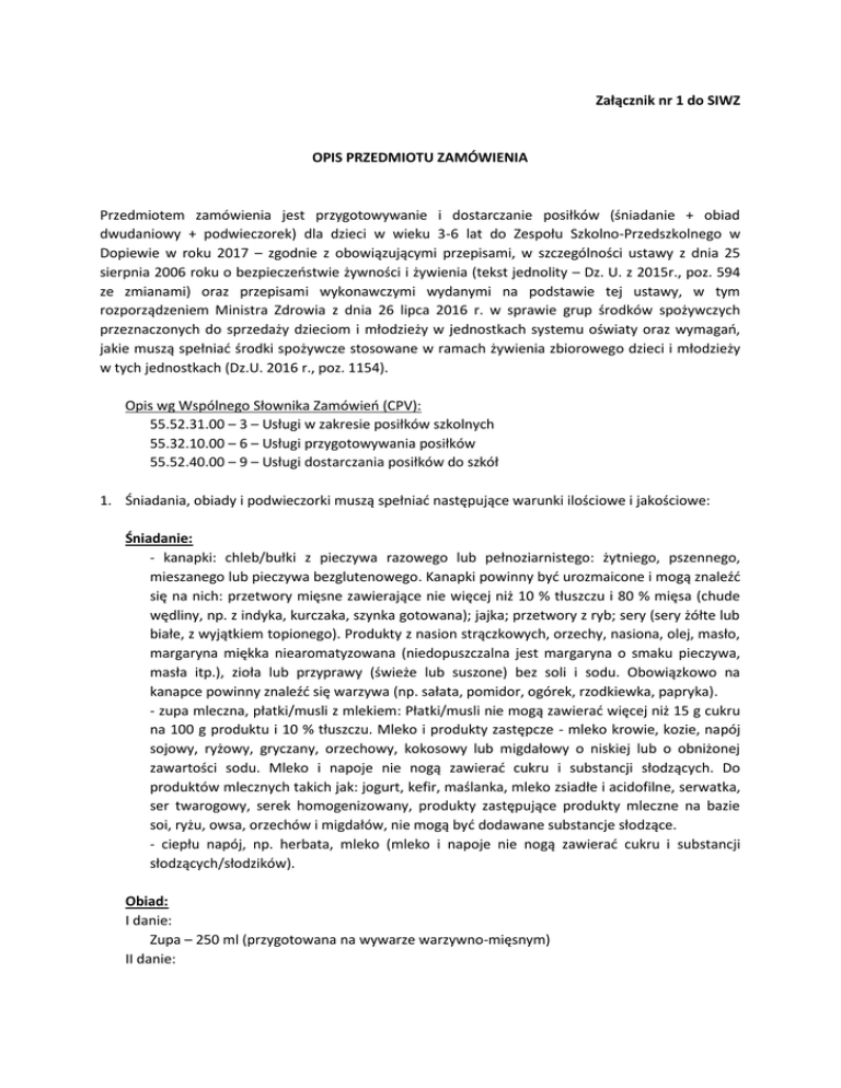 Załącznik nr 1 do SIWZ OPIS PRZEDMIOTU ZAMÓWIENIA Przedmiotem zamówienia jest przygotowywanie i dostarczanie posiłków (śniadanie + obiad dwudaniowy + podwieczorek) dla dzieci w wieku 3-6 lat do Zespołu Szkolno-Przedszkolnego w Dopiewie w roku 2017 – zgodnie z obowiązującymi przepisami, w szczególności ustawy z dnia 25 sierpnia 2006 roku o bezpieczeństwie żywności i żywienia (tekst jednolity – Dz. U. z 2015r., poz. 594 ze zmianami) oraz przepisami wykonawczymi wydanymi na podstawie tej ustawy, w tym rozporządzeniem Ministra Zdrowia z dnia 26 lipca 2016 r. w sprawie grup środków spożywczych przeznaczonych do sprzedaży dzieciom i młodzieży w jednostkach systemu oświaty oraz wymagań, jakie muszą spełniać środki spożywcze stosowane w ramach żywienia zbiorowego dzieci i młodzieży w tych jednostkach (Dz.U. 2016 r., poz. 1154). Opis wg Wspólnego Słownika Zamówień (CPV): 55.52.31.00 – 3 – Usługi w zakresie posiłków szkolnych 55.32.10.00 – 6 – Usługi przygotowywania posiłków 55.52.40.00 – 9 – Usługi dostarczania posiłków do szkół 1. Śniadania, obiady i podwieczorki muszą spełniać następujące warunki ilościowe i jakościowe: Śniadanie: - kanapki: chleb/bułki z pieczywa razowego lub pełnoziarnistego: żytniego, pszennego, mieszanego lub pieczywa bezglutenowego. Kanapki powinny być urozmaicone i mogą znaleźć się na nich: przetwory mięsne zawierające nie więcej niż 10 % tłuszczu i 80 % mięsa (chude wędliny, np. z indyka, kurczaka, szynka gotowana); jajka; przetwory z ryb; sery (sery żółte lub białe, z wyjątkiem topionego). Produkty z nasion strączkowych, orzechy, nasiona, olej, masło, margaryna miękka niearomatyzowana (niedopuszczalna jest margaryna o smaku pieczywa, masła itp.), zioła lub przyprawy (świeże lub suszone) bez soli i sodu. Obowiązkowo na kanapce powinny znaleźć się warzywa (np. sałata, pomidor, ogórek, rzodkiewka, papryka). - zupa mleczna, płatki/musli z mlekiem: Płatki/musli nie mogą zawierać więcej niż 15 g cukru na 100 g produktu i 10 % tłuszczu. Mleko i produkty zastępcze - mleko krowie, kozie, napój sojowy, ryżowy, gryczany, orzechowy, kokosowy lub migdałowy o niskiej lub o obniżonej zawartości sodu. Mleko i napoje nie nogą zawierać cukru i substancji słodzących. Do produktów mlecznych takich jak: jogurt, kefir, maślanka, mleko zsiadłe i acidofilne, serwatka, ser twarogowy, serek homogenizowany, produkty zastępujące produkty mleczne na bazie soi, ryżu, owsa, orzechów i migdałów, nie mogą być dodawane substancje słodzące. - ciepłu napój, np. herbata, mleko (mleko i napoje nie nogą zawierać cukru i substancji słodzących/słodzików). Obiad: I danie: Zupa – 250 ml (przygotowana na wywarze warzywno-mięsnym) II danie: - posiłek mięsny / rybny (70 g), przy czym mięso min. 3 razy w tygodniu oraz porcja ryby co najmniej raz w tygodniu + zamiennie podawane: ziemniaki / kasza / ryż / makaron (120 g) + sos + surówki / jarzyny gotowane (100 g). Produkty zbożowe (np. kasze, ryże, makarony) i ziemniaki na obiad powinny być serwowane co najmniej trzy razy w tygodniu. Od poniedziałku do piątku mogą być podawane nie więcej niż dwie porcje potrawy smażonej, przy czym do smażenia jest używany olej roślinny rafinowany o zawartości kwasów jednonienasyconych powyżej 50 % i zawartości kwasów wielonienasyconych poniżej 40 %. Warzywa powinny być podawane do każdego obiadu; muszą także być zróżnicowane - co najmniej trzy lub więcej rodzajów warzyw tygodniowo. - danie jarskie / bezmięsne (np. pierogi, kluski, naleśniki) – 120 g. - do każdego obiadu kompot / sok / napój – 250 ml. Kompot / sok / napój nie nogą zawierać cukru i substancji słodzących/słodzików. Posiłki nie mogą być przygotowywane z półproduktów. Muszą być wykonane ze świeżych artykułów spożywczych, posiadających aktualne daty ważności. Nie dopuszcza się stosowania mięsa tzw. MOM (mięso oddzielone mechanicznie), produktów typu instant, gotowych produktów typu gołąbki, pulpety, pierogi. Podwieczorek: - owoce (np. jabłko, banan, owoce sezonowe) lub sałatki owocowe; min. waga owocu nie mniej niż 70 g/osobę; - warzywa do chrupania (np. marchewka); - desery mleczne (np. serek, jogurt, kaszka manna na słodko, kasza jaglana, budyń); - kisiel z soku owocowego, galaretka -kanapki, wafle ryżowe 2. Zamawiający szacuje, że maksymalna liczba dostarczanych posiłków to: - w okresie od 01.01.2017r. do 31.08.2017r.: dziennie 65 porcji śniadań, 55 porcji obiadowych oraz 25 porcji podwieczorków; - w okresie od 01.09.2017r. do 31.12.2017r.: dziennie 90 porcji śniadań, 80 porcji obiadowych oraz 50 porcji podwieczorków; Zamawiający zastrzega możliwość zmniejszenia zamawianych posiłków w trakcie trwania umowy z powodu nieobecności dzieci w przedszkolu lub rezygnacji uczęszczania do przedszkola, oraz w okresie od 03.07.2017r. – 21.07.2017r. oraz od 14.08.2017r. do 31.08.2017r. – podczas wakacyjnej przerwy, gdy przedszkole nie pracuje. 3. Zamawiający planuje, że w trakcie trwania umowy (od dnia podpisania umowy, ale nie wcześniej niż od dnia 02.01.2017r. do 31.12.2017r.) należy dostarczyć: 14225 szt. śniadań, 12325 szt. obiadów dwudaniowych oraz 6625 szt. podwieczorków. 4. Umowa na przedmiotowe zamówienie będzie realizowana w okresie od dnia podpisania umowy do dnia 31.12.2017r. z uwzględnieniem dni wolnych i przerw świątecznych. 5. Ilość posiłków uzależniona będzie od ilości dzieci obecnych w danym dniu w przedszkolu. Zapotrzebowanie na dany dzień składane będzie telefonicznie lub za pomocą maila przez upoważnionego przedstawiciela Zamawiającego do godz. 8:20 danego dnia z możliwością korekty ilości dostarczanych posiłków do godz. 9:20. 6. Wykonawca zobowiązuje się dostosować okazjonalnie godziny dostarczania posiłków do potrzeb przedszkola (np. w dniu wycieczki, imprezy w przedszkolu itp.). Za