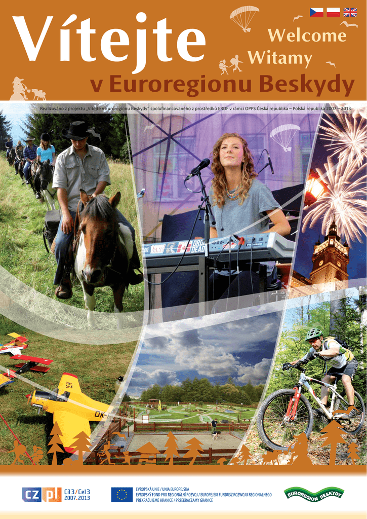 Vítejte Welcome Witamy v Euroregionu Beskydy Realizováno z projektu „Vítejte v Euroregionu Beskydy“ spolufinancovaného z prostředků ERDF v rámci OPPS Česká republika – Polská republika 2007 – 2013 Dębowiec – Bielsko-Bialski Ośrodek Rekreacyjno-Narciarski Na Dębowcu, w granicach administracyjnych Bielska-Białej, od 18 stycznia 2013 r. rozpoczął funkcjonowanie „Bielsko-Bialski Ośrodek Rekreacyjno-Narciarski”. Zainstalowano tam przy naśnieżanym i oświetlanym stoku narciarskim wyciąg kanapowy o długości 600 m, jak również wyciąg zaczepowy dla dzieci o długości 84 m. Powstał także park linowy, plac zabaw dla dzieci wyposażony m.in. w piramidę wspinaczkową, huśtawki, skałkę i ściankę wspinaczkową, karuzelę itp. Ponadto na stoku Dębowca powstały: ścieżka dydaktyczno – przyrodnicza z 6 tablicami informacyjnymi, siłownia terenowa. W sezonie letnim ośrodek, oprócz kolejki linowej oraz parku linowego, oferuje wiele innych atrakcji. Przy dolnej stacji kolei znajduje się darmowa siłownia na świeżym powietrzu, czynna 24h/dobę. O kondycję mogą tu zadbać bezpieczny sposób juniorzy i seniorzy. Zamontowany zestaw urządzeń sprawnościowych, zapewnia pełen zakres ćwiczeń rekreacyjnych całego ciała. W pobliżu znajduje się również ogólnodostępne boisko do gier zespołowych, przystosowane do gry w piłkę siatkową, ręczną, koszykową i nożną. Powyżej górnej stacji kolejki przy schronisku skąd można podziwiać panoramę Biel- ska-Białej i okolic znajduje się miejsce dla rodzin z dziećmi. Przygotowano tu dla nich wysypany piaskiem plac zabaw z trzema ściankami wspinaczkowymi, karuzelami, huśtawkami etc. Dla turystów chcących poczuć wiatr we włosach na Dębowcu znajduje sie również całoroczny tor saneczkowy. Dębowiec – Bielsko-Bialské rekreační lyžařské středisko V Dębowci, v administra vním území Bielsko-Biala, začalo 18. ledna 2013 fungovat Bielsko-Bialské rekreační lyžařské středisko. U zasněžovaného a osvětleného lyžařského kopce byla zprovozněna sedačková lanovka o délce 600 m a také vlek pro dě o délce 84 m. Vznikl zde také lanový park, dětské hřiště vybavené mimo jiné horolezeckou pyramidou, houpačkami, skálou a horolezeckou stěnou, kolotočem atd. Na kopci Dębowiec vznikla navíc přírodně naučná stezka s informa vními tabulemi a místo pro posilování. V letní sezóně středisko, vedle lanovky a lanového parku, nabízí mnoho dalších atrakcí. Vedle dolní stanice lanovky se nachází posilovna na čerstvém vzduchu s volným přístupem a provozem 24 hodin denně. O svou kondici zde mohou pečovat bezpečným způsobem senioři i junioři. Instalované fitness vybavení umožňuje řadu rekreačních cvičení pro celé tělo. Nedaleko se nachází také veřejné hřiště pro kolek vní sporty, přizpůsobené na volejbal, házenou, basketbal a fotbal. Nad horní stanicí lanovky je místo s přístřeškem, vhodné pro rodiny s dětmi, kde je možno obdivovat panorama Bielsko-Biala a okolí. Je zde pro ně připraveno místo vysypané pískem se spoustou atrakci, se třemi horolezeckými stěnami, kolotoči, houpačkami atd. Pro turisty, kteří chtějí cí t vítr ve vlasech, je na Dębowci také celoroční sáňkařská dráha. Dębowiec – A Ski Resort in the District of Bielsko-Biała In the village of Dębowiec, which lies in the administra ve district of Bielsko-Biała town, a ski holiday resort started to be in opera on on 18th January 2013. A 600-metre-long chairlift and a 84-metre-long children´s lift operate at a snowcovered and lit ski slope. There is also a rope park, a children´s playground equipped, among others, with a climbing pyramid, swings, a rock, a climbing wall, and a roundabout, etc. A nature trail with informa on panels and a place for weight training can be found on the hill of Dębowiec as well. Besides the chairli and rope park, the resort offers many other a rac ons in summer season. An open-air fitness gym is situated next to the lower sta on of the chairli , the access to it is free and it is open 24 hours a day. Seniors as well as juniors can keep fit there in a risk-free way thanks to the fitness equipment that enables many kinds of fitness exercises for all the body. Public courts for team sports such as volleyball, handball, basketball and football are situated nearby. Above the upper sta on of the chairli , there is a sheltered sea ng suitable also for families with children, where you can admire the panorama of the town of Bielsko-Biała and its surroundings. A place with sand and plenty of a rac ons, three climbing walls, roundabouts and swings, etc. are prepared there for them. For those tourists, who love the feeling of the wind in their hair, there is a year-round open toboggan run. Jazda konna Pobyt dla rodzin z dziećmi w gospodarstwie agroturystycznym, z nauką jazdy konnej, zabawami na świeżym powietrzu, wieczornym ogniskiem. Stadniny koni znajdują się w: Kozach (stadniny na Wirażu i Koziańskie Wierchy), Międzyrzeczu Górnym (Ośrodek Nauki Jazdy Konnej), Roztropicach (Stajnia „Lasowisko”), Szczyrku, Wilamowicach oraz w Mazańcowicach. Warto wybrać się na wyprawę w siodle po pobliskich lasach, łąkach i pagórkach. Dzięki temu można nie tylko poświecić czas swojemu ulubionemu hobby, ale także zwiedzić okolicę. Miłośnicy jazdy konnej mogą wybrać się do Wilamowic czy Starej Wsi, gdzie znajdują się gospodarstwa agroturystyczne oferujące naukę jazdy konnej. Właściciele dysponują miejscami noclegowymi. Oferują również własne zdrowe warzywa i przetwory spożywcze, a miejscowi rzemieślnicy wspaniałe pieczywo i wyroby wędliniarskie przygotowywane tradycyjnymi metodami przekazywanymi z pokolenia na pokolenie. Istnieje również możliwość grillowania i wędkowania przy niezwykle urokliwych stawach rybnych zajmujących powierzchnię ponad 200 ha. Także po