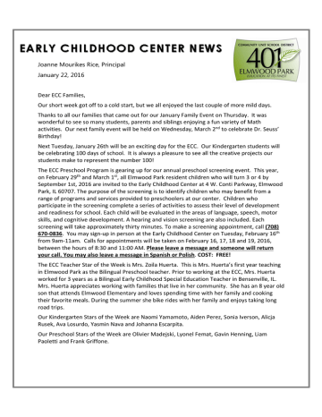 Joanne Mourikes Rice, Principal January 22, 2016 Dear ECC Families, Our short week got off to a cold start, but we all enjoyed the last couple of more mild days. Thanks to all our families that came out for our January Family Event on Thursday. It was wonderful to see so many students, parents and siblings enjoying a fun variety of Math activities. Our next family event will be held on Wednesday, March 2nd to celebrate Dr. Seuss’ Birthday! Next Tuesday, January 26th will be an exciting day for the ECC. Our Kindergarten students will be celebrating 100 days of school. It is always a pleasure to see all the creative projects our students make to represent the number 100! The ECC Preschool Program is gearing up for our annual preschool screening event. This year, on February 29th and March 1st, all Elmwood Park resident children who will turn 3 or 4 by September 1st, 2016 are invited to the Early Childhood Center at 4 W. Conti Parkway, Elmwood Park, IL 60707. The purpose of the screening is to identify children who may benefit from a range of programs and services provided to preschoolers at our center. Children who participate in the screening complete a series of activities to assess their level of development and readiness for school. Each child will be evaluated in the areas of language, speech, motor skills, and cognitive development. A hearing and vision screening are also included. Each screening will take approximately thirty minutes. To make a screening appointment, call (708) 670-0836. You may sign-up in person at the Early Childhood Center on Tuesday, February 16th from 9am-11am. Calls for appointments will be taken on February 16, 17, 18 and 19, 2016, between the hours of 8:30 and 11:00 AM. Please leave a message and someone will return your call. You may also leave a message in Spanish or Polish. COST: FREE! The ECC Teacher Star of the Week is Mrs. Zoila Huerta. This is Mrs. Huerta’s first year teaching in Elmwood Park as the Bilingual Preschool teacher. Prior to working at the ECC, Mrs. Huerta worked for 3 years as a Bilingual Early Childhood Special Education Teacher in Bensenville, IL. Mrs. Huerta appreciates working with families that live in her community. She has an 8 year old son that attends Elmwood Elementary and loves spending time with her family and cooking their favorite meals. During the summer she bike rides with her family and enjoys taking long road trips. Our Kindergarten Stars of the Week are Naomi Yamamoto, Aiden Perez, Sonia Iverson, Alicja Rusek, Ava Losurdo, Yasmin Nava and Johanna Escarpita. Our Preschool Stars of the Week are Olivier Madejski, Lyonel Femat, Gavin Henning, Liam Paoletti and Frank Griffone. Joanne Mourikes Rice, Directora 22 de enero del 2016 Estimadas Familias del Centro ECC, Nuestra corta semana tuvo un comienzo frio, pero todos disfrutamos de los últimos dos días de temperaturas templadas. Muchísimas gracias a todas las familias que asistieron a nuestro Evento Familiar de enero, este jueves. Fue maravilloso ver a tantos estudiantes, padres y hermanitos, disfrutar de una variedad divertida de actividades de matemáticas. ¡Nuestro próximo evento familiar se estará llevando a cabo el miércoles 2 de marzo para celebrar el cumpleaños del Dr. Seuss! El próximo martes 26 de enero, será un día emocionante para el Centro ECC. Nuestros estudiantes de Kindergarten estarán celebrando los 100 días de clases. ¡Nos da placer ver todos los proyectos creativos que nuestros estudiantes crean, para representar el numero 100! El Programa Preescolar del Centro ECC, se está preparando para nuestro evento anual de pruebas de detección preescolar. Este año, el 29 de febrero y el 1 de marzo, todos los niños que residan en Elmwood Park, quienes sean de 3 o 4 años de edad para el 1ro septiembre del 2016, están invitados a venir al Centro de Educación Temprana Center at 4 W. Conti Parkway, Elmwood Park, IL 60707. El propósito de llevar a cabo esta prueba de detección es identificar a niños/as quienes podrán beneficiarse de una gran variedad de programas y servicios provistos a estudiantes de nuestro Centro. Los niños/as que participen en esta prueba de detección completaran una serie de actividades para asesorar su nivel de desarrollo y preparación para la escuela. Cada niño será evaluado en las áreas de lenguaje, habla, destrezas motoras y desarrollo cognitivo. Esto incluirá un examen del oído y vista. Cada examen tomara aproximadamente treinta minutos. Para hacer una cita para la prueba de detección, favor de llamar al (708) 670-0836. Usted también puede inscribirse en persona en el Centro ECC, el martes 16 de febrero, de 9am-11am. Las llamadas para las citas se tomaran el 16, 17, 18 y 19 de febrero del 2016, dentro de las horas de 8:30 y 11:00 AM. Por favor deje un mensaje y alguien devolverá su llamada. Usted también puede dejar su mensaje en español o en polaco. COSTO: ¡GRATIS! La maestra Estrella de la Semana del Centro ECC es la Señora Zoila Huerta. Este es el primer año de la Señora Huerta de estar ensenando aquí en Elmwood Park como maestra Bilingüe Preescolar. Antes de trabajar en el Centro ECC, la Señora Huerta trabajo por 3 años como maestra bilingüe de Educación Especial Temprana en Bensenville, IL. La Señora Huerta aprecia el poder trabajar con familias que viven en su comunidad. Ella tiene un hijo de 8 años de edad que asiste a Elmwood Elementary. A ella le encanta pasar tiempo con su familia y de cocinar sus comidas favoritas. Durante el verano ella corre bicicleta con su familia y disfruta de viajes largos por carretera. Nuestros estudiantes Estrella de la Semana del Kindergarten son: Naomi Yamamoto, Aiden Perez, Sonia Iverson, Alicja Rusek, Ava Losurdo, Yasmin Nava y Johanna Escarpita. Nuestros estudiantes Estrella de la Semana de Preescolar son: Olivier Madejski, Lyonel Femat, Gavin Henning, Liam Paoletti y Frank Griffone. Joanne Mourikes Rice Dyrektor 22 stycznia 2016 Drodzy Rodzice, Tydzie