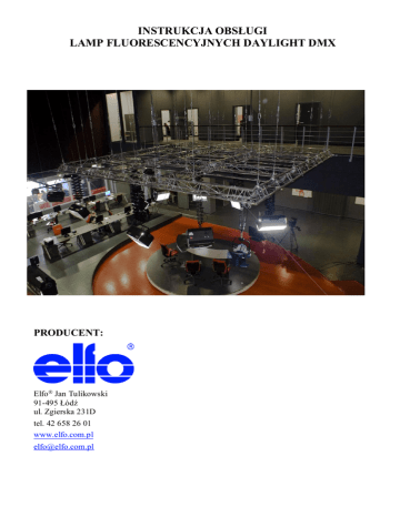 INSTRUKCJA OBSŁUGI LAMP FLUORESCENCYJNYCH DAYLIGHT DMX PRODUCENT: Elfo® Jan Tulikowski 91-495 Łódź ul. Zgierska 231D tel. 42 658 26 01 www.elfo.com.pl [email protected] Lampy fluorescencyjne są produkowane w dwóch wielkościach ze względu na ilość świetlówek. DL100 są to oprawy z dwoma świetlówkami (rysunek 1) natomiast DL200 są większe i mają cztery świetlówki (rysunek 2). Każda z opraw może mieć czarne lub srebrne wrota. System sterowania jest identyczny w obu oprawach i oparty na standardzie DMX 512. Każda oprawa ma autonomiczny regulator jasności świecenia z wyświetlaczem typu LED (rysunek 3). Oprawy mogą być dostarczane ze świetlówkami o temperaturze barwowej 3000 K lub 5400 K. Rys.1 Świetlówki DL100. Rys2. Świetlówki DL200. Rys. 3 Panel sterujący. Rys. 4 Gniazda zasilające z wyłącznikiem i gniazda DMX 512. Podłączenie oprawy oświetleniowej i przygotowanie do pracy. Lampę należy podłączyć do sieci energetycznej 230V/50Hz poprzez dostarczony przewód zasilający do zespolonego gniazda zasilającego (rysunek 4). W obudowie tego gniazda znajduje się włącznik i bezpiecznik (6,3A). Po lewej stronie gniazda zespolonego jest umieszczone gniazdo sieciowe wyjściowe pozwalające zasilać świetlówki jedna od drugiej. Ze względu na bezpiecznik można w ten sposób zasilić maksymalnie 6 lamp DL100 lub 3 lampy DL200. Powyżej gniazd sieciowych są umieszczone gniazda sterujące DMX 512. Lampa może pracować w dwóch trybach pracy: tryb autonomiczny (najstarsza pozycja na wyświetlaczu pokazuje znak „u”). Każda oprawa pracuje samodzielnie. Regulację jasności świecenia uzyskuje się używając strzałek góra dół pokazanych na Rys.3. Jeżeli wciśniemy strzałkę z grotem ustawionym do góry jasność świetlówek będzie się zwiększać, a na wyświetlaczu wartość pokazywana będzie również rosnąć. Wciskając przycisk, do którego przypisana jest strzałka z grotem skierowanym w dół mamy sytuację odwrotną. Zakres regulacji pokazywany na wyświetlaczu wynosi od 1.0 do 10.; tryb DMX 512 (wyświetlacz pokazuje adres urządzenia, a po podłączeniu sterowania na dole pokazuje się „biegnąca kropka”).Jeżeli chcemy sterować oprawą lub wieloma oprawami zdalnie należy wszystkie oprawy połączyć między sobą przewodem zakończonym wtyczkami typy XLR (damska, męska). Ostatnia oprawa, patrząc od urządzenia sterującego (mikser, komputer), musi mieć założony terminator. Każda oprawa musi mieć ustawiony swój numer identyfikacyjny (adres DMX), który zawiera się w przedziale od 001 do 512. Adres ustawiamy po przełączeniu oprawy w tryb pracy DMX 512. Przekroczenie zakresu adresowania sygnalizowane jest na krótko napisem „Err”. Ustawianie trybu pracy oprawy Aby zmienić tryb pracy oprawy należy przy wyłączonym zasilaniu wcisnąć przycisk SET (rysunek 3), a następnie (trzymając go) włączyć zasilanie (przełącznik gniazda zespolonego rysunek 4). Jeżeli oprawa była w trybie autonomicznym i chcemy ją przełączyć do trybu DMX to na wyświetlaczu pojawią się trzy zera. Zero na ostatniej pozycji będzie mrugać zachęcając do zmiany wartości. Używając strzałek ustawiamy cyfrę na każdej z trzech pozycji. Przycisk SET służy do zmiany pozycji. Po ustaleniu właściwego adresu dla danej oprawy zatwierdzamy go przytrzymując przycisk SET ok. 5 sekund (przestaje mrugać cyfra na wyświetlaczu). Powrót do sterowania autonomicznego jest podobny z tą różnicą, że należy ustawić adres zerowy na wyświetlaczu i następnie przytrzymać przycisk SET do momentu, kiedy na wyświetlaczu pojawi się ostatnio ustawiona jasność świecenia. Opis sygnałów sterujących DMX 512 na gniazdach XLR 1 Ekran 2 DATA – 3 Data + Mocowanie Oprawa oświetleniowa mocowana jest do statywów lub zawieszeń sufitowych za pomocą standardowej tulejki mocującej 5/8'' z zabezpieczeniem. Tuleję wraz z kołkiem zabezpieczającym pokazuje rysunek. 5. Rys. 5. Mocowanie oprawy oświetleniowej wraz z elementami zabezpieczeń. Na rysunku 5 pokazana jest linka zabezpieczająca oraz sposób jej założenia. Linka jest na trwałe połączona z kabłąkiem lampy i nie wolno jej demontować. Po zawieszeniu lampy należy zapiąć karabińczyk za pętlę na drugim końcu w taki sposób, aby powstała pętla obejmowała trwały element konstrukcyjny sufitu. Jeżeli lampa nie jest zamontowana na statywie, a podwieszona do sufitu to musi być dodatkowo zabezpieczona przed upadkiem linką. W oznaczeniach lamp występują dodatkowo litery „S” i „C”: C - oznacza, że lampa jest wykonana z czarnymi wrotami; S - oznacza, że lampa ma obłożone czarne wrota błyszczącą blachą. Opis wymiany świetlówki w oprawach DL100 DMX i DL200 DMX Oprawy dostarczane są z zamontowanymi świetlówkami. Aby wymienić, wymontować świetlówkę należy w pierwszej kolejności odłączyć przewód zasilający (wyjąć wtyczkę z gniazda sieciowego oprawy). Rys.6 i 7. Widok trzonka 2G11 z elementem zabezpieczającym i po jego usunięciu Następnie wysunąć element zabezpieczający przed wysunięciem świetlówki z trzonka 2G11 pokazany na rysunku 6. Rys. 8. Widok uchwytu z Rys.10. Widok świetlówki ze Rys.9. Rozpinanie klamry zapiętą klamrą. zdjętą klamrą spinającą. Drugi koniec świetlówki jest również zabezpieczony przed niepożądanymi zmianami położenia za pomocą plastikowego uchwytu z klamrą spinającą. Prawidłowe zapięcie klamry zabezpiecza świetlówkę przed wysunięciem. Po każdej wymianie świetlówek należy kontrolować jej zapięcie. Po obu stronach klamry są zatrzaski. Należy delikatnie zwolnić jeden, a potem drugi. Ponieważ klamra wykonana jest z plastiku i podtrzymuje szklaną rurę świetlówki należy wykonywać to ostrożnie, aby nie uszkodzić świetlówki. Po zdjęciu klamry spinającej widoczne są ramiona uchwytu końca świetlówki. Dane techniczne Parametry Moc DL 100 DMX DL 200 DMX 110 W 220 W 