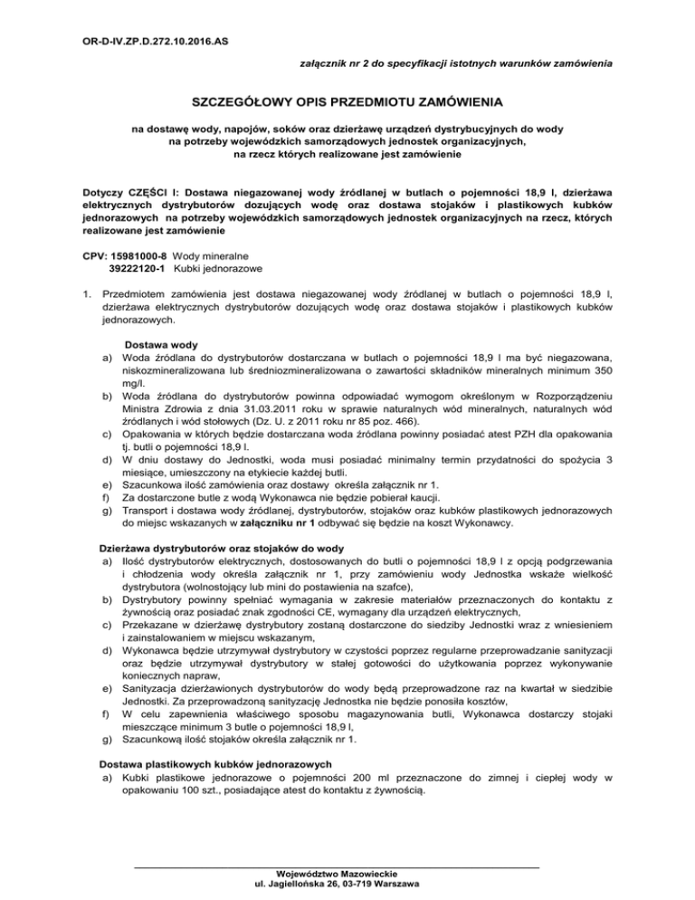 OR-D-IV.ZP.D.272.10.2016.AS załącznik nr 2 do specyfikacji istotnych warunków zamówienia SZCZEGÓŁOWY OPIS PRZEDMIOTU ZAMÓWIENIA na dostawę wody, napojów, soków oraz dzierżawę urządzeń dystrybucyjnych do wody na potrzeby wojewódzkich samorządowych jednostek organizacyjnych, na rzecz których realizowane jest zamówienie Dotyczy CZĘŚCI I: Dostawa niegazowanej wody źródlanej w butlach o pojemności 18,9 l, dzierżawa elektrycznych dystrybutorów dozujących wodę oraz dostawa stojaków i plastikowych kubków jednorazowych na potrzeby wojewódzkich samorządowych jednostek organizacyjnych na rzecz, których realizowane jest zamówienie CPV: 15981000-8 Wody mineralne 39222120-1 Kubki jednorazowe 1. Przedmiotem zamówienia jest dostawa niegazowanej wody źródlanej w butlach o pojemności 18,9 l, dzierżawa elektrycznych dystrybutorów dozujących wodę oraz dostawa stojaków i plastikowych kubków jednorazowych. Dostawa wody a) Woda źródlana do dystrybutorów dostarczana w butlach o pojemności 18,9 l ma być niegazowana, niskozmineralizowana lub średniozmineralizowana o zawartości składników mineralnych minimum 350 mg/l. b) Woda źródlana do dystrybutorów powinna odpowiadać wymogom określonym w Rozporządzeniu Ministra Zdrowia z dnia 31.03.2011 roku w sprawie naturalnych wód mineralnych, naturalnych wód źródlanych i wód stołowych (Dz. U. z 2011 roku nr 85 poz. 466). c) Opakowania w których będzie dostarczana woda źródlana powinny posiadać atest PZH dla opakowania tj. butli o pojemności 18,9 l. d) W dniu dostawy do Jednostki, woda musi posiadać minimalny termin przydatności do spożycia 3 miesiące, umieszczony na etykiecie każdej butli. e) Szacunkowa ilość zamówienia oraz dostawy określa załącznik nr 1. f) Za dostarczone butle z wodą Wykonawca nie będzie pobierał kaucji. g) Transport i dostawa wody źródlanej, dystrybutorów, stojaków oraz kubków plastikowych jednorazowych do miejsc wskazanych w załączniku nr 1 odbywać się będzie na koszt Wykonawcy. Dzierżawa dystrybutorów oraz stojaków do wody a) Ilość dystrybutorów elektrycznych, dostosowanych do butli o pojemności 18,9 l z opcją podgrzewania i chłodzenia wody określa załącznik nr 1, przy zamówieniu wody Jednostka wskaże wielkość dystrybutora (wolnostojący lub mini do postawienia na szafce), b) Dystrybutory powinny spełniać wymagania w zakresie materiałów przeznaczonych do kontaktu z żywnością oraz posiadać znak zgodności CE, wymagany dla urządzeń elektrycznych, c) Przekazane w dzierżawę dystrybutory zostaną dostarczone do siedziby Jednostki wraz z wniesieniem i zainstalowaniem w miejscu wskazanym, d) Wykonawca będzie utrzymywał dystrybutory w czystości poprzez regularne przeprowadzanie sanityzacji oraz będzie utrzymywał dystrybutory w stałej gotowości do użytkowania poprzez wykonywanie koniecznych napraw, e) Sanityzacja dzierżawionych dystrybutorów do wody będą przeprowadzone raz na kwartał w siedzibie Jednostki. Za przeprowadzoną sanityzację Jednostka nie będzie ponosiła kosztów, f) W celu zapewnienia właściwego sposobu magazynowania butli, Wykonawca dostarczy stojaki mieszczące minimum 3 butle o pojemności 18,9 l, g) Szacunkową ilość stojaków określa załącznik nr 1. Dostawa plastikowych kubków jednorazowych a) Kubki plastikowe jednorazowe o pojemności 200 ml przeznaczone do zimnej i ciepłej wody w opakowaniu 100 szt., posiadające atest do kontaktu z żywnością. ______________________________________________________________________________ Województwo Mazowieckie ul. Jagiellońska 26, 03-719 Warszawa OR-D-IV.ZP.D.272.10.2016.AS OPIS PRZEDMIOTU ZAMÓWIENIA Dotyczy Części II: Dostawa wody, napojów oraz soków na potrzeby wojewódzkich samorządowych jednostek organizacyjnych na rzecz, których realizowane jest zamówienie CPV: 15981200-0 Gazowane wody mineralne 15981000-8 Wody mineralne 15321000-4 Soki owocowe 15982000-5 Napoje orzeźwiające 1. Przedmiotem zamówienia jest dostawa: a) Naturalnej wody mineralnej niegazowanej w opakowaniach PET o pojemności 0,5 l, 1,5 l, której suma składników mineralnych wody wynosi minimum 550 mg/l, b) Naturalnej wody mineralnej gazowanej w opakowaniach PET o pojemności 0,5 l, 1,5 l, której suma składników mineralnych wody wynosi minimum 550 mg/l, c) Naturalnej wody mineralnej niegazowanej w opakowaniach szklanych bezzwrotnych o pojemności 0,33 l, typu Buskowianka Zdrój lub równoważna. Równoważność z wodą mineralną Buskowianka Zdrój dotyczy składników mineralnych wchodzących w skład wody, d) Naturalnej wody mineralnej gazowanej w opakowaniach szklanych bezzwrotnych o pojemności 0,33 l, typu Buskowianka Zdrój lub równoważna. Równoważność z wodą mineralną Buskowianka Zdrój dotyczy składników mineralnych wchodzących w skład wody, e) Wody niegazowanej źródlanej niskozmineralizowanej w opakowaniach PET o pojemności 5 l której suma składników mineralnych wody wynosi. minimum 200mg/l, f) Napojów gazowanych typu coca-cola, aluminiowa puszka o pojemności 0,33 l, g) Soków owocowych, różne smaki w opakowaniu kartonowym o pojemności 1 l. 2. Woda powinna być świeża, wysokiej jakości: a) Opakowanie butelki z tworzyw sztucznych nie wchodzących w reakcje ze związkami mineralnymi rozpuszczalnymi w wodzie i posiadające atest PZH o dopuszczeniu do kontaktu z żywnością, b) smak i zapach – bezwonny i bez obcych posmaków, c) zawartość metali i innych związków chemicznych zgodna z rozporządzeniem Ministra Zdrowia w sprawie naturalnych wód mineralnych, wód źródlanych i wód stołowych z dnia 31 marca 2011 r. (Dz. U. z 2011 roku nr 85 poz. 466), d) woda pochodząca z udokumentowanych zasobów podziemnych o naturalnym stabilnym składzie mineralnym, e) W dniu dostawy do Jednostki, woda musi posiadać minimalny termin przydatności do spożycia 6 miesięcy, umieszczony na etykiecie każdej butli. 3. Cechy dyskwalifikujące: a) obce