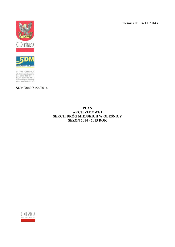Oleśnica dn. 14.11.2014 r. SDM/7040/5156/2014 PLAN AKCJI ZIMOWEJ SEKCJI DRÓG MIEJSKICH W OLEŚNICY SEZON 2014 - 2015 ROK WYTYCZNE dotyczące działalności zarządu podczas prowadzenia A-Z Plan dotyczy sieci dróg gminnych i wewnętrznych Miasta Oleśnicy oraz dróg przejętych w zarząd. 1. Celem akcji zimowej jest: - oczyszczanie ulic ze śniegu w kolejności ustalonej zgodnie z załącznikiem, - zwalczanie śliskości jezdni w kolejności ustalonej zgodnie z załącznikiem. Zimowe utrzymanie dróg w mieście wykonywane jest wg IV, V i VI standardu wg załączonego poniżej wyciągu z załącznika nr 1 do zarządzenia nr 46 Ministra Transportu i Gospodarki Morskiej z dnia 25 października 1994 r.. Kryteria zaliczenia dróg do danego standardu to: natężenie ruchu, funkcja w sieci dróg. Drogi nie ujęte w załącznikach dotyczących kolejności odśnieżania utrzymywane są wg VI standardu. Wyciąg z załącznika nr 1 do zarządzenia nr 46 Ministra Transportu i Gospodarki Morskiej z dnia 25 października 1994 r. ZASADY ODŚNIEŻANIA I USUWANIA GOŁOLEDZI NA DROGACH Lp Standard Opis stanu utrzymania drogi dla Dopuszczalne odstępstwa danego standardu Po ustaniu opadów Od stwierdzenia śniegu występowania zjawisk 1 1 2 IV 2 V 3 Jezdnia odśnieżona na całej szerokości, jezdnia posypana na odcinkach decydujących o możliwości ruchu. Jezdnia odśnieżona, w miejscach zasp co najmniej jeden pas ruchu z wykonaniem mijanek. Jezdnia posypana na odcinkach decydujących o możliwości ruchu. 4 - luźny 8 godz. - zajeżdżony występuje - języki śnieżne występują - zaspy do 8 godz. - dopuszcza się przerwy w komunikacji do 8 godz. - luźny 16 godz. - zajeżdżony występuje - nabój śnieżny występuje - zaspy występują do 24 godz. - dopuszcza się przerwy w komunikacji do 24 godz. 5 W miejscach wyznaczonych: Gołoledź 8 godz. Pośniegowa 10 godz. Lodowica 8 godz. W miejscach wyznaczonych: - gołoledź 8 godz. - pośniegowa 3 VI Jezdnia zaśnieżona prowadzi się interwencyjnie odśnieżanie w zależności od potrzeb. Jezdnie posypywane po odśnieżaniu w miejscach wyznaczonych przez zarządcę dróg. - luźny występuje - zajeżdżony występuje - nabój śnieżny występuje - zaspy występują do 48 godz. W miejscach wyznaczonych wszystkie rodzaje śliskości po odśnieżeniu – 2 godz. Mieszanka do posypywania nawierzchni składa się z piasku 70% i soli drogowej 30%. 2. Działalność SDM oparta jest na posiadanych środkach transportowych i sprzęcie zgodnie z opracowanym planem. W razie potrzeby moc zostanie zwiększona samochodami i sprzętem z innych jednostek wskazanych przez Urząd Miasta. 3. W przypadku wystąpienia opadów śniegu powyżej 10 cm pokrywy śnieżnej na wyznaczonych drogach uruchamiane zostają działania związane z usuwaniem śniegu. Działania te realizowane są na obszarze Starego Miasta oraz obwodnicy śródmiejskiej. Usuwanie śniegu dotyczy w szczególności: płyty Rynku, ulic o szerokości uniemożliwiającej zgarnięcie śniegu lub braku miejsca na odkład śniegu, zatok parkingowych. Oczyszczanie zatok odbywa się bez wstrzymywania ruchu kołowego z zachowaniem szczególnej ostrożności. Usunięty śnieg zostanie pryzmowany w miejscach nie kolidujących z ruchem drogowym, w przypadku braku takich możliwości zostanie wywieziony na teren przyległy do ul. Wałowej. Rozpoczęcie usuwania śniegu wykonywane będzie po zrealizowaniu zadań wyznaczonych w pkt 1. niniejszego planu. Zimowe utrzymanie miejsc parkingowych w strefie płatnego parkowania będzie realizowane bezpośrednio przez SDM z zastrzeżeniem pierwszeństwa wykonania zimowego utrzymania ciągów komunikacyjnych zgodnie z Wykazem ulic pierwszej kolejności odśnieżania (zał. 1). 4. Dyżury związane z prowadzeniem A-Z będą prowadzone codziennie od godz. 5.30 do godz.21:00. Wszelkie informacje dotyczące A-Z należy kierować do Sekcji Dróg Miejskich w Oleśnicy, ul. Krzywoustego 31c, tel. (71) 788 94 16, fax (71) 788 94 17, e-mail: [email protected] PROGRAM prac związanych z przygotowaniem do akcji zimowej ___________________________________________________________________________ RODZAJ PRAC TERMIN WYKONANIA ODPOWIEDZIALNY ___________________________________________________________________________ - sporządzenie tygodniowych grafików dyżurów na bieżąco Maciej Kasprzak - przeprowadzenie szkolenia z kierowcami i operatorami biorącymi udział w A-Z na bieżąco Maciej Kasprzak - utrzymywanie sprawności posiadanego sprzętu do pracy w warunkach zimowych na bieżąco Maciej Kasprzak - utrzymanie w pełnej widoczności znaków drogowych na bieżąco Maciej Kasprzak - kontrola stanu nawierzchni drogowych na bieżąco zgodnie z grafikiem dyżurów - kierowanie przeprowadzaniem akcji zimowej na bieżąco zgodnie z grafikiem dyżurów WYKAZ osób biorących udział w akcji zimowej 2014-2015 Fink Krzysztof Oleśnica ul. Skłodowskiej 2a/7 tel. 601 728 036 dyrektor Kasprzak Maciej Oleśnica ul. Daszyńskiego 18/9 tel. 605 317 968 kierownik bazy sprzęt. Monika Pękalska Oleśnica, 11 Listopada 20P/3 tel. 531 979 798 inspektor ds. dróg Jarki Wacław Długołęka 36c tel. 664 458 134 kierowca Pietrzyk Jan Dobroszyce ul Brzozowa 4 tel. 606 381 480 kierowca Siodłowski Grzegorz Wabienice 34 tel. 725 417 914 tel. 71 398 92 05 kierowca Marek Choczaj Oleśnica ul. Słoneczna 19/7 tel. 781 932 602 kierowca Krzysztof Baran Brzezinka 19 tel. 501 714 369 kierowca Michalczyk Czesław Dobroszyce Rynek 3/3 tel. 667 714 558 tel. 71 314 18 13 prac. bud. Jerzy Pizur Krzeczyn 52c tel. 606 723 667 tel. 887 786 908 prac. bud. Andrzej Jałowy Oleśnica ul. Klonowa7/31 tel. 502 342 341 prac. bud. Rafał Sokołowski Oleśnica ul. Lwowska 24/11 tel. 507 278 297 prac. bud. WYKAZ pojazdów mechanicznych i sprzętu do prowadzenia akcji zimowej 1 2. 3. 4. 5. 6. 7. Samochód DAF LF.55 - piaskarka z pługiem DOL 09611 Samochód STAR 200 - piaskarka z pługiem DOL 09HF Ciągnik URSUS - z pługiem DOL C752 