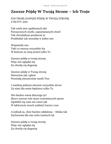 iSing.pl - Każdy może śpiewać! Zawsze Pójdę W Twoją Strone – Ich Troje ICH TROJE:ZAWSZE PÓJDĘ W TWOJĄ STRONĘ Z PŁYTY AD4 Tak wiele jest zgubionych dni Porzuconych myśli, zapomnianych chwil Tak chciałabym pozbierać je Poukładać jak mozaikę w jeden sen Wspaniały sen Taki co osusza wszystkie łzy W którym ze mną jesteś tylko Ty Zawsze pójdę w twoją stronę Więc nie oglądaj się Za chwilę cię dogonię Zawsze pójdę w Twoją stronę Nieważne jak i gdzie Powiodą nieostrożne myśli Twe I zamknę jednym słowem wszystkie drzwi Za nimi dla mnie będziesz tylko Ty Nie bardzo wiem dlaczego ja? Skoro zawsze tyle masz ważniejszych spraw Zgubiłeś się sam nie wiesz jak W labiryncie swych ambicji tracisz czas A jednak ja, choć bardzo oddalona – bliska tak Zachowam dla nas echo tamtych lat Zawsze pójdę w twoją stronę Więc nie oglądaj się Za chwilę cię dogonię Zawsze pójdę w Twoją stronę Nieważne jak i gdzie Powiodą nieostrożne myśli Twe I zamknę jednym słowem wszystkie drzwi Za nimi dla mnie będziesz tylko Ty Muzyka A jednak ja, choć bardzo oddalona – bliska tak Zachowam dla nas echo tamtych lat Zawsze pójdę w twoją stronę Więc nie oglądaj się Za chwilę cię dogonię Zawsze pójdę w Twoją stronę Nieważne jak i gdzie Powiodą nieostrożne myśli Twe I zamknę jednym słowem wszystkie drzwi Za nimi dla mnie będziesz tylko Ty Zawsze pójdę w twoją stronę Więc nie oglądaj się Za chwilę cię dogonię Zawsze pójdę w Twoją stronę Nieważne jak i gdzie Powiodą nieostrożne myśli Twe I zamknę jednym słowem wszystkie drzwi Za nimi dla mnie będziesz tylko Ty DZIĘKUJE Słowa: brak danych Muzyka: brak danych Rok wydania: brak danych Płyta: brak danych