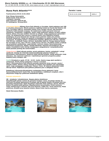Biuro Podróży WIGRA s.c. ul. Człuchowska 25 01-360 Warszawa Tel. 22 665 06 06, 22 664 94 86, www.wigra.com.pl, e-mail: [email protected] Duna Park Atlantis**** Fuerteventura 05.01-12.01.2016 Termin i cena 05.01-12.01.2016 4099 zł Kraj: Wyspy Kanaryjskie Miejscowość: Brak danych Transport: Samolot Data ważności: 2016-01-05 Nr katalogowy: Wczasy/2015 Informacje Ogólne:Witamy Duna Park Atlantis w Corralejo. Hotel położony jest 100 m od plaży piaszczysta. Miasta położone najbliżej hotelu to Puerto Del Rosario (30 km) i Corralejo (200 m). Pozostałe miasta: Gran Tarajal (78 km). Dla Państwa komfortu hotel posiada recepcję. W 2-piętrowym hotelu personel mówi po niemiecku, hiszpańsku i angielsku. Dzieci mają możliwość zabawy na placu zabaw. Goście, którzy chcą być mobilni również na urlopie, mogą wypożyczyć samochód i rower. Do dyspozycji jest czynny w sezonie basen oraz oddzielny brodzik. Znajdujący się przy basenie bar oferuje swoim gościom relaks przy drinku. Parasole słoneczne i leżaki do opalania są dostępne za opłatą na plaży i bezpłatnie na basenie. W pobliżu hotelu z możliwością dojazdu: Betancuria (46 km), lotnisko FUE (36 km), Cotillo/El Toston (20 km), dyskoteka (400 m), Parque Natural Dunas De Corralejo (3 km), Ajuy (70 km) i jazda konna (18 km). W pobliżu hotelu znajdują się przystanek autobusowy, supermarket, centrum miasta, bary/restauracje, informacja turystyczna, sklepy i postój taksówek. Gościom poruszającym się na wózku inwalidzkim hotel oferuje następujące udogodnienia: rampa/podnośnik. Hotel posiada parking dla samochodów. Udogodnienia:Hotel oferuje pralnię, serwis pokojowy, kantor, pokojówki i usługi opiekunki. Dostęp do Internetu bezprzewodowego poprzez hotspot i w terminalach internetowych. Rodzinny hotel oferuje brodzik, usługi opiekunki i klub dziecięcy, aby zapewnić rodzicom i najmłodszym gościom przyjemny pobyt. Godziny pracy recepcji: 24h. Posiłki:Śniadanie w godz. 07:30 - 10:30 : bufet. Goście mogą zjeść posiłek w restauracji. Drinki można spożywać w barze w recepcji. Sport i Rozrywka:Duna Park Atlantis posiada słoneczny taras, jacuzzi, saunę i masaże wodne. Goście, którzy również na urlopie chcą spędzać czas uprawiając sport, mają następujące możliwości: fitness i tenis. W ramach aktywności hotel oferuje bilard. Najbliższe pole golfowe położone jest w odległości 48 km. Dodatkowe Informacje:Akceptujemy następujące formy płatności: karta Eurocard/MasterCard i karta Visa. Za korzystanie z niektórych urządzeń, ofert i aktywności mogą być pobierane dodatkowe opłaty. Rodzaje wyżywienia HB - śniadania i obiadokolacje. Napoje płatne dodatkowo KlasyfikacjaW pokoju zestaw do parzenia herbaty i kawy, W pokoju dostęp do internetu W pokoju ogrzewanie W pokoju sejf W pokoju telefon W pokoju mini bar, W pokoju klimatyzacja, Hotel akcpetuje zwierzęta Tenis stołowy, Sauna, Masaże, Bilard, W pobliżu pole golfowe, Wypożyczalnia samochodów, Punkt wymiany walut, Restauracja z tarasem, Bar przy basenie, Lobby bar, Taras słoneczny, Plaża publiczna, Brodzik przy basenie krytym, Basen kryty czynny sezonowo, Wylot Warszawa Modlin 1/1 Powered by TCPDF (www.tcpdf.org)