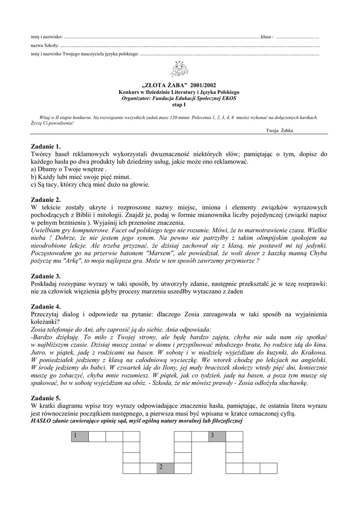 imię i nazwisko: ...................................................................................................................................................................klasa : .................................... nazwa Szkoły: ........................................................................................................................................................................ imię i nazwisko Twojego nauczyciela języka polskiego: .................................................................................................................... „ZŁOTA ŻABA” 2001/2002 Konkurs w Dziedzinie Literatury i Języka Polskiego Organizator: Fundacja Edukacji Społecznej EKOS etap I Witaj w II etapie konkursu. Na rozwiązanie wszystkich zadań masz 120 minut. Polecenia 1, 2, 3, 4, 8 musisz wykonać na dołączonych kartkach. Życzę Ci powodzenia! Twoja Żabka Zadanie 1. Twórcy haseł reklamowych wykorzystali dwuznaczność niektórych słów; pamiętając o tym, dopisz do każdego hasła po dwa produkty lub dziedziny usług, jakie może ono reklamować. a) Dbamy o Twoje wnętrze . b) Każdy lubi mieć swoje pięć minut. c) Są tacy, którzy chcą mieć dużo na głowie. Zadanie 2. W tekście zostały ukryte i rozproszone nazwy miejsc, imiona i elementy związków wyrazowych pochodzących z Biblii i mitologii. Znajdź je, podaj w formie mianownika liczby pojedynczej (związki napisz w pełnym brzmieniu ). Wyjaśnij ich przenośne znaczenia. Uwielbiam gry komputerowe. Facet od polskiego tego nie rozumie. Mówi, że to marnotrawienie czasu. Wielkie nieba ! Dobrze, że nie jestem jego synem. Na pewno nie patrzyłby z takim olimpijskim spokojem na nieodrobione lekcje. Ale trzeba przyznać, że dzisiaj zachował się z klasą, nie postawił mi tej jedynki. Poczęstowałem go na przerwie batonem "Marsem", ale powiedział, że woli deser z kaszką manną Chyba pożyczę mu "Arkę", to moja najlepsza gra. Może w ten sposób zawrzemy przymierze ? Zadanie 3. Poskładaj rozsypane wyrazy w taki sposób, by utworzyły zdanie, następnie przekształć je w tezę rozprawki: nie za człowiek więzienia gdyby procesy marzenia uszedłby wytaczano z żaden Zadanie 4. Przeczytaj dialog i odpowiedz na pytanie: dlaczego Zosia zareagowała w taki sposób na wyjaśnienia koleżanki? Zosia telefonuje do Ani, aby zaprosić ją do siebie. Ania odpowiada: -Bardzo dziękuję. To miło z Twojej strony, ale będę bardzo zajęta, chyba nie uda nam się spotkać w najbliższym czasie. Dzisiaj muszę zostać w domu i przypilnować młodszego brata, bo rodzice idą do kina. Jutro, w piątek, jadę z rodzicami na basen. W sobotę i w niedzielę wyjeżdżam do kuzynki, do Krakowa. W poniedziałek jedziemy z klasą na całodniową wycieczkę. We wtorek chodzę po lekcjach na angielski. W środę jedziemy do babci. W czwartek idę do Ilony, jej mały braciszek skończy wtedy pięć dni, koniecznie muszę go zobaczyć, chyba mnie rozumiesz. W piątek, jak co tydzień, jadę na basen, a poza tym muszę się spakować, bo w sobotę wyjeżdżam na obóz. - Szkoda, że nie mówisz prawdy - Zosia odłożyła słuchawkę. Zadanie 5. W kratki diagramu wpisz trzy wyrazy odpowiadające znaczeniu hasła, pamiętając, że ostatnia litera wyrazu jest równocześnie początkiem następnego, a pierwsza musi być wpisana w kratce oznaczonej cyfrą. HASŁO zdanie zawierające opinię sąd, myśl ogólną natury moralnej lub filozoficznej 1 3 2 Zadanie 6. Z jakich języków pochodzą podane zapożyczenia? Wpisz wyrazy do odpowiednich rubryk: burmistrz, czempion, manicure, fraszka, immunitet, kindersztuba, dżinsy, seminarium, bagietka, impresario niemiecki francuski włoski łacina angielski Zadanie 7. Przepisz tekst decydując o rozdzielnej lub łącznej pisowni zaznaczonych wyrazów. Jestem bez/reszty oddany swojej pracy. Wydawać/by się mogło, że to dobrze, jednak na/co/dzień jest to dość uciążliwe. Na/przykład przed/wczoraj zapomniałem odebrać dzieci z przedszkola. Myślicie pewnie, że mówię od/rzeczy, ale na/prawdę na/śmierć zapomniałem. Na/szczęście żona się pomyliła - odbieramy dzieci na/przemian -i od/razu po pracy poszła po malców. Przypomniałem sobie o nich, kiedy na/zewnątrz było już ciemno. Pobiegłem wpół/żywy do domu - było pół/do/dziesiątej - a tam dzieci śpią, żona spokojnie szykuje kolację. Nie/chciałbym mieć z nią jednak do/czynienia, gdy/by prawda wyszła na/jaw. Zadanie 8. Do podanych znaczeń dopisz odpowiednie przedrostki oraz jeden przykład ich użycia: przedrostek znaczenie przedrostka przykład użycia np. kontrprzeciwieństwo, kontrast, przeciwstawienie kontrpropozycja zbyt dużo, przesada w czymś, szkodliwy nadmiar przeciwieństwo, przeciwstawienie się czemuś, zwalczanie kogoś lub czegoś, wrogość wobec kogoś lub czegoś sam, własny, odnoszący się do siebie, skierowany na siebie doskonały, najwyższej jakości, bezkonkurencyjny, ostateczny Zadanie 9. Zostań Harrym Potterem i odgadnij tajemnicze zaklęcie potrzebne do odczarowania jego przyjaciółki, Hermiony: ustal, w jakiej kolejności zostały ustawione książki na półce. Pierwsze litery ich tytułów utworzą rozwiązanie. " - Pójdziesz do biblioteki i odszukasz regał, na którym zobaczysz, pośrodku, rzucającą się w oczy, czerwoną księgę. Słownik sztuk tajemnych nie jest czerwony, a koło niego stoi tylko jedna książka - Objaśnienia zaklęć i przekleństw. Znajdziesz tam też Encyklopedię eliksirów , która na pewno nie stoi na końcu półki, ale między trochę zniszczoną Rozrywką dla wtajemniczonych i najnowszym wydaniem Dekalogu młodego czarodzieja. O ile pamiętam, książka, która stoi obok Słownika sztuk tajemnych też nie stoi na końcu półki, tylko obok Magii dla każdego, która znajduje się po prawej stronie czerwonej księgi. Tę trochę zniszczoną książkę, o której ci wcześniej mówiłam, znajdziesz po lewej stronie Almanachu magii