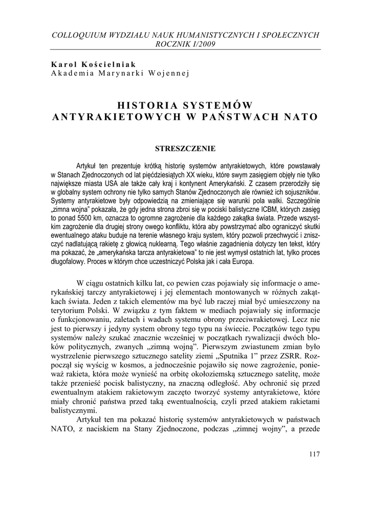 COLLOQUIUM WYDZIAŁU NAUK HUMANISTYCZNYCH I SPOŁECZNYCH ROCZNIK I/2009 Karol Kościelniak Akademia Marynarki Wojennej HISTORIA SYSTEMÓW ANTYRAKIETOWYCH W PAŃSTWACH NATO STRESZCZENIE Artykuł ten prezentuje krótką historię systemów antyrakietowych, które powstawały w Stanach Zjednoczonych od lat pięćdziesiątych XX wieku, które swym zasięgiem objęły nie tylko największe miasta USA ale także cały kraj i kontynent Amerykański. Z czasem przerodziły się w globalny system ochrony nie tylko samych Stanów Zjednoczonych ale również ich sojuszników. Systemy antyrakietowe były odpowiedzią na zmieniające się warunki pola walki. Szczególnie „zimna wojna” pokazała, że gdy jedna strona zbroi się w pociski balistyczne ICBM, których zasięg to ponad 5500 km, oznacza to ogromne zagrożenie dla każdego zakątka świata. Przede wszystkim zagrożenie dla drugiej strony owego konfliktu, która aby powstrzymać albo ograniczyć skutki ewentualnego ataku buduje na terenie własnego kraju system, który pozwoli przechwycić i zniszczyć nadlatującą rakietę z głowicą nuklearną. Tego właśnie zagadnienia dotyczy ten tekst, który ma pokazać, że „amerykańska tarcza antyrakietowa” to nie jest wymysł ostatnich lat, tylko proces długofalowy. Proces w którym chce uczestniczyć Polska jak i cała Europa. W ciągu ostatnich kilku lat, co pewien czas pojawiały się informacje o amerykańskiej tarczy antyrakietowej i jej elementach montowanych w różnych zakątkach świata. Jeden z takich elementów ma być lub raczej miał być umieszczony na terytorium Polski. W związku z tym faktem w mediach pojawiały się informacje o funkcjonowaniu, zaletach i wadach systemu obrony przeciwrakietowej. Lecz nie jest to pierwszy i jedyny system obrony tego typu na świecie. Początków tego typu systemów należy szukać znacznie wcześniej w początkach rywalizacji dwóch bloków politycznych, zwanych „zimną wojną”. Pierwszym zwiastunem zmian było wystrzelenie pierwszego sztucznego satelity ziemi „Sputnika 1” przez ZSRR. Rozpoczął się wyścig w kosmos, a jednocześnie pojawiło się nowe zagrożenie, ponieważ rakieta, która może wynieść na orbitę okołoziemską sztucznego satelitę, może także przenieść pocisk balistyczny, na znaczną odległość. Aby ochronić się przed ewentualnym atakiem rakietowym zaczęto tworzyć systemy antyrakietowe, które miały chronić państwa przed taką ewentualnością, czyli przed atakiem rakietami balistycznymi. Artykuł ten ma pokazać historię systemów antyrakietowych w państwach NATO, z naciskiem na Stany Zjednoczone, podczas „zimnej wojny”, a przede 117 Karol Kościelniak wszystkim po jej zakończeniu, kiedy to zabrakło głównego wroga. Na jego miejsce pojawili się następni. Powstało zagrożenie terrorystyczne i tzw. lista „państw terrorystycznych”, które mogą zagrażać pokojowi na świecie. Datą przełomową stały się wydarzenia z 11 września 2001 roku, wtedy też na nowo powstała idea budowy systemu antyrakietowego. Pragnę pokazać co się zmieniło od czasów „zimnej wojny” do dnia dzisiejszego. Czy tamte systemy różniły się od tych dzisiejszych. Jaki wpływ systemy antyrakietowe mają na sytuację międzynarodową, czy odbijają się na stosunkach miedzy państwowych. We wrześniu 2005 roku NATO utworzyło Biuro do spraw Zarządzania Programem ALTBMD – Wielowarstwowa Obrona Antyrakietowa Teatru Działań, którego celem jest lub raczej ma być ochrona wojsk NATO operujących poza obszarem Sojuszu. Systemy obrony antyrakietowej teatru działań poszczególnych państw NATO zostaną włączone we wspólny system dowodzenia i kontroli z zadaniem obrony wojsk NATO przed pociskami teatru działań typu SCUD i NO-DONG1. Deklaracja przyjęta przez szczyt NATO w Pradze 21 listopada 2002 roku, zobowiązała kraje członkowskie NATO do przeprowadzenia badań w zakresie: „sposobów zapobieżenia rosnącej groźbie ataku rakietowego na obszar Sojuszu, wojska i skupiska ludności w skuteczny sposób poprzez odpowiednie połączenie działań politycznych i obronnych oraz środków odstraszania”2. Nie podjęto jednak żadnych wiążących decyzji. Na szczycie w Rydze w listopadzie 2006 roku stwierdzono konieczność dalszych badań. Od szczytu w Rydze na forum EWG (R) prowadzona jest dyskusja na temat potrzeby budowy systemu obrony antyrakietowej dla ochrony terytorium NATO3. W 2005 r. Rada Północnoatlantycka - najważniejsze ciało NATO - zdecydowała o uruchomieniu programu ochrony przed rakietami średniego zasięgu. Program, znany jako ALTBMD, ma zacząć działać w 2015 lub 2016 r.4. W przyszłości ALTBMD może stać się nawet uzupełnieniem amerykańskiej tarczy. Potężne systemy obrony przeciwrakietowej ochraniające miasta i terytoria NATO mogłyby wzmocnić odstraszanie oraz umożliwić Sojuszowi pokonywanie sytuacji kryzysowych w bardziej systematyczny i solidarny sposób. Być może w pewnych przypadkach mogłyby także odwieść przeciwników od wejścia w posiadanie rakiet balistycznych, które mogłyby zagrozić terytoriom państw NATO. Obrona przeciwrakietowa mogłaby wzmocnić odstraszanie, ponieważ przeciwnik ryzykowałby, że jego ataki skończą się klęską operacyjną oraz stanąłby wobec perspektyw odwetu ze strony NATO. Poza tym, dysponując obroną 1 Obrona antyrakietowa w ramach NATO, http://polish.poland.usembassy.gov/ news/ obrona-przeciwrakietowa/obrona-przeciwrakietowa-nato-dzialania.html [26.05.2009]. 2 Tamże. 3 Tamże. 4 K. Nikiewicz, Całe NATO popiera tarczę, http://wyborcza.pl/1,76842,4074870. html [08.06.2009r.]. 118 COLLOQUIUM WNHiS Historia systemów antyrakietowych w państwach NATO przed takimi rakietami balistycznymi, państwa sojusznicze miałyby większą swobodę rozważania opcji innych, niż podejmowanie przeciwko wrogom działań prewencyjnych lub wyprzedzających. Takie systemy obrony pomogłyby członkom Sojuszu osiągać kons