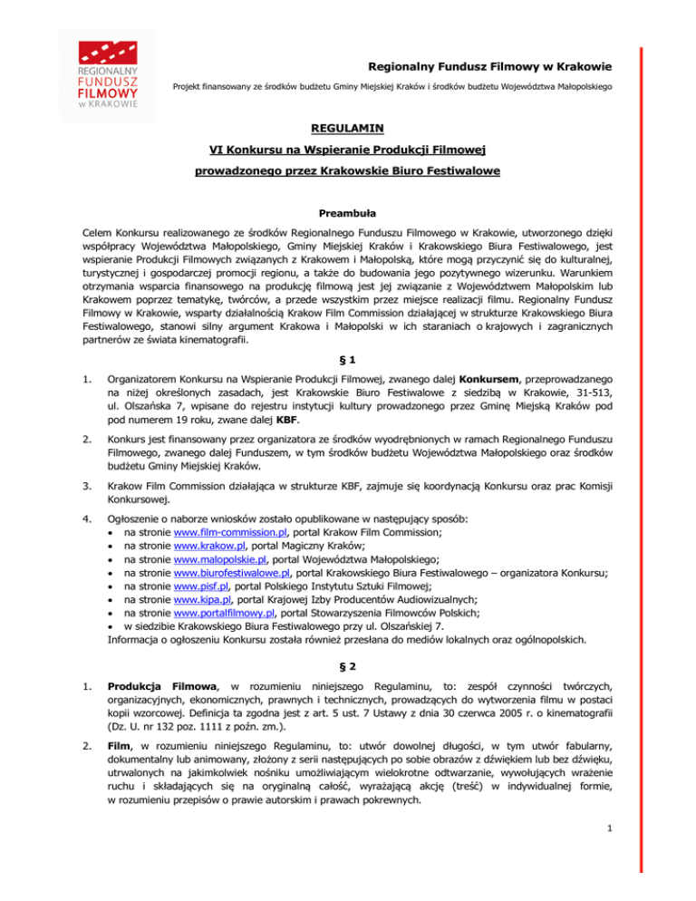 Regionalny Fundusz Filmowy w Krakowie Projekt finansowany ze środków budżetu Gminy Miejskiej Kraków i środków budżetu Województwa Małopolskiego REGULAMIN VI Konkursu na Wspieranie Produkcji Filmowej prowadzonego przez Krakowskie Biuro Festiwalowe Preambuła Celem Konkursu realizowanego ze środków Regionalnego Funduszu Filmowego w Krakowie, utworzonego dzięki współpracy Województwa Małopolskiego, Gminy Miejskiej Kraków i Krakowskiego Biura Festiwalowego, jest wspieranie Produkcji Filmowych związanych z Krakowem i Małopolską, które mogą przyczynić się do kulturalnej, turystycznej i gospodarczej promocji regionu, a także do budowania jego pozytywnego wizerunku. Warunkiem otrzymania wsparcia finansowego na produkcję filmową jest jej związanie z Województwem Małopolskim lub Krakowem poprzez tematykę, twórców, a przede wszystkim przez miejsce realizacji filmu. Regionalny Fundusz Filmowy w Krakowie, wsparty działalnością Krakow Film Commission działającej w strukturze Krakowskiego Biura Festiwalowego, stanowi silny argument Krakowa i Małopolski w ich staraniach o krajowych i zagranicznych partnerów ze świata kinematografii. §1 1. Organizatorem Konkursu na Wspieranie Produkcji Filmowej, zwanego dalej Konkursem, przeprowadzanego na niżej określonych zasadach, jest Krakowskie Biuro Festiwalowe z siedzibą w Krakowie, 31-513, ul. Olszańska 7, wpisane do rejestru instytucji kultury prowadzonego przez Gminę Miejską Kraków pod pod numerem 19 roku, zwane dalej KBF. 2. Konkurs jest finansowany przez organizatora ze środków wyodrębnionych w ramach Regionalnego Funduszu Filmowego, zwanego dalej Funduszem, w tym środków budżetu Województwa Małopolskiego oraz środków budżetu Gminy Miejskiej Kraków. 3. Krakow Film Commission działająca w strukturze KBF, zajmuje się koordynacją Konkursu oraz prac Komisji Konkursowej. 4. Ogłoszenie o naborze wniosków zostało opublikowane w następujący sposób: · na stronie www.film-commission.pl, portal Krakow Film Commission; · na stronie www.krakow.pl, portal Magiczny Kraków; · na stronie www.malopolskie.pl, portal Województwa Małopolskiego; · na stronie www.biurofestiwalowe.pl, portal Krakowskiego Biura Festiwalowego – organizatora Konkursu; · na stronie www.pisf.pl, portal Polskiego Instytutu Sztuki Filmowej; · na stronie www.kipa.pl, portal Krajowej Izby Producentów Audiowizualnych; · na stronie www.portalfilmowy.pl, portal Stowarzyszenia Filmowców Polskich; · w siedzibie Krakowskiego Biura Festiwalowego przy ul. Olszańskiej 7. Informacja o ogłoszeniu Konkursu została również przesłana do mediów lokalnych oraz ogólnopolskich. §2 1. Produkcja Filmowa, w rozumieniu niniejszego Regulaminu, to: zespół czynności twórczych, organizacyjnych, ekonomicznych, prawnych i technicznych, prowadzących do wytworzenia filmu w postaci kopii wzorcowej. Definicja ta zgodna jest z art. 5 ust. 7 Ustawy z dnia 30 czerwca 2005 r. o kinematografii (Dz. U. nr 132 poz. 1111 z poźn. zm.). 2. Film, w rozumieniu niniejszego Regulaminu, to: utwór dowolnej długości, w tym utwór fabularny, dokumentalny lub animowany, złożony z serii następujących po sobie obrazów z dźwiękiem lub bez dźwięku, utrwalonych na jakimkolwiek nośniku umożliwiającym wielokrotne odtwarzanie, wywołujących wrażenie ruchu i składających się na oryginalną całość, wyrażającą akcję (treść) w indywidualnej formie, w rozumieniu przepisów o prawie autorskim i prawach pokrewnych. 1 Regionalny Fundusz Filmowy w Krakowie Projekt finansowany ze środków budżetu Gminy Miejskiej Kraków i środków budżetu Województwa Małopolskiego 3. Konkurs ma na celu wspieranie produkcji filmów przeznaczonych do emisji jako materiał programowy w telewizji lub internecie oraz na innych polach eksploatacji uzgodnionych przez koproducentów, w tym do wyświetlania w kinach. §3 Konkurs na Wspieranie Produkcji Filmowej ogłaszany jest co najmniej raz w roku. §4 1. Wspieranie Produkcji Filmowych odbywać się będzie ze środków Funduszu, których dysponentem jest KBF, ewentualnie także poprzez wsparcie w postaci wkładu rzeczowego, na zasadach określonych w Regulaminie oraz umowie koprodukcyjnej. 2. Na zasadach określonych w umowie koprodukcyjnej KBF nabędzie prawa autorskie i pokrewne do Filmu w wysokości proporcjonalnej do swego udziału w Produkcji Filmu oraz partycypować będzie w przychodach z eksploatacji Filmu w wysokości proporcjonalnej do swego udziału. 3. Wsparcie Produkcji Filmowej zgodnie z Regulaminem może mieć następującą formę: a. wkład finansowy rozumiany jako wsparcie Produkcji Filmowej poprzez przekazanie środków pieniężnych na rzecz wnioskodawcy. Przyznany w ramach Konkursu wkład finansowy wyrażony jest w kwocie brutto; b. wkład rzeczowy, rozumiany jako wsparcie Produkcji Filmowej poprzez zapewnienie bezpośrednio przez KBF na rzecz wnioskodawcy świadczeń w postaci m.in. usług, towarów lub świadczeń niematerialnych, w tym czynności o charakterze organizacyjnym, administracyjnym, prawnym lub udostępnienia nieruchomości albo ruchomości, bez przekazywania środków pieniężnych na rzecz wnioskodawcy. Wartość świadczeń KBF jest ustalona w oparciu o wartość rynkową tych świadczeń i zaliczana jest do wkładu KBF w produkcję Filmu. §5 1. Nagrodą w Konkursie jest zaproszenie Laureata Konkursu do negocjacji umowy koprodukcyjnej, na podstawie której Laureat Konkursu i KBF stają się koproducentami Filmu. 2. Podstawowe zasady wspierania Produkcji Filmowej Laureatów Konkursu są następujące: a. wkład finansowy i rzeczowy, o których mowa w § 4 ust. 3 Regulaminu, może stanowić maksymalnie do 50% kosztów Produkcji Filmu; b. udział w Produkcji Filmu odbywa się przy zachowaniu zasady, iż minimum 10% kosztów produkcji Filmu stanowi wkład własny wnioskodawcy, rozumiany jako wkład finansowy lub finansowo-rzeczowy. Wkład własny może pochodzić w szczególności