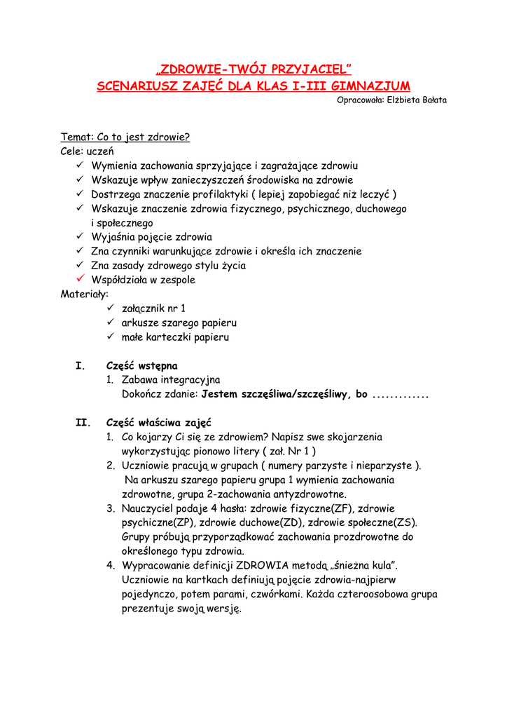 „ZDROWIE-TWÓJ PRZYJACIEL” SCENARIUSZ ZAJĘĆ DLA KLAS I-III GIMNAZJUM Opracowała: Elżbieta Bałata Temat: Co to jest zdrowie? Cele: uczeń Wymienia zachowania sprzyjające i zagrażające zdrowiu Wskazuje wpływ zanieczyszczeń środowiska na zdrowie Dostrzega znaczenie profilaktyki ( lepiej zapobiegać niż leczyć ) Wskazuje znaczenie zdrowia fizycznego, psychicznego, duchowego i społecznego Wyjaśnia pojęcie zdrowia Zna czynniki warunkujące zdrowie i określa ich znaczenie Zna zasady zdrowego stylu życia Współdziała w zespole Materiały: załącznik nr 1 arkusze szarego papieru małe karteczki papieru I. Część wstępna 1. Zabawa integracyjna Dokończ zdanie: Jestem szczęśliwa/szczęśliwy, bo ............. II. Część właściwa zajęć 1. Co kojarzy Ci się ze zdrowiem? Napisz swe skojarzenia wykorzystując pionowo litery ( zał. Nr 1 ) 2. Uczniowie pracują w grupach ( numery parzyste i nieparzyste ). Na arkuszu szarego papieru grupa 1 wymienia zachowania zdrowotne, grupa 2-zachowania antyzdrowotne. 3. Nauczyciel podaje 4 hasła: zdrowie fizyczne(ZF), zdrowie psychiczne(ZP), zdrowie duchowe(ZD), zdrowie społeczne(ZS). Grupy próbują przyporządkować zachowania prozdrowotne do określonego typu zdrowia. 4. Wypracowanie definicji ZDROWIA metodą „śnieżna kula”. Uczniowie na kartkach definiują pojęcie zdrowia-najpierw pojedynczo, potem parami, czwórkami. Każda czteroosobowa grupa prezentuje swoją wersję. Na zakończenie tego ćwiczenia nauczyciel podaje definicję ZDROWIA opracowaną przez Światową Organizację Zdrowia (WHO): „Zdrowie oznacza stan dobrego samopoczucia fizycznego, psychicznego i społecznego, a nie wyłącznie brak choroby czy niedomagania’’. 5. Na zdrowie wpływają różne czynniki: • Środowisko życia • Służba zdrowia • Czynniki biologiczne • Styl życia Każdy uczeń wpisuje wg hierarchii ważności czynniki warunkujące zdrowie(zał. Nr 1 ; u podstawy piramidy czynnik najważniejszy). Następnie nauczyciel przedstawia procentowe wyniki na piramidzie: • 50% styl życia • 20% środowisko • 20% czynniki biologiczne • 10% służba zdrowia III. CZĘŚĆ KOŃCOWA 1. Uczniowie pracują w 4 osobowych grupach. Każda grupa otrzymuje do złożenia puzzle w kształcie serca, gdzie znajduje się cytat: „ Dbajmy o zdrowie nie dlatego, że jest ważne, ale dlatego, że bez niego wszystko inne jest nieważne”. JESTEM SZCZĘŚLIWA/Y, BO....................... JESTEM SZCZĘŚLIWA/Y, BO....................... JESTEM SZCZĘŚLIWA/Y, BO...................... JESTEM SZCZĘŚLIWA/Y, BO....................... JESTEM SZCZĘŚLIWA/Y, BO....................... JESTEM SZCZĘŚLIWA/Y, BO....................... Załącznik nr 1 -Z-D-R-O-W-I-E- Załącznik nr 1 -Z-D-R-O-W-I-EZałącznik nr 1 -Z-D-R-O-W-I-E- „Dbajmy o zdrowie nie dlatego, że jest ważne, ale dlatego, że bez niego wszystko inne jest nieważne”.