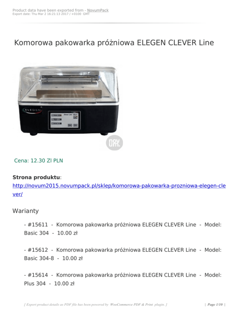 Product data have been exported from - NovumPack Export date: Thu Mar 2 16:21:13 2017 / +0100 GMT Komorowa pakowarka próżniowa ELEGEN CLEVER Line Cena: 12.30 Zl PLN Strona produktu: http://novum2015.novumpack.pl/sklep/komorowa-pakowarka-prozniowa-elegen-cle ver/ Warianty - #15611 - Komorowa pakowarka próżniowa ELEGEN CLEVER Line - Model: Basic 304 - 10.00 zł - #15612 - Komorowa pakowarka próżniowa ELEGEN CLEVER Line - Model: Basic 304-8 - 10.00 zł - #15614 - Komorowa pakowarka próżniowa ELEGEN CLEVER Line - Model: Plus 304 - 10.00 zł [ Export product details as PDF file has been powered by WooCommerce PDF & Print plugin. ] | Page 1/10 | Product data have been exported from - NovumPack Export date: Thu Mar 2 16:21:13 2017 / +0100 GMT - #15615 - Komorowa pakowarka próżniowa ELEGEN CLEVER Line - Model: Plus 304-8 - 10.00 zł - #15616 - Komorowa pakowarka próżniowa ELEGEN CLEVER Line - Model: Basic 364 - 10.00 zł - #15617 - Komorowa pakowarka próżniowa ELEGEN CLEVER Line - Model: Basic 364-8 - 10.00 zł - #15618 - Komorowa pakowarka próżniowa ELEGEN CLEVER Line - Model: Plus 364 - 10.00 zł - #15619 - Komorowa pakowarka próżniowa ELEGEN CLEVER Line - Model: Plus 364-8 - 10.00 zł Opis produktu Komorowa pakowarka próżniowa ELEGEN Clever o małych i kompaktowych wymiarach i atrakcyjnym stosunku ceny do jakości. Mimo niskiej ceny jak na urządzenie pakujące produkcji europejskiej zapewnia wysoką jakość pracy jak i wykonania. Zaprojektowana i wyprodukowana we Włoszech w całości z tworzywa ABS. Pakowarka komorowa Clever Line Basic i Clever Line Plus to idealne urządzenia do zastosowań pół przemysłowych. Doskonale sprawdza się w małych sklepach, restauracjach, barach czy cateringu. Komorowa pakowarka próżniowa ELEGEN Clever i jej główne funkcje: - urządzenie do pakowania próżniowego - małe gabaryty - atrakcyjna cena - wysoka wydajność i innowacyjne rozwiązania konstrukcyjne [ Export product details as PDF file has been powered by WooCommerce PDF & Print plugin. ] | Page 2/10 | Product data have been exported from - NovumPack Export date: Thu Mar 2 16:21:13 2017 / +0100 GMT - projekt i wykonanie włoskie - w całości wykonana z tworzywa sztucznego - innowacyjne rozwiązanie - idealna do produktów "mokrych" - prosta w obsłudze - innowacyjny system braku "komory właściwej" - wytrzymała obudowa - niskie koszty eksploatacji - funkcja start i stop - panel cyfrowy - możliwość ustawienia do 10 programów - funkcja programowania czasu zgrzewu - wskaźnik aktualnego poziomu próżni Komorowa pakowarka próżniowa ELEGEN Clever Line Basic i Plus występuje w dwóch wersjach, o długości zgrzewu 304 mm oraz 364 mm oraz w dwóch wariantach pomp próżniowych 7 i 8 m3. Model Clever Plus: Posiada dodatkowo programy pracy Model Wymiar komory mm Listwa grzewcza mm Głębokość komory mm Objętość komory m3 [ Export product details as PDF file has been powered by WooCommerce PDF & Print plugin. ] | Page 3/10 | Product data have been exported from - NovumPack Export date: Thu Mar 2 16:21:13 2017 / +0100 GMT Wymiary zewnętrzne z zamkniętą pokrywą mm Wymiary zewnętrzne z otwartą pokrywą mm Waga kg Pompa próżniowa m3 Końcowe ciśnienie mbar Basic 304 360x414x131 304 131 0,012 390x475x317 377x532x711 [ Export product details as PDF file has been powered by WooCommerce PDF & Print plugin. ] | Page 4/10 | Product data have been exported from - NovumPack Export date: Thu Mar 2 16:21:13 2017 / +0100 GMT 22 7 5 Basic 304 360x414x131 304 131 0,012 390x475x317 377x532x711 22 8 2 Plus 304 [ Export product details as PDF file has been powered by WooCommerce PDF & Print plugin. ] | Page 5/10 | Product data have been exported from - NovumPack Export date: Thu Mar 2 16:21:13 2017 / +0100 GMT 360x414x131 304 131 0,012 390x475x317 377x532x711 22 7 5 Plus 304 360x414x131 304 131 0,012 [ Export product details as PDF file has been powered by WooCommerce PDF & Print plugin. ] | Page 6/10 | Product data have been exported from - NovumPack Export date: Thu Mar 2 16:21:13 2017 / +0100 GMT 390x475x317 377x532x711 22 8 2 Basic 364 414x360x131 364 131 0,012 440x425x317 425x484x659 22 7 5 [ Export product details as PDF file has been powered by WooCommerce PDF & Print plugin. ] | Page 7/10 | Product data have been exported from - NovumPack Export date: Thu Mar 2 16:21:13 2017 / +0100 GMT Basic 364 414x360x131 364 131 0,012 440x425x317 425x484x659 22 8 2 Plus 364 414x360x131 364 [ Export product details as PDF file has been powered by WooCommerce PDF & Print plugin. ] | Page 8/10 | Product data have been exported from - NovumPack Export date: Thu Mar 2 16:21:13 2017 / +0100 GMT 131 0,012 440x425x317 425x484x659 22 7 5 Plus 364 414x360x131 364 131 0,012 440x425x317 425x484x659 22 [ Export product details as PDF file has been powered by WooCommerce PDF & Print plugin. ] | Page 9/10 | Product data have been exported from - NovumPack Export date: Thu Mar 2 16:21:13 2017 / +0100 GMT 8 2 Specyfikacja - Model: Basic 304, Basic 304-8, Plus 304, Plus 304-8, Basic 364, Basic 364-8, Plus 364, Plus 364-8 [ Export product details as PDF file has been powered by WooCommerce PDF & Print plugin. ] | Page 10/10 |