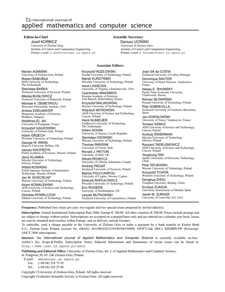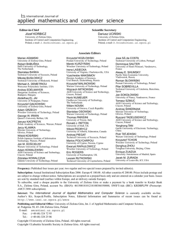 Editor-in-Chief Józef KORBICZ Scientific Secretary Dariusz UCIŃSKI University of Zielona Góra, Institute of Control and Computation Engineering, Poland, e-mail: [email protected] University of Zielona Góra, Institute of Control and Computation Engineering, Poland, e-mail: [email protected] Associate Editors Marian ADAMSKI Krzysztof KOZŁOWSKI Jose SÁ da COSTA University of Zielona Góra, Poland Poznań University of Technology, Poland Technical University of Lisbon, Portugal Robert BABUŠKA Marek KURZYŃSKI Dominique SAUTER Delft University of Technology, The Netherlands Wrocław University of Technology, Poland Irena LASIECKA University of Henri Poincaré, Vandoeurve, France Stanisław BA ŃKA University of Virginia, Charlottesville, USA Alexey E. SHUMSKY Technical University of Szczecin, Poland Vyacheslav MAKSIMOV Mikołaj BUSŁOWICZ Pacific State Economic University, Vladivostok, Russia Technical University of Białystok, Poland Russian Academy of Sciences, Ural Branch, Ekaterinburg, Russia Michael A. DEMETRIOU Krzysztof MALINOWSKI Poznań University of Technology, Poland Worcester Polytechnic Institute, USA Warsaw University of Technology, Poland Pilar SOBREVILLA Andras EDELMAYER Wojciech MITKOWSKI Technical University of Catalonia, Barcelona, Spain Roman SŁOWI ŃSKI Hungarian Academy of Sciences, Budapest, Hungary AGH University of Science and Technology, Cracow, Poland Abdelhaq EL JAI Henk NIJMEIJER University of Nancy, Vandoeuvre, France Eindhoven University of Technology, The Netherlands Tomasz SZMUC University of Perpignan, France Jan SOKOŁOWSKI Wilém NOVÁK AGH University of Science and Technology, Cracow, Poland University of Ostrava, Czech Republic Andrzej ŚWIERNIAK Stanisław OSOWSKI Warsaw University of Technology, Poland Silesian University of Technology, Gliwice, Poland Thomas PARISINI Ryszard TADEUSIEWICZ University of Trieste, Italy Ronald J. PATTON AGH University of Science and Technology, Cracow, Poland University of Hull, UK Yonghong TAN Witold PEDRYCZ University of Alberta, Edmonton, Canada Guilin Universtity of Electronic Technology, China Witold KOSI ŃSKI Andrzej PIEGAT Piotr TATJEWSKI Polish-Japanese Institute of Information Technology, Warsaw, Poland Technical University of Szczecin, Poland Warsaw University of Technology, Poland Marios POLYCARPOU Krzysztof TCHOŃ Jan M. KOŚCIELNY University of Cyprus, Nicosia, Cyprus Wrocław University of Technology, Poland Warsaw University of Technology, Poland Ewaryst RAFAJŁOWICZ Donghua ZHOU Adam KOWALEWSKI Wrocław University of Technology, Poland Tsinghua University, Beijing, China AGH University of Science and Technology, Cracow, Poland Eric ROGERS Enrique ZUAZUA University of Southampton, UK University Autonomous of Madrid, Spain Zdzisław KOWALCZUK Leszek RUTKOWSKI Jacek M. ZURADA Gdańsk University of Technology, Poland Technical University of Cz˛estochowa, Poland Krzysztof GAŁKOWSKI University of Zielona Góra, Poland Adam GRZECH Wrocław University of Technology, Poland George W. IRWIN Queen’s University Belfast, UK Janusz KACPRZYK Polish Academy of Sciences, Warsaw, Poland Jerzy KLAMKA Silesian University of Technology, Gliwice, Poland University of Louisville, KY, USA Frequency: Published four issues per year; two regular and two special issues prepared by invited editor(s). Subscription: Annual Institutional Subscription Rate 2006: Europe e 180.00. All other countries e 200.00. Prices include postage and are subject to change without notice. Subscriptions are accepted on a prepaid basis only and are entered on a calendar year basis. Issues are sent by standard mail (surface within Europe, and air delivery outside Europe). To subscribe, send a cheque payable to the University of Zielona Góra or make a payment by a bank transfer to Kredyt Bank S.A., Zielona Góra, Poland, account No. (IBAN): 46150018101218100386550000, SWIFT-Adr. (BIC): KRDBPLPW (Postscript: AMCS’2006 subscription). Internet: The International Journal of Applied Mathematics and Computer Science is currently available on-line. Author’s Kit, Scope & Profile, Subscription Notes, Editorial Information and Summaries of recent issues can be found at: http://www.issi.uz.zgora.pl/amcs Publishing and Editorial Office: University of Zielona Góra, Int. J. of Applied Mathematics and Computer Science, ul. Podgórna 50, 65–246 Zielona Góra, Poland E-mail: [email protected] Fax: (+48 68) 324 72 95 Tel.: (+48 68) 328 25 06 Copyright ©University of Zielona Góra, Poland. All rights reserved. Copyright ©Lubuskie Scientific Society in Zielona Góra. All rights reserved. Information for Authors Types of contribution. Research articles, review papers and book reviews. Submission by the Internet. Submitting the paper using the Internet considerably speeds up the submission procedure. Only PDF files that are ready to be printed can be accepted. Go to our website http://www.issi.uz.zgora.pl/amcs select Submit now and follow the instructions. Review process. All manuscript are sent to at least two independent reviewers to ensure both accuracy and relevance to the journal. The final decision on acceptance will be made by the Editor-in-Chief. Text. Typewrite with double space. Headings and subheadings for different sections of the paper should be clearly indicated and numbered using Arabic numerals. The title page should include the name and affiliation of each author, and a full correspondence address, including fax and e-mail, for the contact author. Provide an informative 100- to 250-words abstract at the head of the manuscript, and 5–7 keywords. References. All publications cited in the text should be included in the list of references following the text of the manuscript. In the text please refer to the author’s name and year of publication, e.g. (Pandolfi, 1998; 1999). Up to two authors can be mentioned in text references, e.g. (Burns and King, 1995; Rosenblum and Rovnyak, 1985); more than two authors should be shortened to the first aut