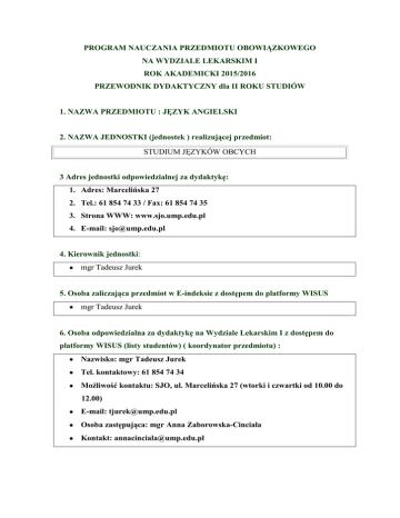 PROGRAM NAUCZANIA PRZEDMIOTU OBOWIĄZKOWEGO NA WYDZIALE LEKARSKIM I ROK AKADEMICKI 2015/2016 PRZEWODNIK DYDAKTYCZNY dla II ROKU STUDIÓW 1. NAZWA PRZEDMIOTU : JĘZYK ANGIELSKI 2. NAZWA JEDNOSTKI (jednostek ) realizującej przedmiot: STUDIUM JĘZYKÓW OBCYCH 3 Adres jednostki odpowiedzialnej za dydaktykę: 1. Adres: Marcelińska 27 2. Tel.: 61 854 74 33 / Fax: 61 854 74 35 3. Strona WWW: www.sjo.ump.edu.pl 4. E-mail: [email protected] 4. Kierownik jednostki: mgr Tadeusz Jurek 5. Osoba zaliczająca przedmiot w E-indeksie z dostępem do platformy WISUS mgr Tadeusz Jurek 6. Osoba odpowiedzialna za dydaktykę na Wydziale Lekarskim I z dostępem do platformy WISUS (listy studentów) ( koordynator przedmiotu) : Nazwisko: mgr Tadeusz Jurek Tel. kontaktowy: 61 854 74 34 Możliwość kontaktu: SJO, ul. Marcelińska 27 (wtorki i czwartki od 10.00 do 12.00) E-mail: [email protected] Osoba zastępująca: mgr Anna Zaborowska-Cinciała Kontakt: [email protected] 7. Miejsce przedmiotu w programie studiów: Rok: II Semestr: III i IV 8. Liczba godzin ogółem : 60 Jednostki uczestniczące w nauczaniu przedmiotu Studium Języków Obcych Razem: Jednostki uczestniczące w nauczaniu przedmiotu Studium Języków Obcych Razem: liczba pkt.ECTS: 3 Semestr zimowy liczba godzin W Ć Ćwiczenia S kategoria 30 30 Semestr letni liczba godzin W Ć Ćwiczenia S kategoria 30 30 9. Zakres wiedzy ( zgodnie z Rozporządzeniem Ministra Nauki i Szkolnictwa Wyższego z dnia 9 maja 2012 r. w sprawie standardów kształcenia dla kierunków Studiów: lekarskiego W zakresie wiedzy absolwent w wybranym języku obcym: C.W25 Zna nazewnictwo patomorfologiczne. C.W27 Określa przebieg kliniczny zapaleń swoistych i nieswoistych oraz opisuje procesy regeneracji tkanek i narządów. C.W30 Zna zagadnienia z zakresu szczegółowej patologii narządowej, obrazy makro- i mikroskopowe oraz przebieg kliniczny zmian patomorfologicznych w poszczególnych narządach. C.W31 Opisuje konsekwencje rozwijających się zmian patologicznych dla sąsiadujących topograficznie narządów. C.W32 Wymienia czynniki chorobotwórcze zewnętrzne i wewnętrzne, modyfikowalne i niemodyfikowalne. C.W33 Wymienia postacie kliniczne najczęstszych chorób poszczególnych układów i narządów, chorób metabolicznych oraz zaburzeń gospodarki wodno-elektrolitowej i kwasowo-zasadowej. C.W34 Charakteryzuje poszczególne grupy środków leczniczych. C.W35 Zna główne mechanizmy działania leków oraz ich przemiany w ustroju zależne od wieku. C.W38 Zna ważniejsze działania niepożądane leków, w tym wynikające z ich interakcji. D.W12 Zna zasady motywowania pacjentów do prozdrowotnych zachowań i informowania o niepomyślnym rokowaniu. D.W15 Zna zasady pracy w grupie. D.W16 Rozumie kulturowe, etniczne i narodowe uwarunkowania zachowań ludzkich. E.W1 Zna uwarunkowania środowiskowe i epidemiologiczne najczęstszych chorób. E.W13 Zna i rozróżnia podstawowe zespoły objawów neurologicznych. E.W14 Zna i rozumie przyczyny, objawy, zasady diagnozowania i postępowania terapeutycznego w najczęstszych chorobach układu nerwowego. E.W23 Zna uwarunkowania środowiskowe i epidemiologiczne najczęstszych nowotworów człowieka. E.W29 Zna zasady leczenia bólu, w tym bólu nowotworowego i przewlekłego. E.W32 Zna i rozumie przyczyny, objawy, zasady diagnozowania i postępowania terapeutycznego oraz profilaktycznego w najczęstszych chorobach bakteryjnych, wirusowych, pasożytniczych i grzybicach, w tym zakażeniach pneumokokowych, wirusowym zapaleniu wątroby, nabytym niedoborze odporności AIDS, sepsie i zakażeniach szpitalnych. E.W33 Zna podstawowe cechy, uwarunkowania środowiskowe i epidemiologiczne najczęstszych chorób skóry człowieka. E.W36 Zna i rozumie przyczyny, objawy, zasady diagnozowania i postępowania terapeutycznego w najczęstszych chorobach i specyficznych problemach w praktyce lekarza rodzinnego. E.W38 Zna podstawy teoretyczne i praktyczne diagnostyki laboratoryjnej. F.W1 Zna i rozumie przyczyny, objawy, zasady diagnozowania oraz postępowania terapeutycznego w odniesieniu do najczęstszych chorób wymagających interwencji chirurgicznej, z uwzględnieniem odrębności wieku dziecięcego. F.W4 Zna zasady bezpieczeństwa okołooperacyjnego, przygotowania pacjenta do operacji, wykonania znieczulenia ogólnego i miejscowego oraz kontrolowanej sedacji. F.W10 Zna problematykę współcześnie wykorzystywanych badań obrazowych. G.W4 Zna pojęcie zdrowia publicznego, jego cele, zadania, a także strukturę i organizację systemu ochrony zdrowia na poziomie krajowym i globalnym oraz wpływ uwarunkowań ekonomicznych na możliwości ochrony zdrowia. Umiejętności ( zgodnie z Rozporządzeniem Ministra Nauki i Szkolnictwa Wyższego z dnia 9 maja 2012 r. w sprawie standardów kształcenia dla kierunków Studiów: lekarskiego B.U11 Korzysta z baz danych, w tym internetowych i wyszukuje potrzebną informację za pomocą dostępnych narzędzi w wybranym języku obcym. D.U1 Uwzględnia w procesie postępowania terapeutycznego subiektywne potrzeby i oczekiwania pacjenta wynikające z uwarunkowań społeczno-kulturowych. D.U4 Buduje atmosferę zaufania podczas całego procesu leczenia w wybranym języku obcym. D.U5 Przeprowadza rozmowę z pacjentem dorosłym, dzieckiem i rodziną z zastosowaniem techniki aktywnego słuchania i wyrażania empatii, a także rozmawia z pacjentem o jego sytuacji życiowej w wybranym języku obcym. D.U6 Informuje pacjenta o celu, przebiegu i ewentualnym ryzyku proponowanych działań diagnostycznych lub terapeutycznych i uzyskuje jego świadomą zgodę w wybranym języku obcym. D.U7 Przekazuje pacjentowi i jego rodzinie informacje o niekorzystnym rokowaniu w wybranym języku obcym. D.U8 Udziela porady w kwestii przestrzegania zaleceń terapeutycznych i prozdrowotnego trybu życia w wybranym języku obcym. D.U11 Komunikuje się ze współpracownikami zespołu, udzielając konstruktywnej informacji zwrotnej i wsparcia w wybranym języku o