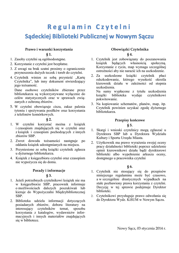 1. 2. 3. 4. 5. 1. 2. 3. 4. Prawo i warunki korzystania § 1. Zasoby czytelni są ogólnodostępne. Korzystanie z czytelni jest bezpłatne. Z uwagi na brak szatni prosimy o ograniczenie przynoszenia dużych teczek i toreb do czytelni. Czytelnik winien ze sobą przynieść „Kartę Czytelnika”, lub inny dokument stwierdzający jego tożsamość. Dane osobowe czytelników zbierane przez bibliotekarza są wykorzystywane wyłącznie do celów statystycznych oraz w sprawach związanych z ochroną zbiorów. W czytelni obowiązuje cisza, zakaz palenia tytoniu i spożywania posiłków oraz korzystania z telefonów komórkowych. § 2. W czytelni korzystać można z książek i czasopism znajdujących się w czytelni oraz z książek i czasopism pochodzących z innych zbiorów SBP. Zwrot dowodu tożsamości następuje po oddaniu książek udostępnianych na miejscu. Przyniesione ze sobą książki czytelnik zgłasza u dyżurnego bibliotekarza. Książek z księgozbioru czytelni oraz czasopism nie wypożycza się do domu. Porady i informacje § 3. 1. Jeżeli potrzebnych czytelnikowi książek nie ma w księgozbiorze SBP, pracownik informuje o możliwościach dalszych poszukiwań lub kieruje do Wypożyczalni Międzybibliotecznej SBP. 2. Biblioteka udziela informacji dotyczących posiadanych zbiorów, doboru literatury na interesujący czytelników temat, sposobu korzystania z katalogów, wydawnictw informacyjnych i innych materiałów znajdujących się w bibliotece. Obowiązki Czytelnika § 4. 1. Czytelnik jest zobowiązany do poszanowania książek będących własnością społeczną. Korzystanie z rycin, map wymaga szczególnej ostrożności aby nie narazić ich na uszkodzenie. 2. Za uszkodzone książki czytelnik płaci odszkodowanie, którego wysokość określa kierownik działu w zależności od stopnia uszkodzenia. Na sumy wypłacone z tytułu uszkodzenia książki biblioteka wydaje czytelnikowi pokwitowanie. 3. Na kopiowanie schematów, planów, map, itp. Czytelnik powinien uzyskać zgodę dyżurnego bibliotekarza. Przepisy końcowe § 5. 1. Skargi i wnioski czytelnicy mogą zgłaszać u Dyrektora SBP lub u Dyrektora Wydziału Kultury i Sportu Urzędu Miasta. 2. Użytkownik ma prawo wyrażenia swojej oceny pracy działalności biblioteki poprzez udzielenie opinii kierownikowi działu bądź dyrektorowi biblioteki albo wypełnienie arkusza oceny, dostępnego u pracownika czytelni § 6. 1. Czytelnik nie stosujący się do przepisów niniejszego regulaminu może być czasowo, a w szczególnie drastycznych wypadkach na stałe pozbawiony prawa korzystania z czytelni. Decyzję w tej sprawie podejmuje Dyrektor biblioteki. 2. Czytelnikowi przysługuje prawo odwołania się do Dyrektora Wydz. KiSUM w Nowym Sączu. Nowy Sącz, 03 stycznia 2014 r.