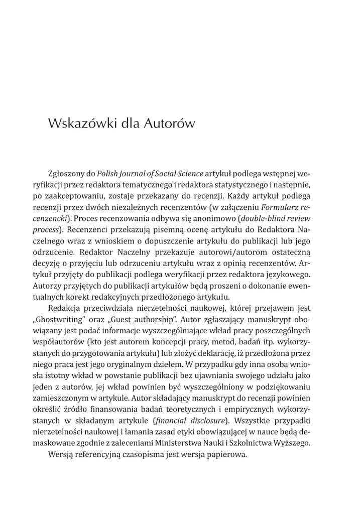 Wskazówki dla Autorów Zgłoszony do Polish Journal of Social Science artykuł podlega wstępnej weryfikacji przez redaktora tematycznego i redaktora statystycznego i następnie, po zaakceptowaniu, zostaje przekazany do recenzji. Każdy artykuł podlega recenzji przez dwóch niezależnych recenzentów (w załączeniu Formularz recenzencki). Proces recenzowania odbywa się anonimowo (double-blind review process). Recenzenci przekazują pisemną ocenę artykułu do Redaktora Naczelnego wraz z wnioskiem o dopuszczenie artykułu do publikacji lub jego odrzucenie. Redaktor Naczelny przekazuje autorowi/autorom ostateczną decyzję o przyjęciu lub odrzuceniu artykułu wraz z opinią recenzentów. Artykuł przyjęty do publikacji podlega weryfikacji przez redaktora językowego. Autorzy przyjętych do publikacji artykułów będą proszeni o dokonanie ewentualnych korekt redakcyjnych przedłożonego artykułu. Redakcja przeciwdziała nierzetelności naukowej, której przejawem jest „Ghostwriting” oraz „Guest authorship”. Autor zgłaszający manuskrypt obowiązany jest podać informacje wyszczególniające wkład pracy poszczególnych współautorów (kto jest autorem koncepcji pracy, metod, badań itp. wykorzystanych do przygotowania artykułu) lub złożyć deklarację, iż przedłożona przez niego praca jest jego oryginalnym dziełem. W przypadku gdy inna osoba wniosła istotny wkład w powstanie publikacji bez ujawniania swojego udziału jako jeden z autorów, jej wkład powinien być wyszczególniony w podziękowaniu zamieszczonym w artykule. Autor składający manuskrypt do recenzji powinien określić źródło finansowania badań teoretycznych i empirycznych wykorzystanych w składanym artykule (financial disclosure). Wszystkie przypadki nierzetelności naukowej i łamania zasad etyki obowiązującej w nauce będą demaskowane zgodnie z zaleceniami Ministerstwa Nauki i Szkolnictwa Wyższego. Wersją referencyjną czasopisma jest wersja papierowa. 178 Wskazówki dla Autorów Wskazówki redakcyjne: 1) Redaktor tematyczny zatwierdza artykuły teoretyczne, doniesienia z badań empirycznych, przeglądy, raporty zgodne z teoretycznym profilem czasopisma. Wysłanie artykułu do redaktora tematycznego powinno być uważane za jednoznaczne z deklaracją, że artykuł ten nie był złożony do innego wydawcy. Otrzymane artykuły będą recenzowane i akceptowane do publikacji indywidualnie. 2) Polish Journal of Social Science jest otwarty na międzydyscyplinarną dyskusję dotyczącą szerokiego zakresu problemów społecznych (w tym: filozofia, pedagogika, psychologia, socjologia, nauki polityczne). 3) Każdy rękopis powinien spełniać następujące wymogi: a. Powinien być przygotowany w formacie A4, w dwóch egzemplarzach (dodatkowo polscy autorzy proszeni są o przygotowanie 2 egzemplarzy rękopisu w JĘZYKU POLSKIM). Wymagana jest podwójna interlinia, druk jednostronny, czcionka Times New Roman, wielkość 12, maksymalnie 30 linii i 2000 znaków na stronę, margines 4 cm po lewej stronie. Zaleca się stosowanie stylu „normal”. Każdy rękopis powinien być wydrukowany w kolorystyce czarno-białej, prosimy o stosowanie dla grafik jedynie odcieni szarości. Artykuły i wynik badań empirycznych wraz z odnośnikami, bibliografią, rysunkami i tabelami nie powinny przekraczać 22 stron, a przeglądy nie powinny przekraczać 8 stron. b. Wszystkie rękopisy powinny zawierać odpowiedni tytuł odnoszący się w sposób jasny do treści. Raporty z badań empirycznych powinny zawierać: wyraźnie wydzielone wprowadzenie, zastosowane metody badawcze, wyniki oraz dyskusję. Ponumerowane rysunki, tabele i bibliografia powinny być przygotowane oddzielnie i umieszczone na końcu rękopisu wraz ze wskazaniem miejsca, w którym powinny być umieszczone w tekście. Rękopis powinien zawierać streszczenie w języku angielskim i polskim zawierające około 120 słów, umieszczone na oddzielnej stronie, a także informację o Autorze: tytuł publikacji, nazwisko Autora, stopień naukowy, afiliację, adres do korespondencji, nr telefonu i faksu, adres e-mail. c. Prace cytowane w tekście powinny być sporządzone w jednym formacie. Nazwisko powinno być podane jako pierwsze, następnie (w nawiasach) rok wydania np. (Bernie, Pietrulewicz, 1997). W przypadku publikacji w języku polskim obok tytułu oryginalnego w języku polskim Wskazówki dla Autorów 179 należy podać w nawiasie jego angielskie tłumaczenie. Każda pozycja w bibliografii powinna być umieszczona w porządku alfabetycznym na końcu artykułu, zgodnie z następującym przykładem: Autor, A.A. (1999). Tytuł pracy. Miejsce wydania: Wydawca. Autor, A.A., Autor, B.B. & Autor, C.C. (1999). Tytuł artykułu. Tytuł Czasopisma, xx, xxx-xxx. Autor, A.A. (1999). Tytuł artykułu. W: A. Autor, B. Autor (red.). Tytuł pracy. Miejsce wydania: Wydawca. Autor, A.A. (1999). Tytuł pracy [Title of work]. Miejsce wydania: Wydawca. Cytowana bibliografia powinna być kompletna i sporządzona zgodnie z powyższym przykładem. 4) W przypadku zaakceptowania rękopisu do druku, powinien on zostać wysłany do autora celem dokonania korekty. Po korekcie autor, tak szybko jak to możliwe, powinien przesłać końcową wersję na płycie CD lub innym nośniku danych wraz z egzemplarzem drukowanym do Wydawcy. 180 Wskazówki dla Autorów Formularz recenzencki. Recenzent: Redakcja Polish Journal of Social Science A B Kod artykułu………………. Formularz Recenzji Artykułu Zwracamy się z prośbą o recenzję artykułu, który wpłynął do Redakcji. Recenzja ta jest poufna. Proszę o ocenę według poniższego wzoru i przedstawienie szczegółowych, merytorycznych uwag na odwrocie lub dodatkowej kartce. Z poważaniem, Redaktor Naukowy Polish Journal of Social Science Mieczysław Plopa Recenzja dotyczy artykułu pod tytułem: Opinia Recenzenta: Kategoria oceny Znakomite Ugruntowanie teoretyczne Klarowność wywodu Nowatorstwo/oryginalność Standardy m