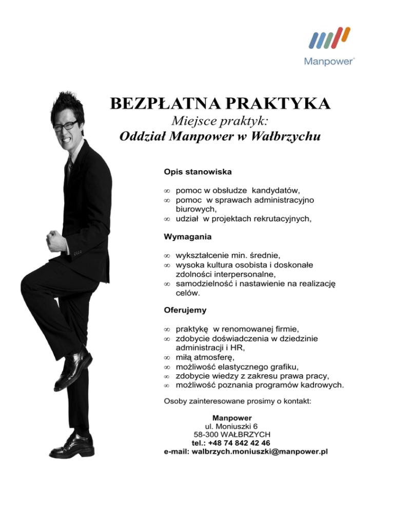 BEZPŁATNA PRAKTYKA Miejsce praktyk: Oddział Manpower w Wałbrzychu Opis stanowiska • pomoc w obsłudze kandydatów, • pomoc w sprawach administracyjno biurowych, • udział w projektach rekrutacyjnych, Wymagania • wykształcenie min. średnie, • wysoka kultura osobista i doskonałe zdolności interpersonalne, • samodzielność i nastawienie na realizację celów. Oferujemy • praktykę w renomowanej firmie, • zdobycie doświadczenia w dziedzinie administracji i HR, • miłą atmosferę, • moŜliwość elastycznego grafiku, • zdobycie wiedzy z zakresu prawa pracy, • moŜliwość poznania programów kadrowych. Osoby zainteresowane prosimy o kontakt: Manpower ul. Moniuszki 6 58-300 WAŁBRZYCH tel.: +48 74 842 42 46 e-mail: [email protected]