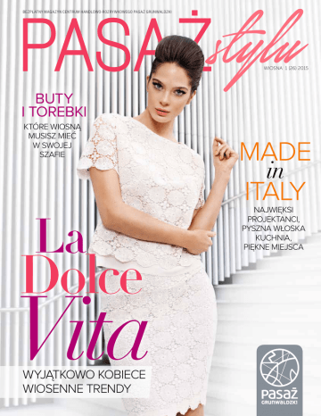 BEZPŁATNY MAGAZYN CENTRUM HANDLOWO-ROZRYWKOWEGO PASAŻ GRUNWALDZKI WIOSNA 1 (26) 2015 BUTY I TOREBKI KTÓRE WIOSNĄ MUSISZ MIEĆ W SWOJEJ SZAFIE La Dolce Vita WYJĄTKOWO KOBIECE WIOSENNE TRENDY MADE in ITALY NAJWIĘKSI PROJEKTANCI, PYSZNA WŁOSKA KUCHNIA, PIĘKNE MIEJSCA Ubranianie znaczą dopóki nic, nikt ich SPECIALS! 4 Kulisy sesji 6 Zakupy i rozrywka 8 Bohaterowie sezonu 10 Must have nie nosi TRENDY 12 Trendy dla niej 50 Trendy dla niego MODA 14 W bieli 16 Indian summer 18 Denim i pastele 20 Kwiaty 22 W stronę słońca 24 Rajskie ptaki 25 Motyw węża 26 L a dolce vita 52 Zrobiony na szaro 54 Casual on time 56 Postaw na kolor 58 Wyprawa do zoo 60 We love prints STYL 34 Made in Italy 40 Barwna, wiosenna 42 Seksowna od zaraz 48 Pitti Immagine Uomo LIFESTYLE 44 Włoskie wakacje 62 Moda na rower 66 Stile italiano 68 L a cucina italiana KULTURA onica Bellucci 38 M 64 Miasto kultury S ezon wiosenny zapowiada się wyjątkowo ciekawie. Spośród wielu proponowanych przez projektantów trendów wybraliśmy te najciekawsze i sprawdziliśmy, jakie stylowe rzeczy można znaleźć w naszych sklepach. W najbliższych miesiącach warto uzupełnić garderobę o ubrania i dodatki w stylu lat 70. i boho. Na pewno będziemy też nosić pastele, denim i żółty. Panowie również nie mogą narzekać na nudę, bo hitem są kolorowe koszule i pastelowe dodatki. Jak połączyć ze sobą modne ubrania, możecie zobaczyć w przygotowanej przez nas sesji mody. Wszystkie pokazane tam rzeczy znajdziecie Państwo w sklepach, w naszym centrum handlowym. W tym numerze „Pasażu Stylu” przedstawiamy nie tylko trendy, ale zdradzamy także kilka sekretów ze świata mody: jak ubrać się w stylu największych włoskich projektantów, czym są targi Pitti Immagine Uomo albo co najbardziej lubi nosić Monica Bellucci. Co ponadto? Trendy w wiosennym makijażu, nowości wśród kosmetyków do pielęgnacji, bajecznie kolorowa biżuteria i dodatki, wśród których każda kobieta znajdzie coś dla siebie. Nowości książkowe i najważniejsze wydarzenia kulturalne. Zapraszamy też do wspólnego spędzania czasu w Pasażu! SIMPLE Dyrekcja Pasażu Grunwaldzkiego FOTO NA OKŁADCE: Caterina; Spódnica: 490 zł Bluzka: 720 zł STYLIZACJA NA ZDJĘCIU Bluzka Dom Mody 289 zł Kurtka Piano Fashion 199 zł Spódnica Mohito 119,99 Torebka Kazar 529 zł 4 SPECIALS! Lakier Collistar 35 zł Cienie do powiek Collistar 65 zł PRZYWITAJ WIOSNĘ Z BIŻUTERIĄ PANDORA! Maskara Collistar 99 zł Kulisy naszej SESJI Olejek Collistar 99 zł Piękna dziewczyna, WSPANIAŁE ubrania, dużo pracy, ale też dobrej ZABAWY. Zobaczcie, jak powstawała sesja MODOWA do magazynu. Urocze miejsce, znakomity fotograf, to musiał być udany dzień. Profesjonalny make-up modelki wykonała makijażystka marki Collistar, Klaudia Kupidłowska, za pomocą nowej kolekcji kosmetyków Collistar wiosna–lato 2015 UNEXPECTED (dostępnej w Douglas). Wszystkie ubrania i dodatki stylistki wybrały z bogatej oferty sklepów Pasażu Grunwaldzkiego. Powstało 9 kobiecych i nowoczesnych stylizacji, które – mamy nadzieję – przypadną do gustu. Charmsy od 79 zł Podkład Collistar 159 zł Foto: Shutterstock, materiały prasowe Róż Collistar 139 zł MOJA HISTORIA, MÓJ STYL Odkryj nową kolekcję biżuterii PANDORA zainspirowaną magią natury. Odwiedź autoryzowany salon salon PANDORA w Pasażu Grunwaldzkim - POZIOM 0. www.pandora.net 7 SPECIALS! Kurtka Monnari 399 zł MONNARI MONNARI BRIJU Uwielbiana przez eleganckie kobiety polska marka wkrótce pojawi się w Pasażu. Monnari to przede wszystkim ubrania odzwierciedlające światowe trendy mody, interpretowanej poprzez pryzmat ponaczasowej klasyki. Idealne dla nowoczesnych kobiet, lubiących podkreślać swoją kobiecość. Monnari to także bogaty wybór dodatków: torby, buty, szale, biżuteria. POZIOM +1 Zakupy & Sweterek Monnari 179 zł POZIOM 0 ROZRYWKA Czas na wiosenne PORZĄDKI w szafie! Jest już miejsce na coś NOWEGO? Zapraszamy na zakupy do Pasażu! W naszych sklepach GORĄCE trendy sezonu. Puder Kiko 65 zł KORNECKI 1 6 od marca do kwietnia LOTERIA „NAGRODY ZA PARAGONY” Pierścionek Briju 689,99 zł Kolczyki Briju 370 zł GIACOMO CONTI To tu modny mężczyzna znajdzie wszystko, czego potrzebuje na co dzień, do pracy i na specjalne okazje. W jednym salonie: garnitury, smokingi, koszule, krawaty, płaszcze, swetry czy buty. Wszystkie o prawdziwie „włoskiej osobowości”, pozwalającej zmienić polskie ulice i rzeczywistość biznesową w najmodniejsze zakątki Mediolanu. WRÓĆ DO FORMY NA WIOSNĘ! Przyjdź i dowiedz się, co zrobić, aby rozpocząć wiosnę w dobrej formie! Zapraszamy na pokazy fitness i tańca organizowane przez trenerów PURE Jatomi Fitness. 28 marca TRADYCYJNE STOŁY WIELKANOCNE Prezentacje tradycyjnych stołów wielkanocnych przygotowanych przez gospodynie z dolnośląskich Kół Gospodyń Wiejskich. pomysłu Bardzo popularna we Włoszech marka kosmetyczna wreszcie w Pasażu. Kiko Milano to włoskie profesjonalne kosmetyki do makijażu i pielęgnacji. Najbardziej rozpoznawalnym produktem są ich lakiery do paznokci, dostępne w każdym możliwym kolorze. Kiko przyświeca idea luksusowych kosmetyków dostępnych dla osób z każdym budżetem. POZIOM 0 Foto: Shutterstock, materiały prasowe MBANK Czółenka Kornecki 119 zł 21 marca Nie masz KIKO Buty dziecięce Kornecki 109 zł Codziennie do zdobycia iPad mini i bony na zakupy w sklepach Pasażu. Łączna pula nagród to 80 070 zł! Regulamin loterii na www.pasazgrunwaldzki.pl POZIOM 0 Poszetka Giacomo Conti 79 zł POZIOM -1 Wydarzenia W PASAŻU GRUNWALDZKIM Cień Kiko 29 zł Nowy sklep zaprasza na zakupy wszystkich: młodszych i starszych. Kornecki to polski producent obuwia dziecięcego, młodzieżowego i damskiego, który łączy nowoczesne i modne fasony z wygodą i starannym wykonaniem. Kornecki to buty idealne dla całej rodziny. Baleriny młodzieżowe Kornecki 109 zł Pierścionek Briju 74 zł Wyjątkowa biżuteria, 