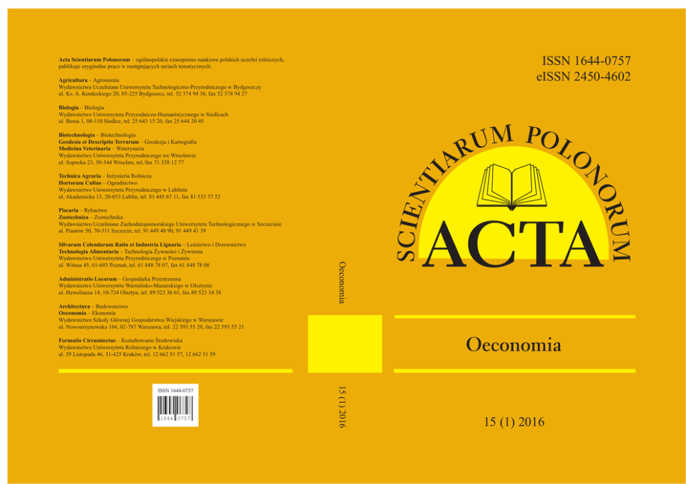 ISSN 1644-0757 eISSN 2450-4602 Acta Scientiarum Polonorum – ogólnopolskie czasopismo naukowe polskich uczelni rolniczych, publikuje oryginalne prace w następujących seriach tematycznych: Agricultura – Agronomia Wydawnictwa Uczelniane Uniwersytetu Technologiczno-Przyrodniczego w Bydgoszczy ul. Ks. A. Kordeckiego 20, 85-225 Bydgoszcz, tel. 52 374 94 36, fax 52 374 94 27 Biologia – Biologia Wydawnictwo Uniwersytetu Przyrodniczo-Humanistycznego w Siedlcach ul. Bema 1, 08-110 Siedlce, tel. 25 643 15 20, fax 25 644 20 45 Biotechnologia – Biotechnologia Geodesia et Descriptio Terrarum – Geodezja i Kartografia Medicina Veterinaria – Weterynaria Wydawnictwo Uniwersytetu Przyrodniczego we Wrocławiu ul. Sopocka 23, 50-344 Wrocław, tel./fax 71 328 12 77 Technica Agraria – Inżynieria Rolnicza Hortorum Cultus – Ogrodnictwo Wydawnictwo Uniwersytetu Przyrodniczego w Lublinie ul. Akademicka 13, 20-033 Lublin, tel. 81 445 67 11, fax 81 533 37 52 Piscaria – Rybactwo Zootechnica – Zootechnika Wydawnictwo Uczelniane Zachodniopomorskiego Uniwersytetu Technologicznego w Szczecinie al. Piastów 50, 70-311 Szczecin, tel. 91 449 40 90, 91 449 41 39 Administratio Locorum – Gospodarka Przestrzenna Wydawnictwo Uniwersytetu Warmińsko-Mazurskiego w Olsztynie ul. Heweliusza 14, 10-724 Olsztyn, tel. 89 523 36 61, fax 89 523 34 38 Architectura – Budownictwo Oeconomia – Ekonomia Wydawnictwo Szkoły Głównej Gospodarstwa Wiejskiego w Warszawie ul. Nowoursynowska 166, 02-787 Warszawa, tel. 22 593 55 20, fax 22 593 55 21 Oeconomia Silvarum Colendarum Ratio et Industria Lignaria – Leśnictwo i Drzewnictwo Technologia Alimentaria – Technologia Żywności i Żywienia Wydawnictwo Uniwersytetu Przyrodniczego w Poznaniu ul. Witosa 45, 61-693 Poznań, tel. 61 848 78 07, fax 61 848 78 08 Formatio Circumiectus – Kształtowanie Środowiska Wydawnictwo Uniwersytetu Rolniczego w Krakowie al. 29 Listopada 46, 31-425 Kraków, tel. 12 662 51 57, 12 662 51 59 1644 0757 15 (1) 2016 ISSN 1644-0757 15 (1) 2016 ACTA SCIENTIARUM POLONORUM Czasopismo naukowe założone w 200l roku przez polskie uczelnie rolnicze Scientific Journal established in 2001 by Polish Life Sciences Universities Oeconomia Economics Ekonomia 15 (1) 2016 Bydgoszcz Kraków Lublin Olsztyn Poznań Siedlce Szczecin Warszawa Wrocław Acta Scientiarum Polonorum Programming Board Wiesław Nagórko (Warszawa), Ryszard Źróbek (Olsztyn), Józef Bieniek (Kraków), Krzysztof Szkucik (Lublin), Ewa Sobecka (Szczecin), Janusz Prusiński (Bydgoszcz), Jerzy Sobota (Wrocław) – chairman, Stanisław Socha (Siedlce), Waldemar Uchman (Poznań) Oeconomia Scientific Board Carol J. Cumber (South Dakota State University, Brookings, USA), Roman Kisiel (University of Warmia and Mazury, Olsztyn, PL), Joseph Andrew Kuzilwa (Mzumbe University, Tanzania), Lubos Smutka (Czech University of Life Sciences, Prague, CZ), Wiesław Musiał (University of Agriculture in Krakow, Kraków, PL), Janina Sawicka (Warsaw University of Life Sciences – SGGW, Warszawa, PL) – chairperson, Harun Ucak (Muğla Sıtkı Koçman University, Muğla, TR), Dorota Witkowska (University of Łodz, Łódź, PL) Andra Zvirbule-Bērziņa (Latvia University of Agriculture, LV) Editing committee Jan Kiryjow – Warsaw University of Life Sciences Press Paulina Stolarczyk (WULS-SGGW) – Oeconomia secretary Paulina Tuka (WULS-SGGW) – Oeconomia secretary Marcin Chciałowski (WULS-SGGW) – Oeconomia secretary Renata Marks-Bielska – University of Warmia and Mazury in Olsztyn – thematic editor, Tomasz Wojewodzic – University of Agriculture in Krakow – thematic editor, Wojciech Pizło – WULS-SGGW – thematic editor, Iwona Pomianek – WULS-SGGW – thematic editor, Aleksandra Matuszewska-Janica – WULS-SGGW – statistical editor, Kuo-Liang “Matt” Chiang – South Dakota State University – language consultant The printed version of Acta Scientiarum Polonorum Oeconomia is an initial version of the journal Editorial staff Anna Dołomisiewicz, Laura Szczepańska ISSN 1644-0757, eISSN 2450-4602 Edition: 200 prints © Copyright by Warsaw University of Life Sciences Press Wydawnictwo SGGW, ul. Nowoursynowska 166, 02-787 Warszawa tel. 22 593 55 20 (-22; -25 – sprzedaż), fax 22 593 55 21 e-mail: [email protected] www.wydawnictwosggw.pl Print: Agencja Reklamowo-Wydawnicza A. Grzegorczyk, www.grzeg.com.pl From the Scientific Board There has been the fifteenth year of the Acta Scientiarum Polonorum Oeconomia publishing. The Acta is the periodical including several thematic series with uniform graphics and similar format. The publication was set up by group of enthusiasts – employees of life sciences universities and has been published under the patronage of rectors of these universities. Constant involvement of academic society in increasing substantive and editorial level of the series, with efforts of the authors, the Programming Board and the Scientific Boards, has contributed to placing the Acta Scientiarum Polonorum (and our Oeconomia series) on the noticeable position in academic research society. Articles can be prepared in English with Polish title, abstract and keywords. Moreover, we publish latest issues in English only. The Scientific Board of the Oeconomia series, concerning the publication range, focuses its attention both on substantive content and precision of the form. The articles are revised in “double-blind review” process. Whole content of the Acta Scientiarum Polonorum Oeconomia is available in electronic version on the following website http://acta_oeconomia.sggw.pl. We are glad to inform that Acta Scientiarum Polonorum Oeconomia are indexed within the AGRIS-FAO, EBSCO, SIGŻ, Copernicus Index, AGRO, BazEkon, POL-index. Since 2015 each article published in Acta Sci. Pol. Oeconomia has 15 points at the Ministry of Science and Higher Education ranking list. Please send the articles on one of following e-mail addresses: [email protected] [email protected] While 
