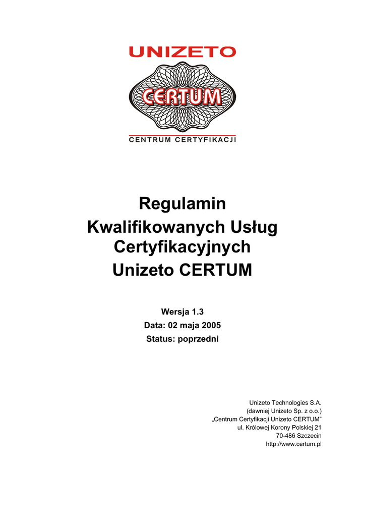 Regulamin Kwalifikowanych Usług Certyfikacyjnych Unizeto CERTUM