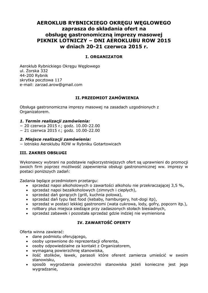 AEROKLUB RYBNICKIEGO OKRĘGU WĘGLOWEGO zaprasza do składania ofert na obsługę gastronomiczną imprezy masowej PIKNIK LOTNICZY – DNI AEROKLUBU ROW 2015 w dniach 20-21 czerwca 2015 r. I. ORGANIZATOR Aeroklub Rybnickiego Okręgu Węglowego ul. Żorska 332 44-200 Rybnik skrytka pocztowa 117 e-mail: [email protected] II. PRZEDMIOT ZAMÓWIENIA Obsługa gastronomiczna imprezy masowej na zasadach uzgodnionych z Organizatorem. 1. Termin realizacji zamówienia: − 20 czerwca 2015 r.; godz. 10.00-22.00 − 21 czerwca 2015 r.; godz. 10.00-22.00 2. Miejsce realizacji zamówienia: − lotnisko Aeroklubu ROW w Rybniku Gotartowicach III. ZAKRES OBSŁUGI Wykonawcy wybrani na podstawie najkorzystniejszych ofert są uprawnieni do promocji swoich firm poprzez możliwość zapewnienia obsługi gastronomicznej ww. imprezy w postaci poniższych zadań: Zadania będące przedmiotem przetargu: sprzedaż napoi alkoholowych o zawartości alkoholu nie przekraczającej 3,5 %, sprzedaż napoi bezalkoholowych (zimnych i ciepłych), sprzedaż dań gorących (grill, kuchnia polowa), sprzedaż dań typu fast food (kebaby, hamburgery, hot-dogi itp), sprzedaż w postaci lekkiej gastronomi (wata cukrowa, lody, gofry, popcorn itp.), rollbary plus miejsca siedzące przy zadaszonych stołach biesiadnych, sprzedaż zabawek i pozostała sprzedaż gdzie indziej nie wymieniona IV. ZAWARTOŚĆ OFERTY Oferta winna zawierać: dane podmiotu oferującego, osoby uprawnione do reprezentacji oferenta, osoby odpowiedzialne za kontakt z Organizatorem, wymaganą powierzchnię stanowiska, ilość stolików, ławek, parasoli które oferent zamierza umieścić w swoim stanowisku, sposób wygrodzenia powierzchni stanowiska jeżeli konieczne jest jego wygradzanie, ilość personelu obsługującego, oświadczenie o posiadaniu polisy OC z tytułu prowadzonej działalności, referencje z przeprowadzenia podobnych imprez masowych V. ZOBOWIĄZANIA STRON 1. Wykonawca jest zobowiązany do: wpłacenia kaucji w wysokości 10% oferowanej kwoty w dniu podpisania umowy wpłacenia na konto Organizatora opłaty za obsługę gastronomiczną (według kwoty podanej w ofercie) w dwóch ratach, pierwsza w kwocie 50% najpóźniej do 30 dni przed realizacją imprezy, druga najpóźniej na tydzień przed imprezą, wystawienia stoisk na terenie realizacji imprezy w miejscach wyznaczonych przez Organizatora, obsługi stoisk gastronomicznych w wyznaczonym terminie i godzinach trwania imprezy, bieżącego utrzymania czystości zajmowanego terenu (własne kubły na śmieci, worki dla obsługi i klientów stoiska), stołów oraz uprzątnięcia zajmowanego miejsca po pierwszym dniu oraz po zakończeniu całej imprezy, sprzedaży napojów wszelkiego typu wyłącznie w opakowaniach, kubkach i kuflach plastikowych lub styropianowych, posiadania odpowiedniej liczby i jakości sprzętu umożliwiającego sprawne przygotowanie i podawanie posiłków (kuchnie, grille, przyczepy gastronomiczne, chłodnie, agregaty prądotwórcze itp.), posiadania podręcznego sprzętu gaśniczego, ustawionego przy punktach gastronomicznych, przestrzegania postanowienia Organizatora w zakresie zapewnienia porządku i bezpieczeństwa przebiegu imprezy oraz ustawy o bezpieczeństwie imprez masowych, posiadania aktualnego, wymaganego pozwolenia na prowadzenie swej działalności (m.in. zezwolenia na sprzedaż napojów alkoholowych na terenie powiatu rybnickiego), niezbędnej wiedzy, doświadczenia, potencjału technicznego oraz osób zdolnych do wykonywania zadań ujętych w ofercie, zabezpieczenia we własnym zakresie okablowania do miejsca z urządzeniami elektrycznymi (przewody odpowiadające wymogom BHP i warunkom techniczno - elektrycznym) wymaganymi do sprawnej obsługi stoisk gastronomicznych, dostarczenia własnych agregatów prądotwórczych o mocy pozwalającej na niezależne od Organizatora zasilanie własnych urządzeń 2. Organizator jest zobowiązany do: zapewnienia wyłączności na handel przez Wykonawcę na terenie imprezy w zakresie określonym w pkt. III, z wyłączeniem stoisk o których mówi pkt. IV/3, udzielenia Wykonawcy pomocy w prowadzeniu działań reklamowych w dniach odbywania się imprezy, o której mowa w umowie, zapewnienia, że obecny na terenie podmiot prowadzący usługi gastronomiczne (PILOT) będzie je realizował w dniach 20 oraz 21.06.2015 zgodnie z zapisami umowy. 3. Organizator jest uprawniony do umieszczenia w miejscu realizacji imprezy następujących stoisk: stoisk Organizatora, stoisk promocyjnych sponsorów imprezy, pozostałych stoisk promocyjnych Wszelkie kwestie związane z odpłatnością za powyższe stoiska pozostają w gestii Organizatora. VI PROCEDURA WYBORU OFERTY Nie dopuszcza się składania ofert częściowych. Kryteria oceny ofert: wysokość proponowanej ceny atrakcyjność i różnorodność zaproponowanego asortymentu gastronomicznego, udokumentowane doświadczenie w organizacji obsługi gastronomicznej na imprezach masowych, mile widziana dokumentacja fot. z organizacji innych cateringów na imprezach masowych. Termin składania ofert upływa z dniem: 27.03.2015 r. Miejsce składania ofert: osobiście lub drogą pocztową, na adres: Aeroklub Rybnickiego Okręgu Węglowego ul. Żorska 332 44-200 Rybnik skr. Pocztowa 117 +48 530 565 201 +48 535 993 008 drogą mailową na adres: [email protected] Oferty należy składać w zaklejonej kopercie. Informacja o wyborze Wykonawcy zostanie przekazana pocztą elektroniczną, do 7 dni po terminie składania ofert. Wykonawcy, których oferty zostaną uznane za najkorzystniejsze zobowiązani są do zawarcia umowy w terminie i miejscu wskazanym przez Organizatora (informacja zostanie przekazana pisemnie, z co najmniej 2 dniowym wyprzedzeniem). W wypadku nie przystąpienia do zawarcia umowy Wykonawcy z najkorzystniejszą ofertą, Organizator wezwie do zawarcia umowy kolejnego Wykonawcę, który zaproponował najlepszą ofertę za wyłączność obsługi.