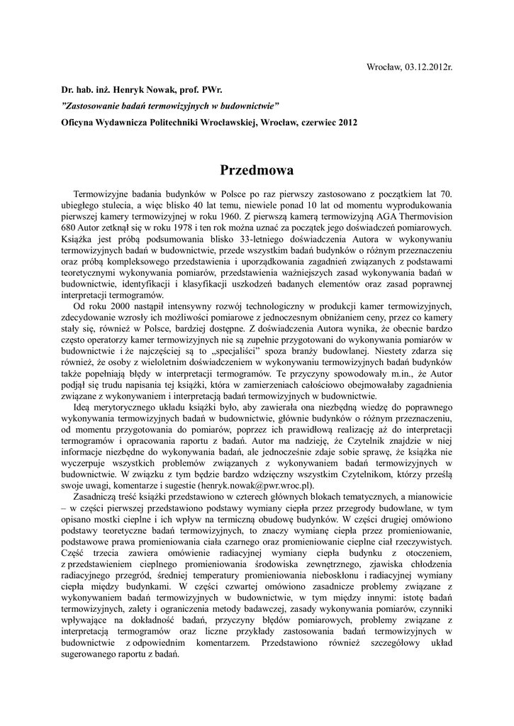 Wrocław, 03.12.2012r. Dr. hab. inż. Henryk Nowak, prof. PWr. ”Zastosowanie badań termowizyjnych w budownictwie” Oficyna Wydawnicza Politechniki Wrocławskiej, Wrocław, czerwiec 2012 Przedmowa Termowizyjne badania budynków w Polsce po raz pierwszy zastosowano z początkiem lat 70. ubiegłego stulecia, a więc blisko 40 lat temu, niewiele ponad 10 lat od momentu wyprodukowania pierwszej kamery termowizyjnej w roku 1960. Z pierwszą kamerą termowizyjną AGA Thermovision 680 Autor zetknął się w roku 1978 i ten rok można uznać za początek jego doświadczeń pomiarowych. Książka jest próbą podsumowania blisko 33-letniego doświadczenia Autora w wykonywaniu termowizyjnych badań w budownictwie, przede wszystkim badań budynków o różnym przeznaczeniu oraz próbą kompleksowego przedstawienia i uporządkowania zagadnień związanych z podstawami teoretycznymi wykonywania pomiarów, przedstawienia ważniejszych zasad wykonywania badań w budownictwie, identyfikacji i klasyfikacji uszkodzeń badanych elementów oraz zasad poprawnej interpretacji termogramów. Od roku 2000 nastąpił intensywny rozwój technologiczny w produkcji kamer termowizyjnych, zdecydowanie wzrosły ich możliwości pomiarowe z jednoczesnym obniżaniem ceny, przez co kamery stały się, również w Polsce, bardziej dostępne. Z doświadczenia Autora wynika, że obecnie bardzo często operatorzy kamer termowizyjnych nie są zupełnie przygotowani do wykonywania pomiarów w budownictwie i że najczęściej są to „specjaliści” spoza branży budowlanej. Niestety zdarza się również, że osoby z wieloletnim doświadczeniem w wykonywaniu termowizyjnych badań budynków także popełniają błędy w interpretacji termogramów. Te przyczyny spowodowały m.in., że Autor podjął się trudu napisania tej książki, która w zamierzeniach całościowo obejmowałaby zagadnienia związane z wykonywaniem i interpretacją badań termowizyjnych w budownictwie. Ideą merytorycznego układu książki było, aby zawierała ona niezbędną wiedzę do poprawnego wykonywania termowizyjnych badań w budownictwie, głównie budynków o różnym przeznaczeniu, od momentu przygotowania do pomiarów, poprzez ich prawidłową realizację aż do interpretacji termogramów i opracowania raportu z badań. Autor ma nadzieję, że Czytelnik znajdzie w niej informacje niezbędne do wykonywania badań, ale jednocześnie zdaje sobie sprawę, że książka nie wyczerpuje wszystkich problemów związanych z wykonywaniem badań termowizyjnych w budownictwie. W związku z tym będzie bardzo wdzięczny wszystkim Czytelnikom, którzy prześlą swoje uwagi, komentarze i sugestie ([email protected]). Zasadniczą treść książki przedstawiono w czterech głównych blokach tematycznych, a mianowicie – w części pierwszej przedstawiono podstawy wymiany ciepła przez przegrody budowlane, w tym opisano mostki cieplne i ich wpływ na termiczną obudowę budynków. W części drugiej omówiono podstawy teoretyczne badań termowizyjnych, to znaczy wymianę ciepła przez promieniowanie, podstawowe prawa promieniowania ciała czarnego oraz promieniowanie cieplne ciał rzeczywistych. Część trzecia zawiera omówienie radiacyjnej wymiany ciepła budynku z otoczeniem, z przedstawieniem cieplnego promieniowania środowiska zewnętrznego, zjawiska chłodzenia radiacyjnego przegród, średniej temperatury promieniowania nieboskłonu i radiacyjnej wymiany ciepła między budynkami. W części czwartej omówiono zasadnicze problemy związane z wykonywaniem badań termowizyjnych w budownictwie, w tym między innymi: istotę badań termowizyjnych, zalety i ograniczenia metody badawczej, zasady wykonywania pomiarów, czynniki wpływające na dokładność badań, przyczyny błędów pomiarowych, problemy związane z interpretacją termogramów oraz liczne przykłady zastosowania badań termowizyjnych w budownictwie z odpowiednim komentarzem. Przedstawiono również szczegółowy układ sugerowanego raportu z badań. Zawarty w książce materiał merytoryczny jest wynikiem zarówno szerokich studiów literatury specjalistycznej, jak i wieloletniego doświadczenia w zakresie uprawianej dziedziny wiedzy, tj. fizyki budowli, z ukierunkowaniem między innymi na oddziaływanie cieplnego promieniowania środowiska zewnętrznego na budynki i radiacyjnej wymiany ciepła przegród budowlanych (rozprawa habilitacyjna, 1999 [126]). Wpływ na zawartość książki miało oczywiście również wieloletnie doświadczenie praktyczne w wykonywaniu badań termowizyjnych oraz doświadczenie dydaktyczne w prowadzeniu seminariów i szkoleń w zakresie zastosowania badań termowizyjnych w budownictwie. Wyjaśnienia wymaga również kwestia nazewnictwa – w literaturze tematu oprócz pojęcia termowizja (ang. thermovision) spotyka się również pojęcie termografia (ang. thermography). Pojęcie termografia stosowane było od samego początku produkcji kamer termowizyjnych, co prawdopodobnie miało związek z ówczesnym sposobem rejestracji obrazu na papierze ciepłoczułym – najpierw rejestrowano obraz, a dopiero po wywołaniu można go było obserwować. Termin termowizja zaczęto stosować później i prawdopodobnie miało to związek z nazwą pierwszych kamer serii AGA Thermovision. Obecnie wszystkie systemy obrazowania termalnego są nazywane kamerami termowizyjnymi. Pojęcia termografia i termowizja można zatem stosować wymiennie, przy czym to drugie pojęcie w niniejszej książce jest bardziej preferowane. Na ostateczną formę i układ książki niewątpliwie miały wpływ cenne uwagi i zalecenia merytoryczne zawarte w opiniach Panów recenzentów: prof. dr. hab. inż. Wojciecha Marksa z Instytutu Podstawowych Problemów Techniki Polskiej Akademii Nauk w Warszawie oraz prof. dr. hab. inż. Lecha Śliwowskiego z Instytutu Budownictwa Politechniki Wrocławskiej, za co im bardzo dziękuję. Dziękuję również za wyjątkową życzliwość w trakcie całego proces