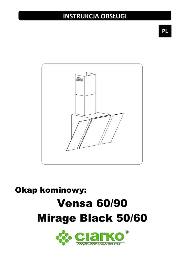 INSTRUKCJA OBSŁUGI PL Okap kominowy: Vensa 60/90 Mirage Black 50/60 Szanowni Państwo Staliście się Państwo użytkownikami najnowszej generacji okapu kuchennego typu Vensa/Mirage Black. Okap ten został zaprojektowany i wykonany specjalnie z myślą o spełnieniu Państwa oczekiwań i z pewnością będzie stanowić część nowocześnie wyposażonej kuchni. Zastosowane w nim nowoczesne rozwiązania konstrukcyjne i użycie najnowszej technologii produkcji, zapewniają mu wysoką funkcjonalność i estetykę. Przed przystąpieniem do montażu okapu prosimy o dokładne zapoznanie się z treścią niniejszej instrukcji. Dzięki temu unikną Państwo błędnej instalacji i obsługi okapu. Życzymy satysfakcji i zadowolenia z wyboru okapu naszej firmy. Uwaga: Producent nie przyjmuje na siebie żadnej odpowiedzialności za uszkodzenia powstałe wskutek montażu i użytkowania niezgodnego z instrukcją obsługi! SPIS TREŚCI I Charakterystyka II Wyposażenie III Dane techniczne IV Warunki eksploatacji V Montaż 1. Montaż wieszaka ściennego 2. Montaż okapu 3. Podłączenie do sieci elektrycznej i kontrola działania 4. Ustawienie trybu pracy okapu nadkuchennego 4.1. Ustawienie wyciągowego trybu pracy okapu 4.2 Ustawienie trybu pracy okapu jako pochłaniacza zapachów 4.3. Prędkości wentylatora VI Obsługa i konserwacja 1. Bezpieczeństwo użytkowania 2.Obsługa 2.1. Panel sterowania 2.2. Funkcja programu 3. Konserwacja 3.1. Metalowe filtry przeciwtłuszczowe 3.2. Filtr węglowy 3.3. Oświetlenie 3.4. Czyszczenie I Charakterystyka Okap kuchenny Vensa/Mirage Black służy do usuwania oparów kuchennych. Wymaga on zainstalowania przewodu odprowadzającego powietrze na zewnątrz. Długość przewodu (najczęściej rura Ø 150 lub 120mm) nie powinna być dłuższa niż 4-5 m. Po zainstalowaniu filtra z węglem aktywnym okap może pracować jako pochłaniacz zapachów. W tym przypadku nie wymaga się instalowania przewodu odprowadzającego powietrze na zewnątrz, zaleca się natomiast montaż kierownicy wydmuchu powietrza. Okap kuchenny jest urządzeniem elektrycznym wykonanym w I klasie ochrony przeciwporażeniowej. Posiada niezależne oświetlenie oraz wentylator wyciągowy z możliwością ustawienia jednej z czterech prędkości obrotowych. Okap jest przeznaczony do trwałego zamocowania na suficie, ponad kuchenką gazową lub elektryczną. II Wyposażenie Okap jest złożony z następujących elementów (Rys. 1): 1. 2. 3. 4. Maskownicy ozdobnej złożonej z: komina górnego E i komina dolnego D, Korpusu okapu C,A, Otwieranego elementu w okapie B, Zestawu kołków montażowych. III Dane techniczne Typ okapu Black Pearl Wyspa AC 230V ~50Hz 1 Diody 2x1W 1 4 60/90 / 50/60 37,5 118-149 150 Max 700 242 Max. 52 Cechy charakterystyczne Napięcie zasilania Silnik wentylatora Oświetlenie Ilość filtrów tłuszczowych Stopnie prędkości Szerokość [cm] Głębokość [cm] Wysokość [cm] Wylot [ø mm] Wydajność [m 3/h] Pobór mocy [W] Głośność [dBA] Waga netto Rodzaj pracy Kolor Wyciąg lub pochłaniacz INOX/Czarny IV Warunki eksploatacji 1. Okap kuchenny, służy do usuwania oparów kuchennych na zewnątrz, należy podłączyć go do odpowiedniego kanału wentylacyjnego (nie podłączać do kanałów kominowych, dymowych lub spalinowych, będących w eksploatacji). 2. Urządzenie należy zamontować na wysokości, co najmniej 450 mm od płyty kuchennej. 3. Pod okapem kuchennym nie wolno pozostawiać odkrytego płomienia, podczas zdejmowania naczyń znad palnika, należy ustawić minimalny płomień. 4. Potrawy przygotowywane na tłuszczach powinny być stale nadzorowane, gdyż przegrzany tłuszcz może się łatwo zapalić. 5. Filtr przeciw tłuszczowy do okapu kuchennego należy czyścić, co najmniej, co 2 miesiące, gdyż nasycony tłuszczem jest łatwopalny. 6. Przed każdą operacją czyszczenia, wymianą filtra lub przed podjęciem prac naprawczych, należy wyjąć wtyczkę urządzenia z gniazdka. 7. Jeżeli w pomieszczeniu, oprócz okapu, eksploatuje się inne urządzenia o zasilaniu nieelektrycznym (np. piece na paliwa ciekłe, grzejniki przepływowe, termy), należy zadbać o wystarczającą wentylację (dopływ powietrza). Bezpieczna eksploatacja jest możliwa, gdy przy jednoczesnej pracy okapu i urządzeń spalających, zależnych od powietrza w pomieszczeniu, w miejscu ustawienia tych urządzeń panuje podciśnienie najwyżej 0,004 milibara (ten punkt nie obowiązuje, gdy okap kuchenny jest użytkowany jako pochłaniacz zapachów). 8. Przy podłączeniu do sieci 230 V wymagane jest podłączenie do sprawnego gniazda elektrycznego. 9. Jeżeli przewód zasilający ulegnie uszkodzeniu, to powinien być wymieniony w specjalistycznym zakładzie naprawczym. 10.Urządzenie na czas transportu zostało zabezpieczone przed uszkodzeniem. Po rozpakowaniu urządzenia prosimy Państwa o usunięcie elementów opakowania w sposób niezagrażający środowisku. Wszystkie materiały zastosowane do opakowania są nieszkodliwe dla środowiska naturalnego, w 100% nadają się do odzysku i oznakowano je odpowiednim symbolem . Uwaga! Materiały opakowaniowe (woreczki polietylenowe, kawałki styropianu itp.) należy w trakcie rozpakowywania trzymać z dala od dzieci. 11. Niniejszy sprzęt nie jest przeznaczony do użytkowania przez osoby (w tym dzieci) o ograniczonej zdolności fizycznej, czuciowej lub psychicznej, lub osoby o braku doświadczenia lub znajomości sprzętu, chyba że odbywa się to pod nadzorem lub zgodnie z instrukcją użytkowania sprzętu, przekazanej przez osoby odpowiadające za ich bezpieczeństwo. Należy zwracać uwagę na dzieci, aby nie bawiły się okapem. V Montaż 1.Montaż okapu W celu zamontowania okapu należy wykonać następujące czynności: 1. Na odpowiedniej wysokości wywiercić otwory w ścianie F. 2. Zawiesić korpus okapu C na kołkach G. 3. Na odpowiedniej wysokości zamontować wieszak ścienny J. 4. Podłączyć okap do przewodu wentylacyjnego. 5. Podłąc