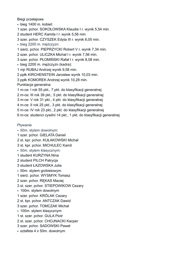 Biegi przełajowe • bieg 1400 m. kobiet: 1 szer. pchor. SOKOŁOWSKA Klaudia I r. wynik 5,54 min. 2 student HERC Kamila I r. wynik 5,56 min. 3 szer. pchor. CZYSZEK Edyta III r. wynik 6,05 min. • bieg 2200 m. mężczyzn: 1 sierż. pchor. PIEPRZYCKI Robert V r. wynik 7,34 min. 2 szer. pchor. ULICZKA Michał I r. wynik 7,56 min. 3 szer. pchor. PŁOMIŃSKI Rafał I r. wynik 8,08 min. • bieg 2200 m. mężczyzn (kadra): 1 mjr RUBAJ Andrzej wynik 9,58 min. 2 ppłk KIRCHENSTEIN Jarosław wynik 10,03 min. 3 ppłk KOMOREK Andrzej wynik 10,28 min. Punktacja generalna: 1 m-ce: I rok 55 pkt., 7 pkt. do klasyfikacji generalnej 2 m-ce: III rok 39 pkt., 5 pkt. do klasyfikacji generalnej 3 m-ce: V rok 31 pkt., 4 pkt. do klasyfikacji generalnej 4 m-ce: II rok 25 pkt., 3 pkt. do klasyfikacji generalnej 5 m-ce: IV rok 23 pkt., 2 pkt. do klasyfikacji generalnej 6 m-ce: studenci cywilni 14 pkt., 1 pkt. do klasyfikacji generalnej Pływanie • 50m. stylem dowolnym: 1 szer. pchor. GIELATA Daniel 2 st. kpr. pchor. KUŁAKOWSKI Michał 3 st. kpr. pchor. MICHULEC Kamil • 50m. stylem klasycznym: 1 student KURZYNA Nina 2 student PILCH Patrycja 3 student ŁAZOWSKA Julia • 50m. stylem grzbietowym 1 sierż. pchor. WYSMYK Tomasz 2 szer. pchor. RĘKAS Maciej 3 st. szer. pchor. STIEPOWIKOW Cezary • 100m. stylem dowolnym 1 szer. pchor. KRÓLAK Cezary 2 st. kpr. pchor. ANTCZAK Dawid 3 szer. pchor. TOMCZAK Michał • 100m. stylem klasycznym 1 st. szer. pchor. GULA Piotr 2 st. szer. pchor. CHOJNACKI Kacper 3 szer. pchor. SADOWSKI Paweł • sztafeta 4 x 50m. dowolnym 1 I ROK 2 II ROK 3 III ROK Punktacja generalna: 1 m-ce: I rok 73 pkt., 7 pkt. do klasyfikacji generalnej 2 m-ce: II rok 69 pkt., 5 pkt. do klasyfikacji generalnej 3 m-ce: III rok 54 pkt., 4 pkt. do klasyfikacji generalnej 4 m-ce: studenci cywilni 49 pkt., 3 pkt. do klasyfikacji generalnej 5 m-ce: V rok 13 pkt., 2 pkt. do klasyfikacji generalne